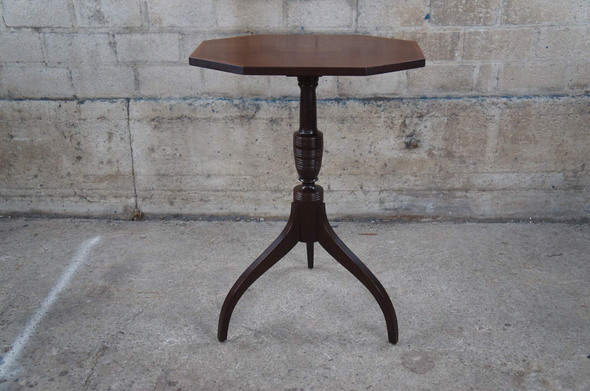 Biggs Furniture Old Sturbridge Village Collection Federal Candle or Sculpture Stand, circa last half 20th century. Made from mahogany with an Octagonal inlaid and crossbanded top over turned and ribbed center support leading to spider leg base. Table is marked along underside.