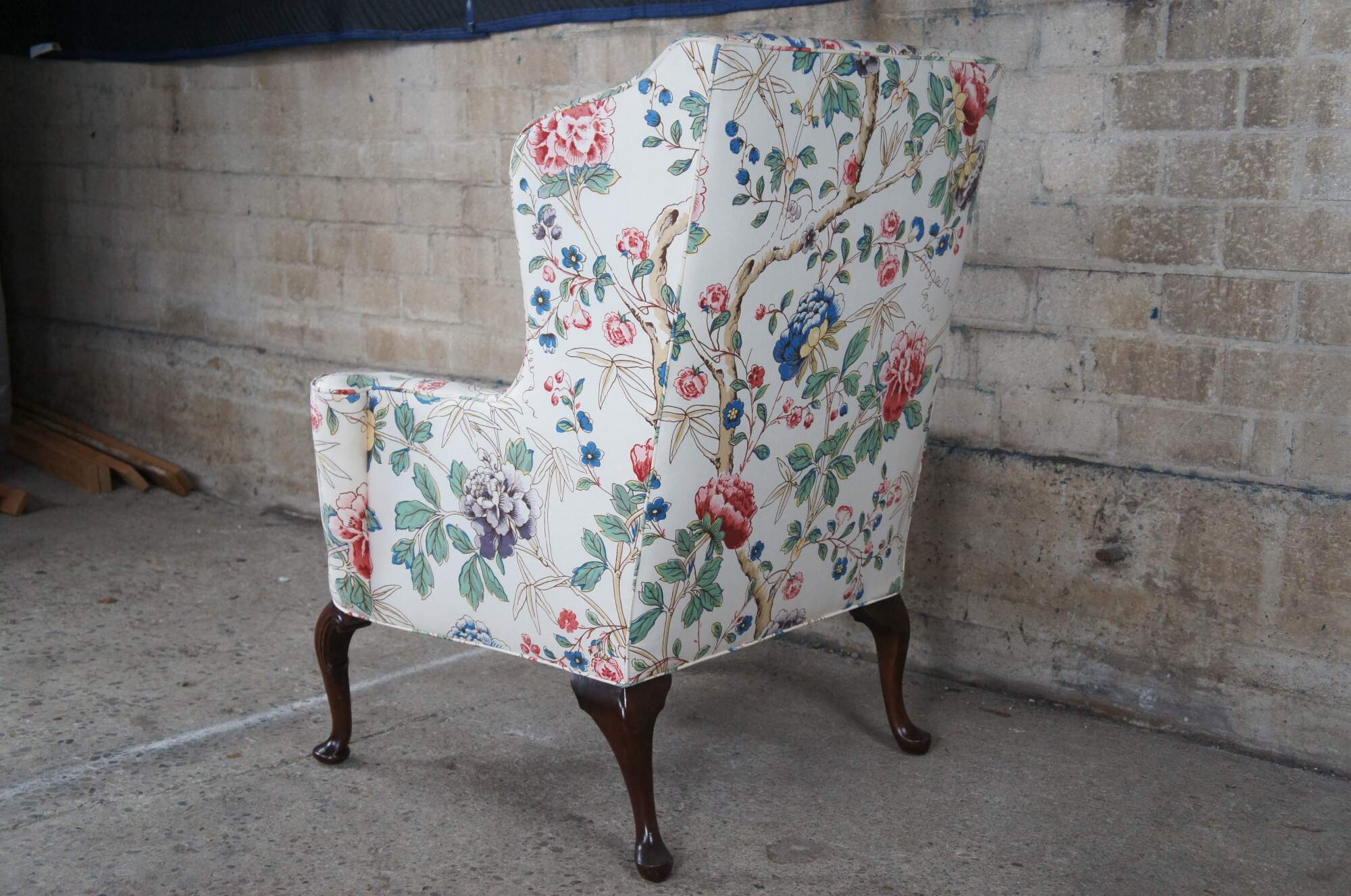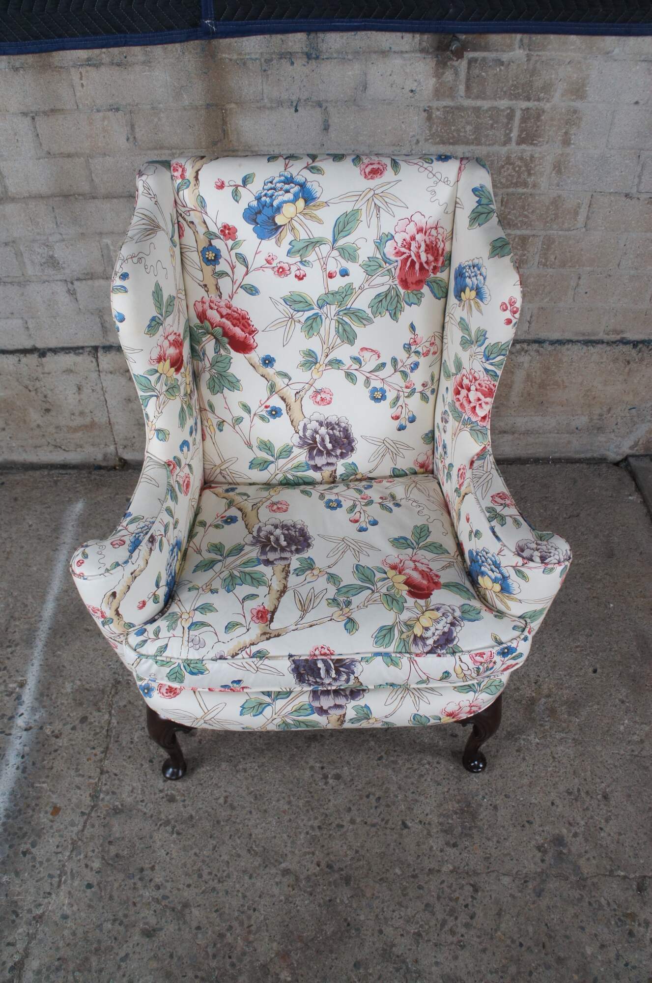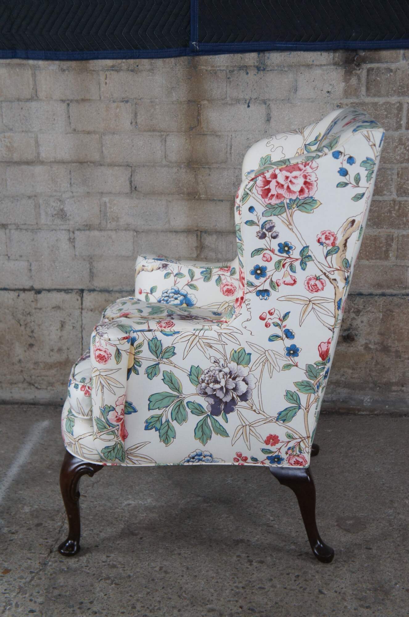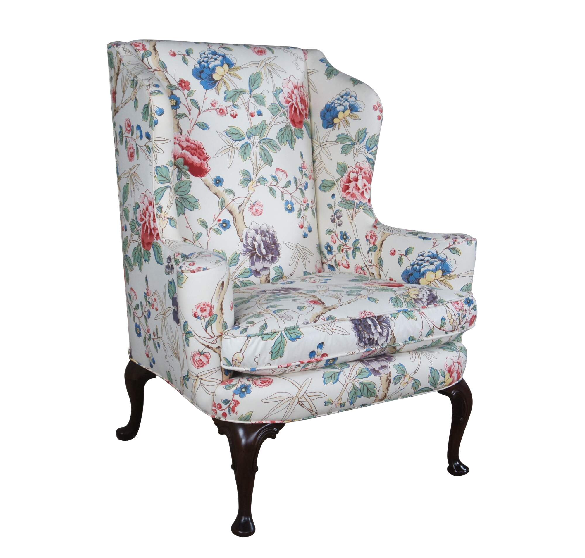 A beautiful Queen Anne style wing chair by Biggs Furniture, circa last half 20th century. Made from mahogany with a highback and scrolled and flared arms. The chair is supported by downswept cabriole legs leading to pad feet. The floral fabric is blooming in color and includes a down seat. Originally Purchased from William W. Sauer Associates Ltd. in Virginia Beach, Virginia in 1997
