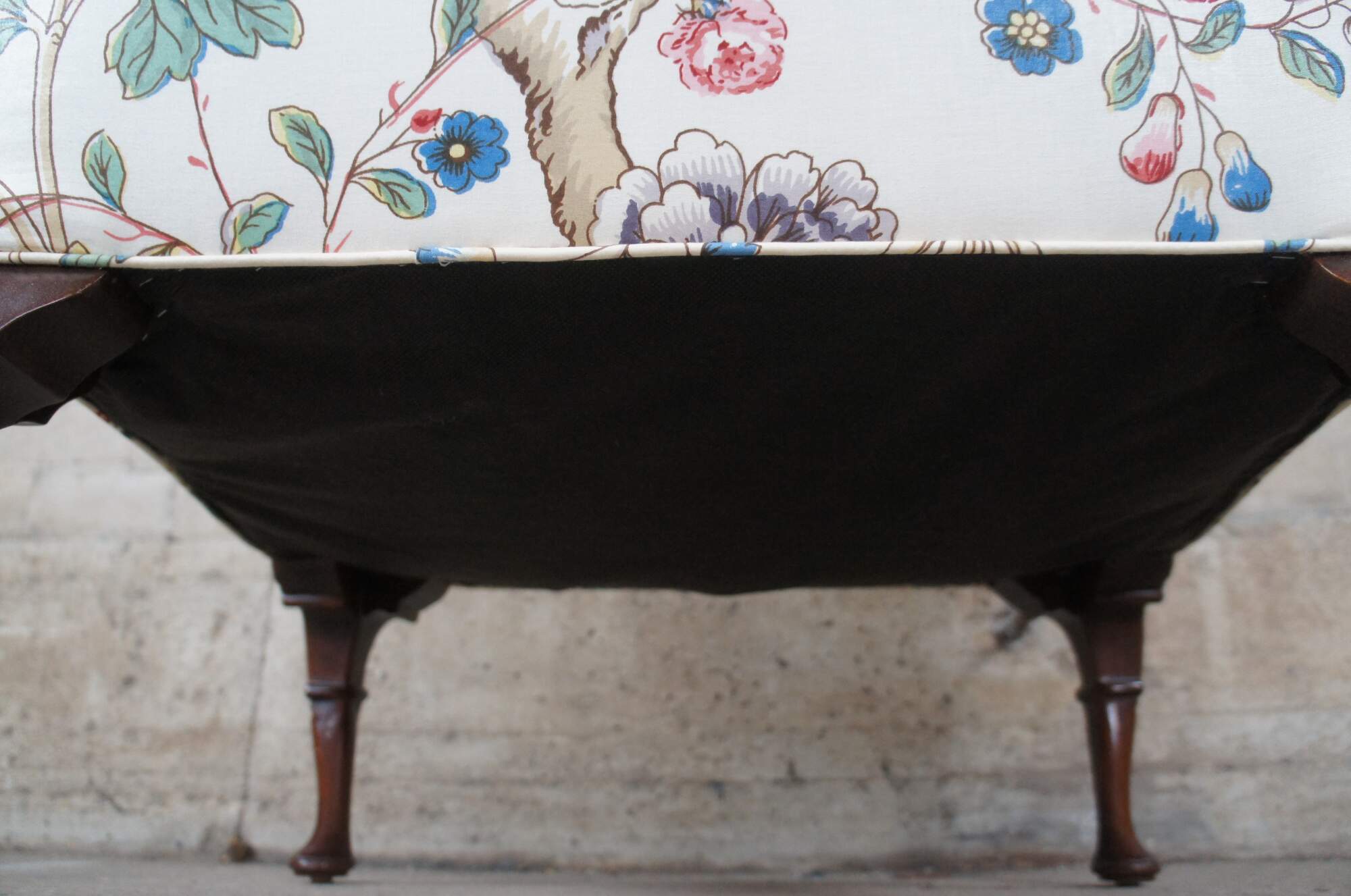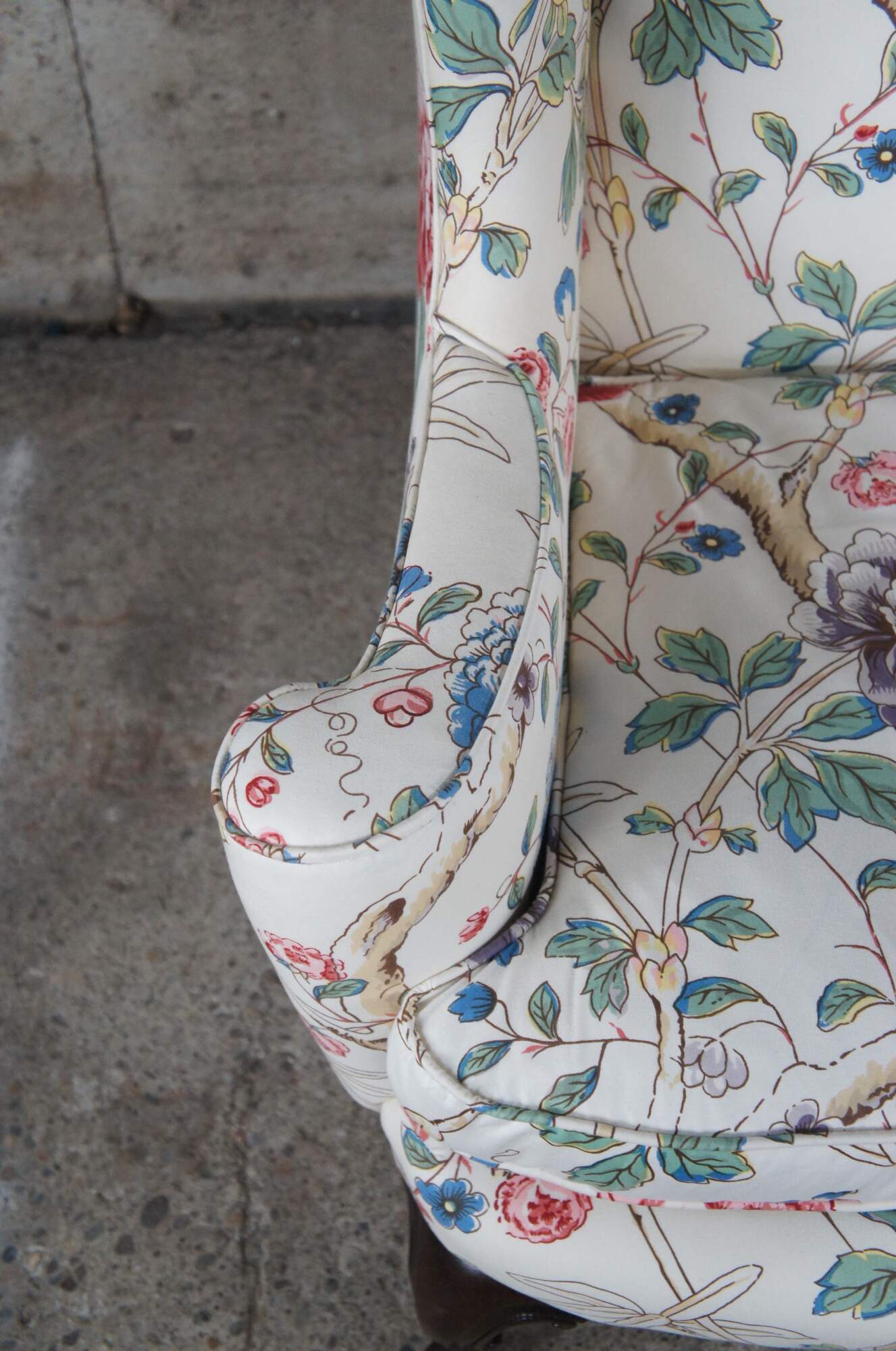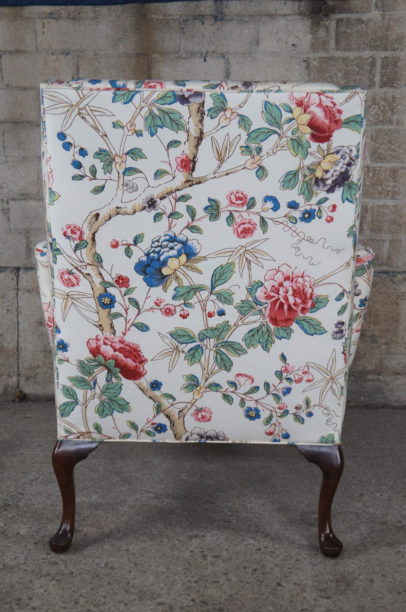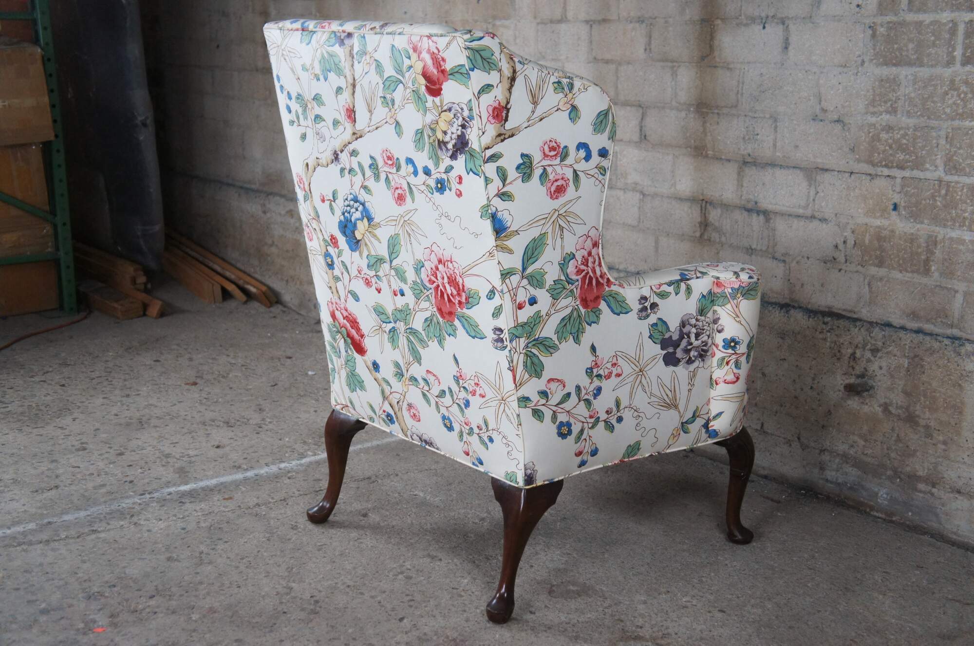 A beautiful Queen Anne style wing chair by Biggs Furniture, circa last half 20th century. Made from mahogany with a highback and scrolled and flared arms. The chair is supported by downswept cabriole legs leading to pad feet. The floral fabric is blooming in color and includes a down seat. Originally Purchased from William W. Sauer Associates Ltd. in Virginia Beach, Virginia in 1997
