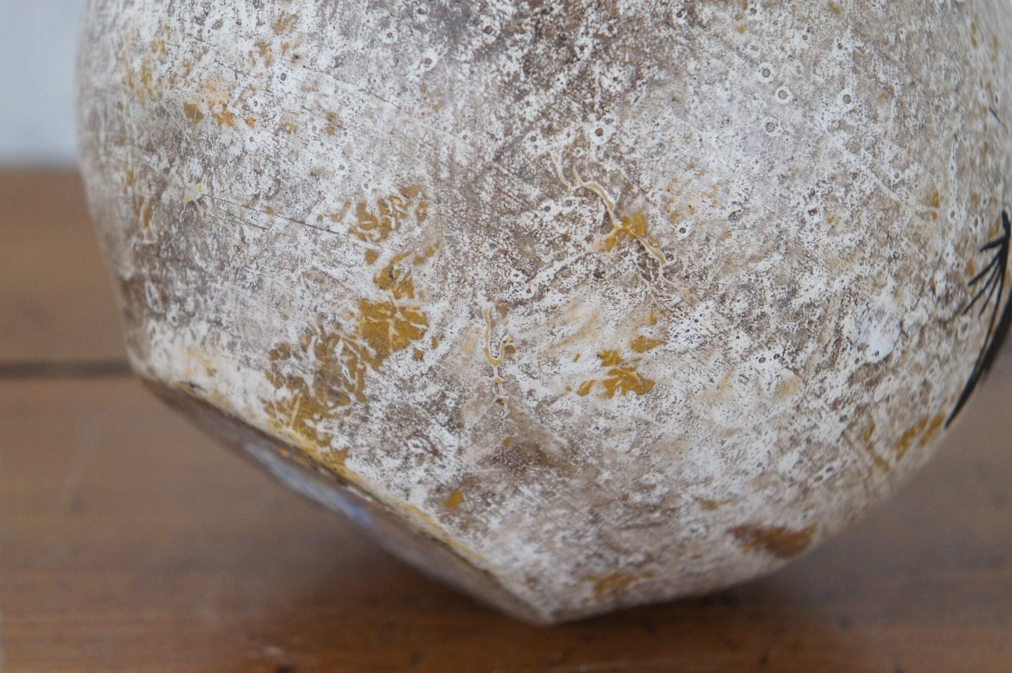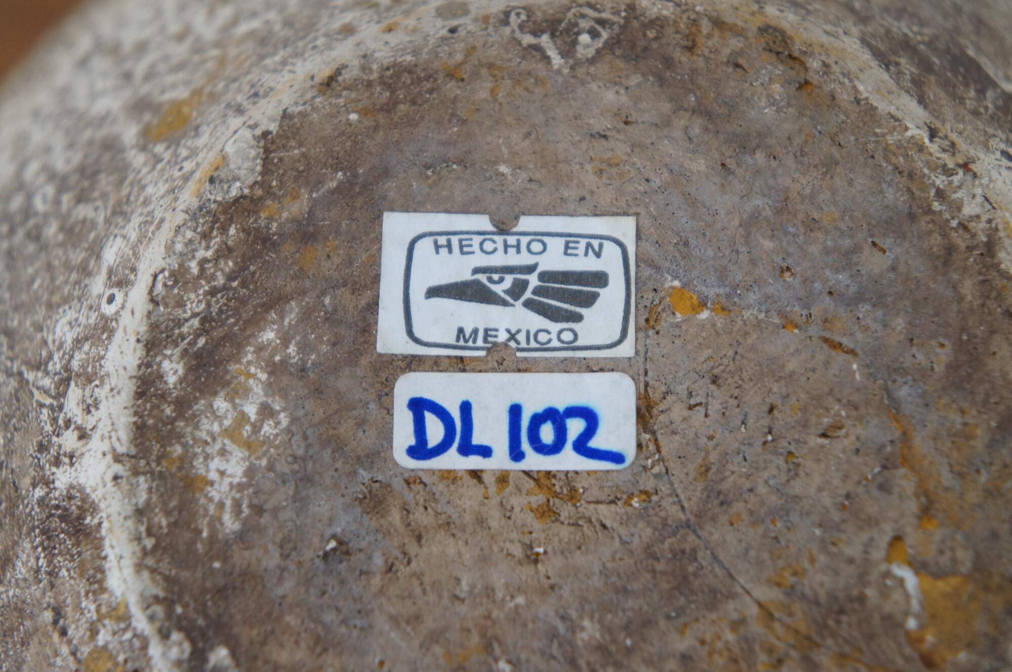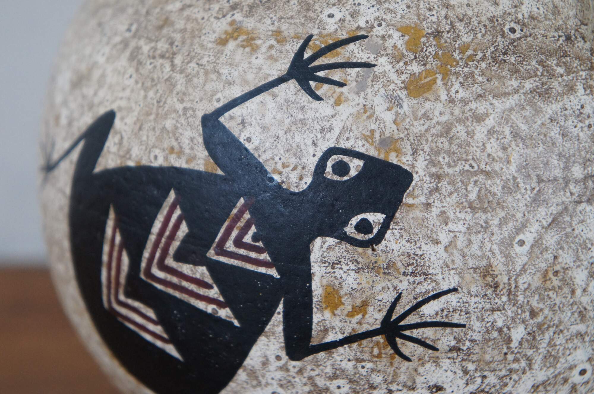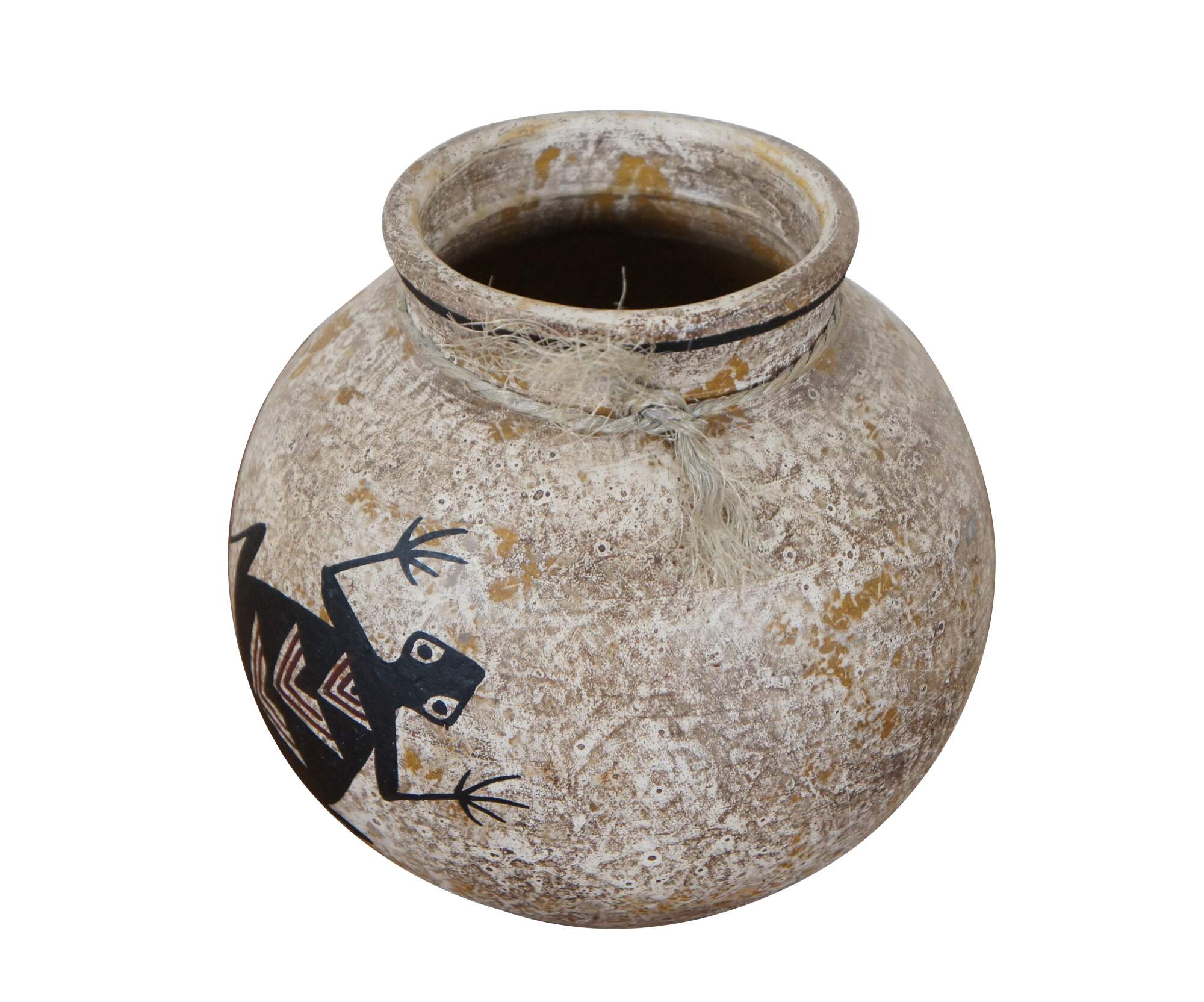 Vintage Mexican / Southwestern / Native folk art pottery pot or low, round vase in a mottled pale brown and decorated with a pair of black frogs with red chevrons on their backs. Hecho en Mexico (Made in Mexico). Hand written sticker on base marked DL 102, Pucano.