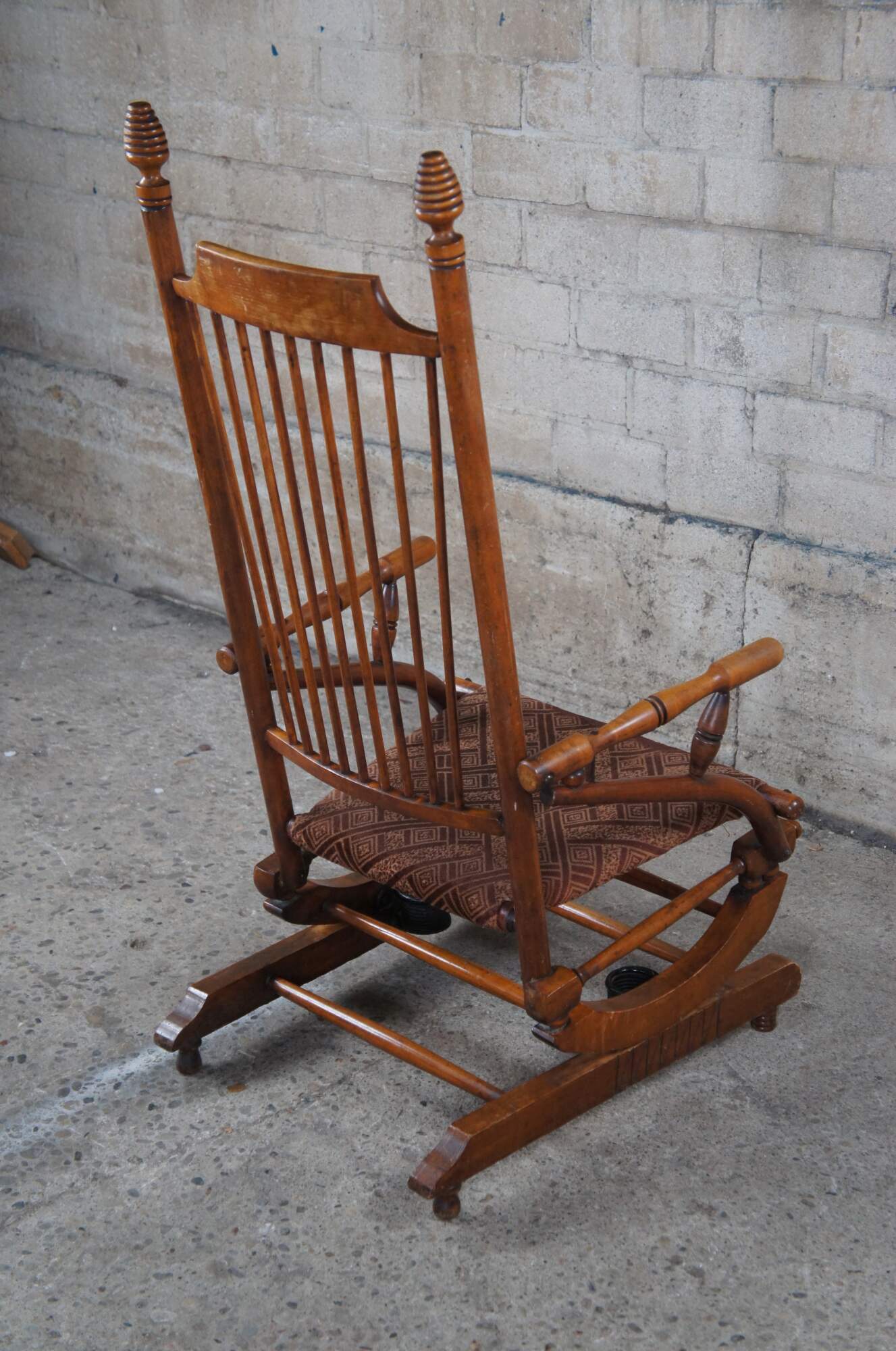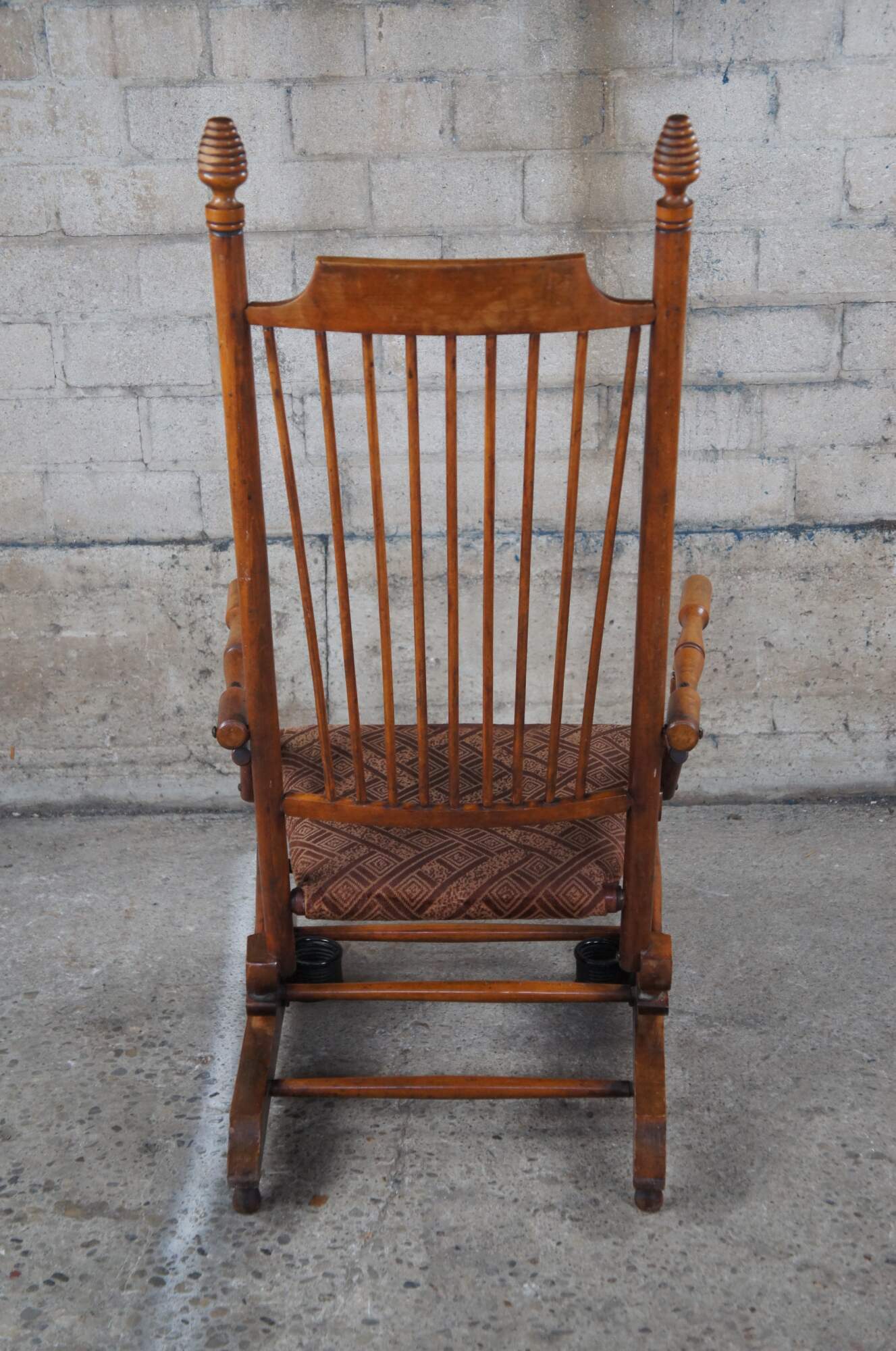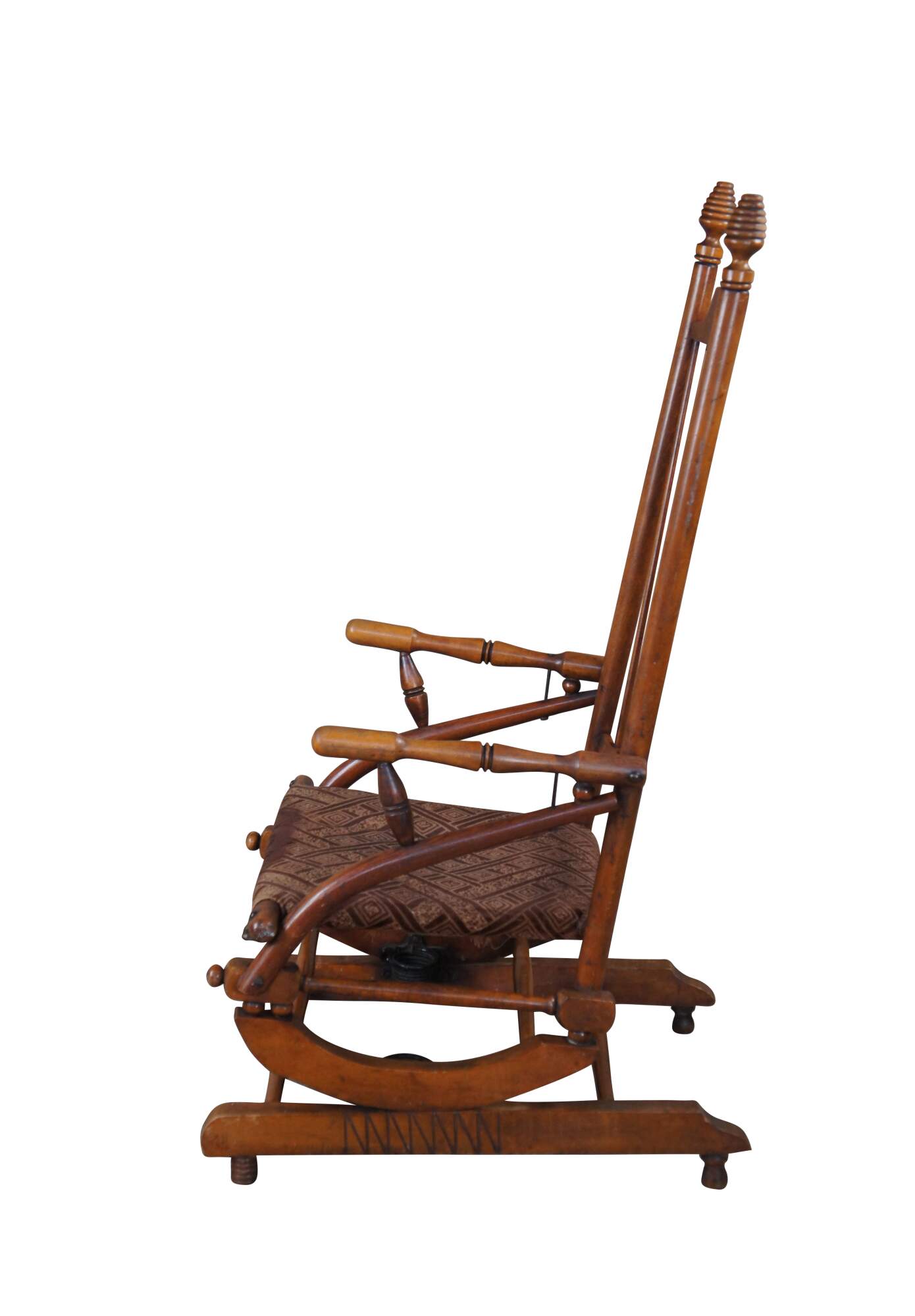 An intriguing Aesthetic Period platform rocking chair. Made from oak with a spindled back, ribbed and graduated (beehive) finials, bentwood and turned arms and a cloth seat.