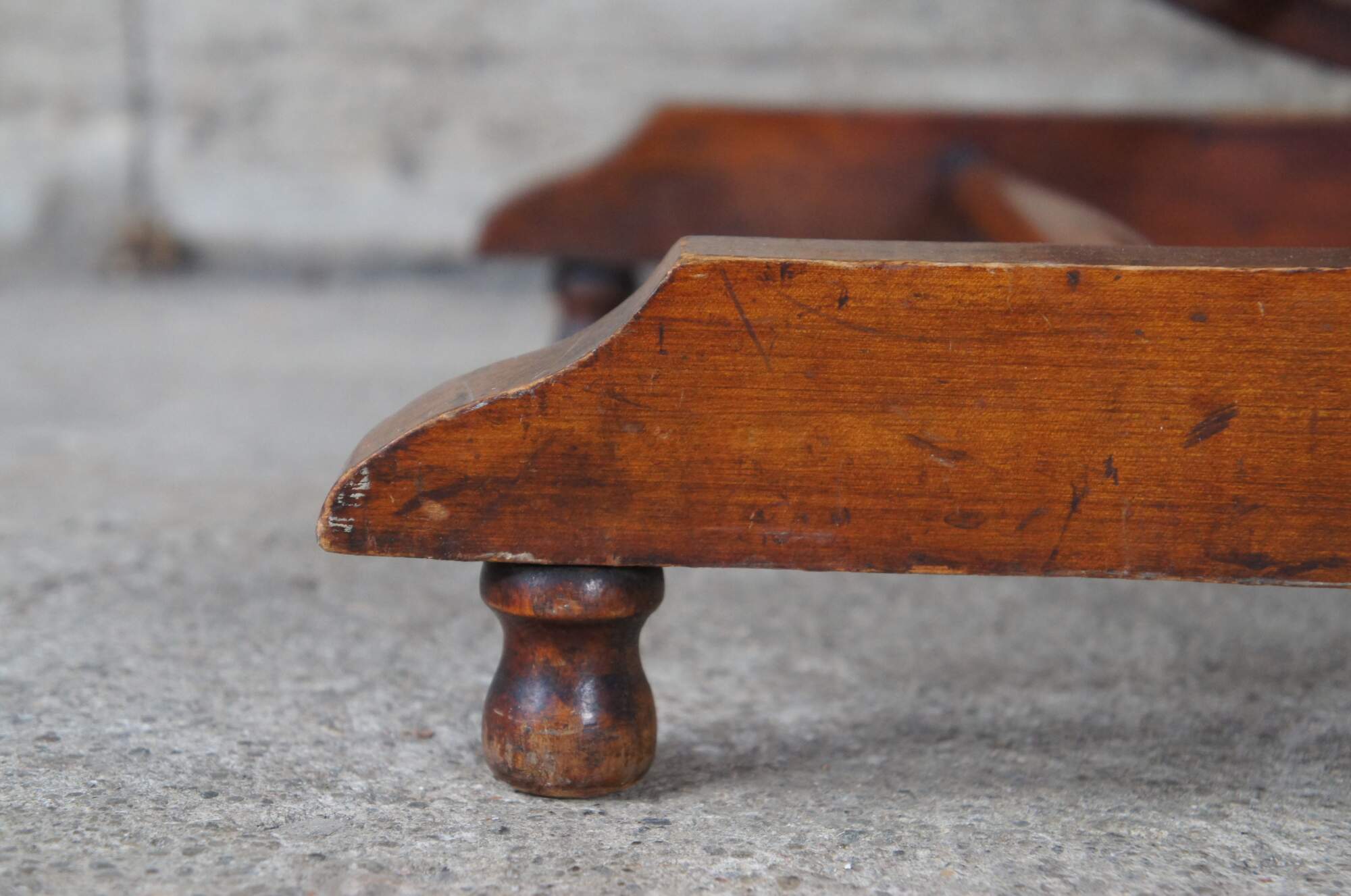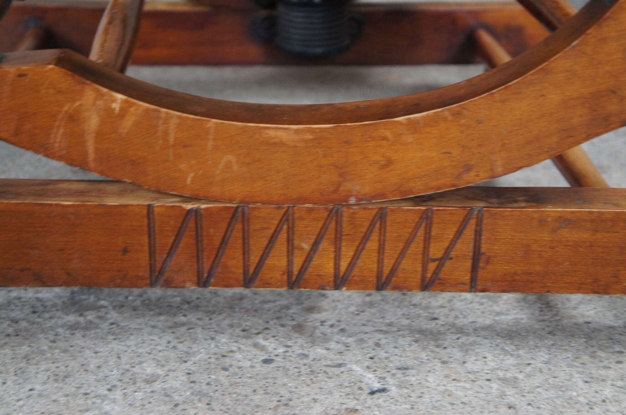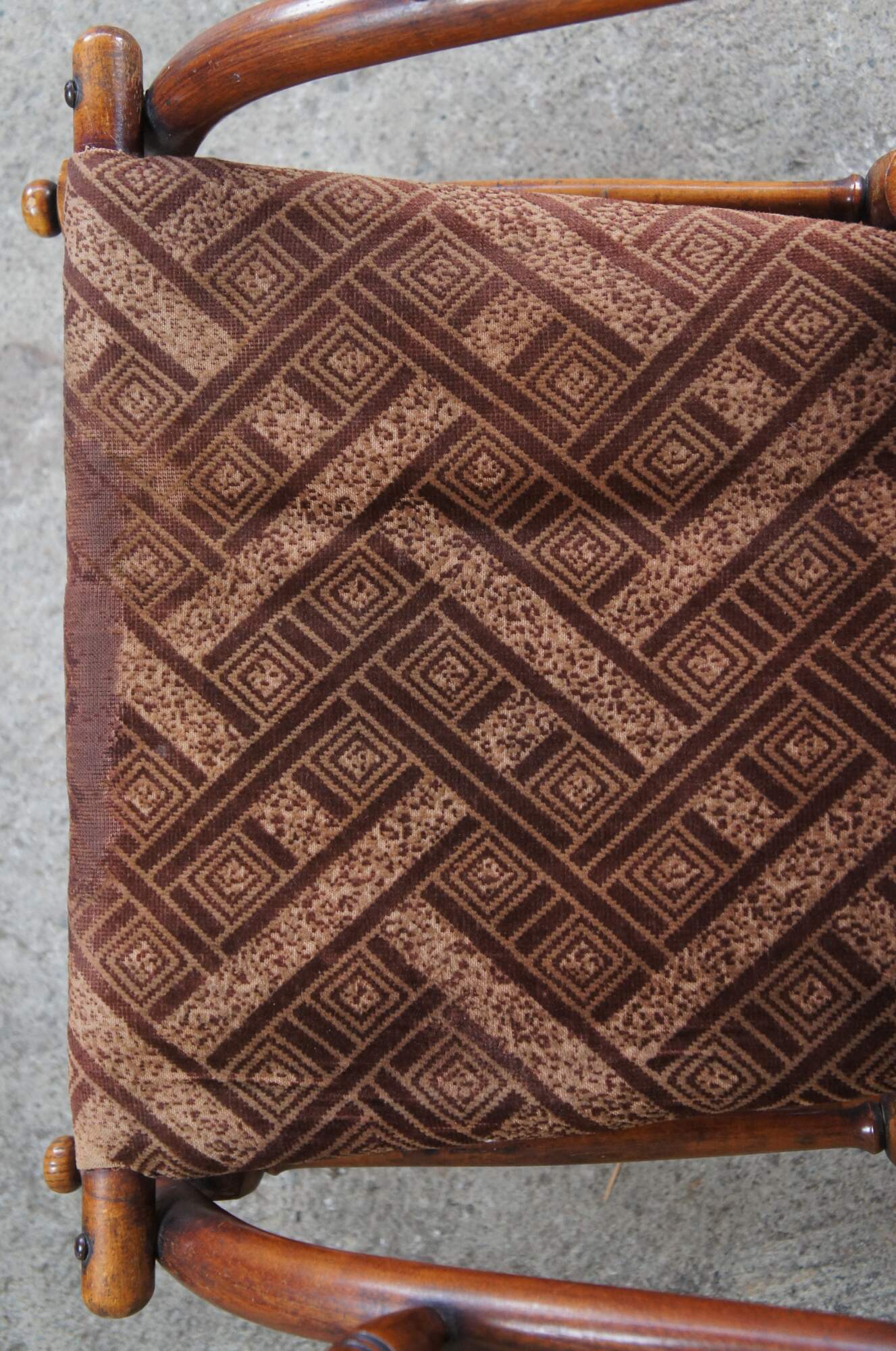 An intriguing Aesthetic Period platform rocking chair. Made from oak with a spindled back, ribbed and graduated (beehive) finials, bentwood and turned arms and a cloth seat.