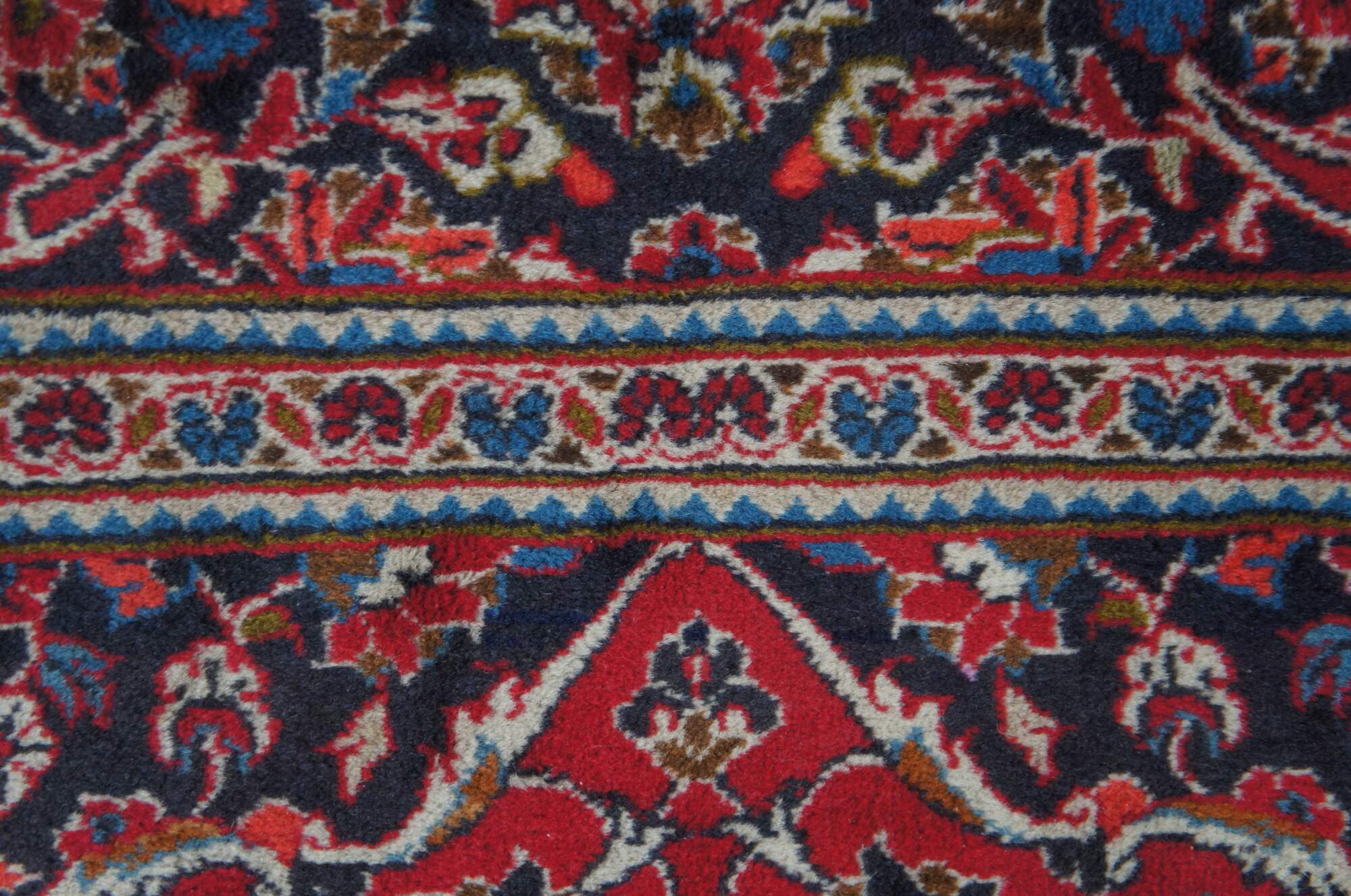 A beautiful red and blue hand knotted Persian Kashan Hand-Knotted wool area rug from the last halfof the 20th century. Features beautiful floral and geometric detail.