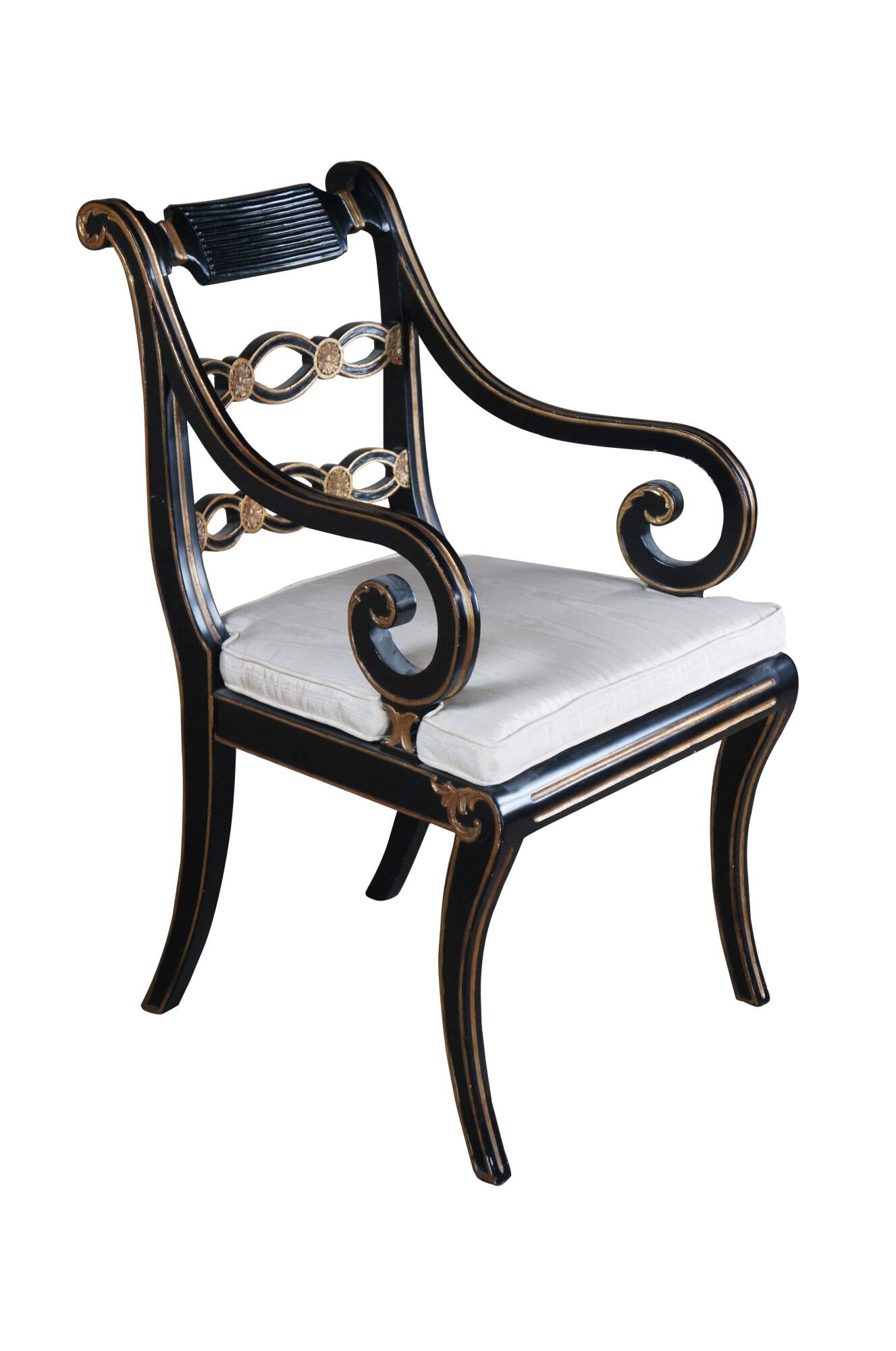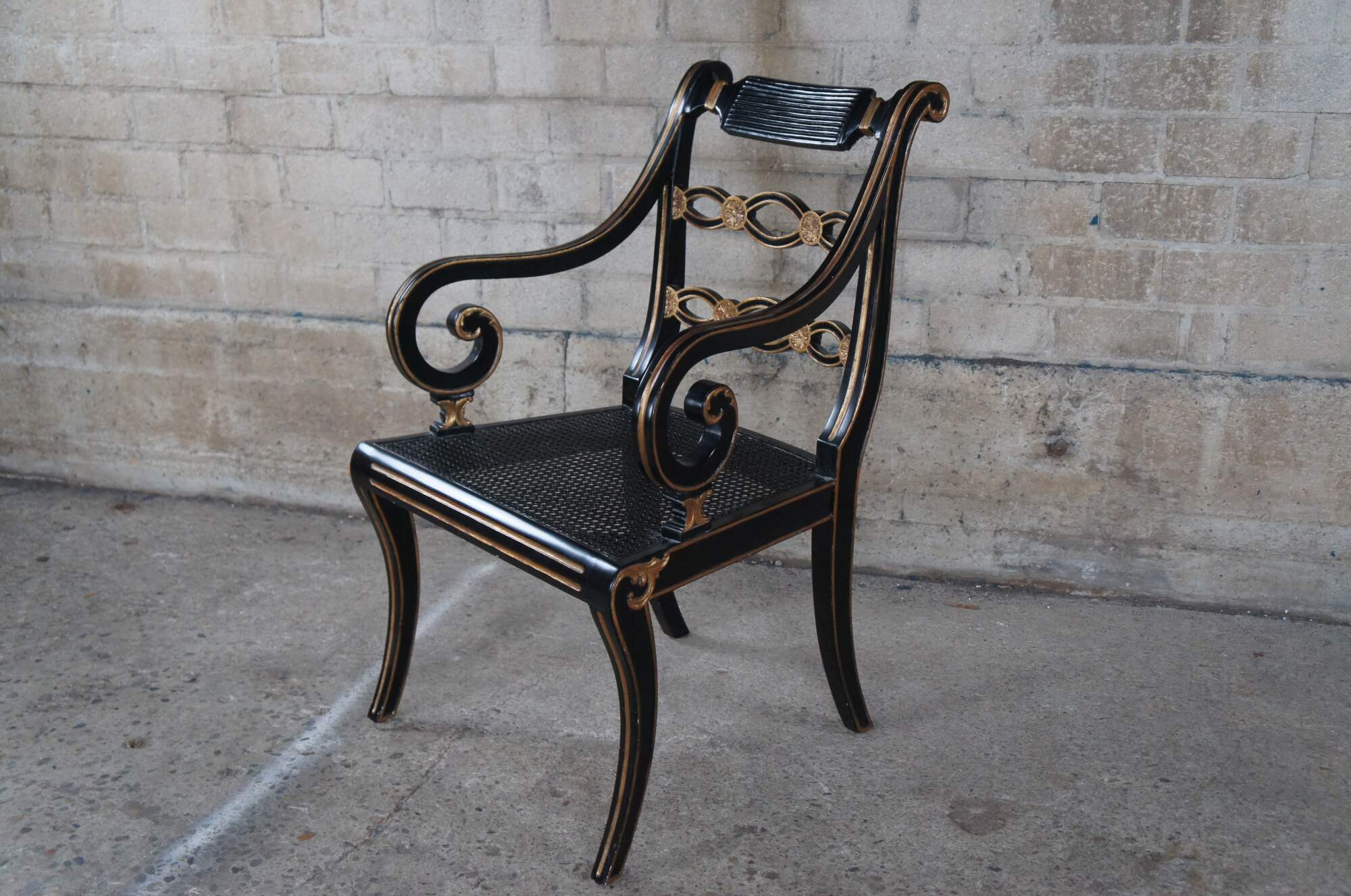 Vintage English Regency style pierced Riddle back armchair featuring ebonized black painted frame with gold accents, caned seat and scrolled arms.
