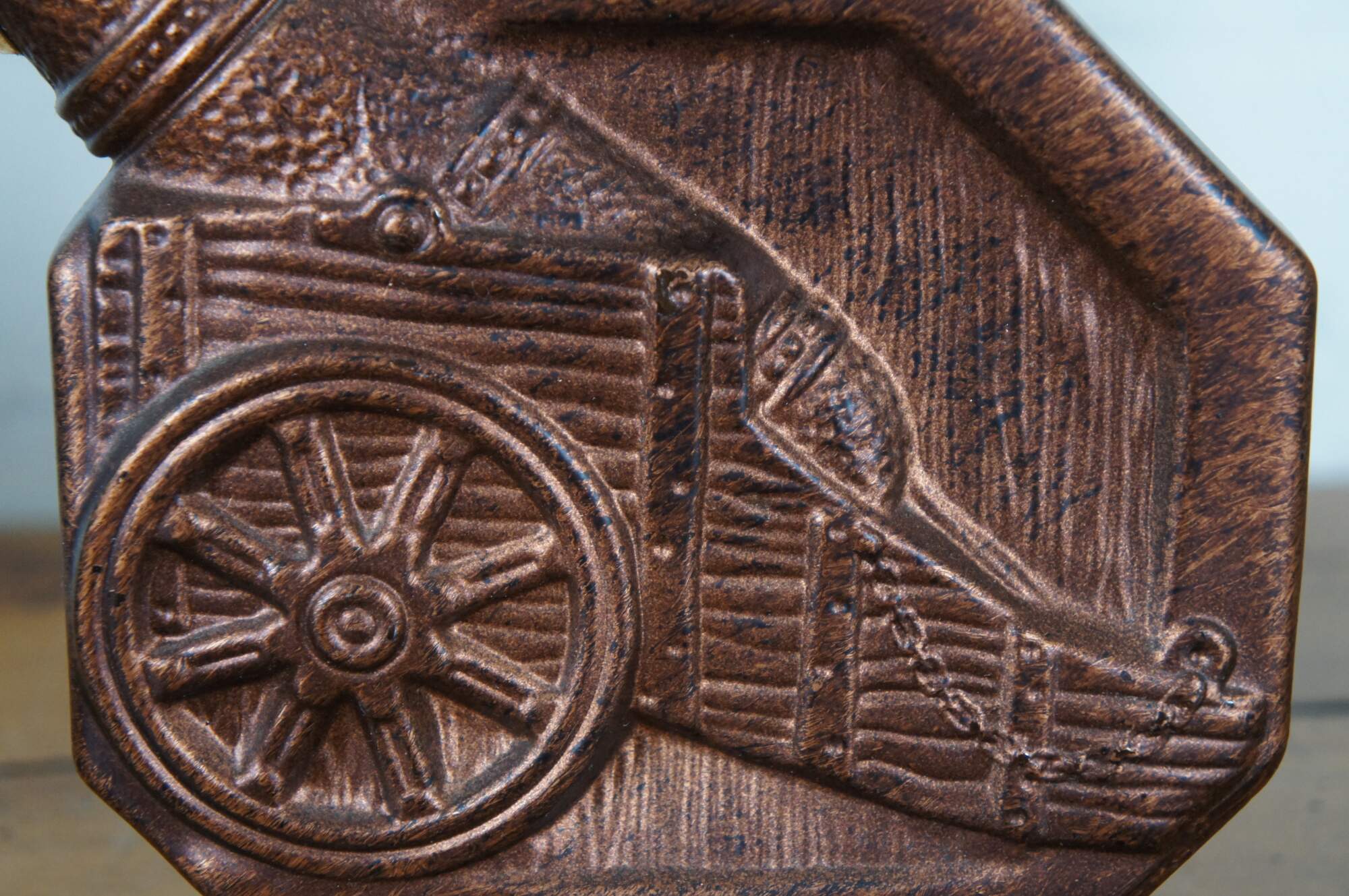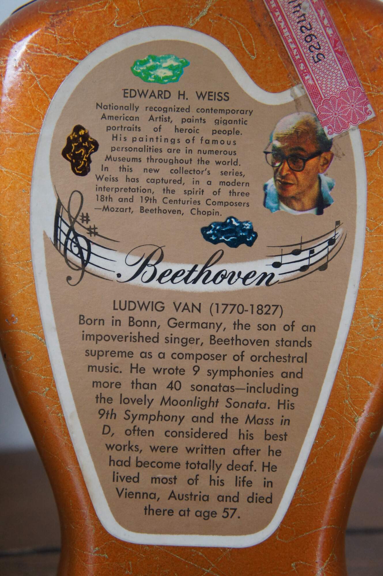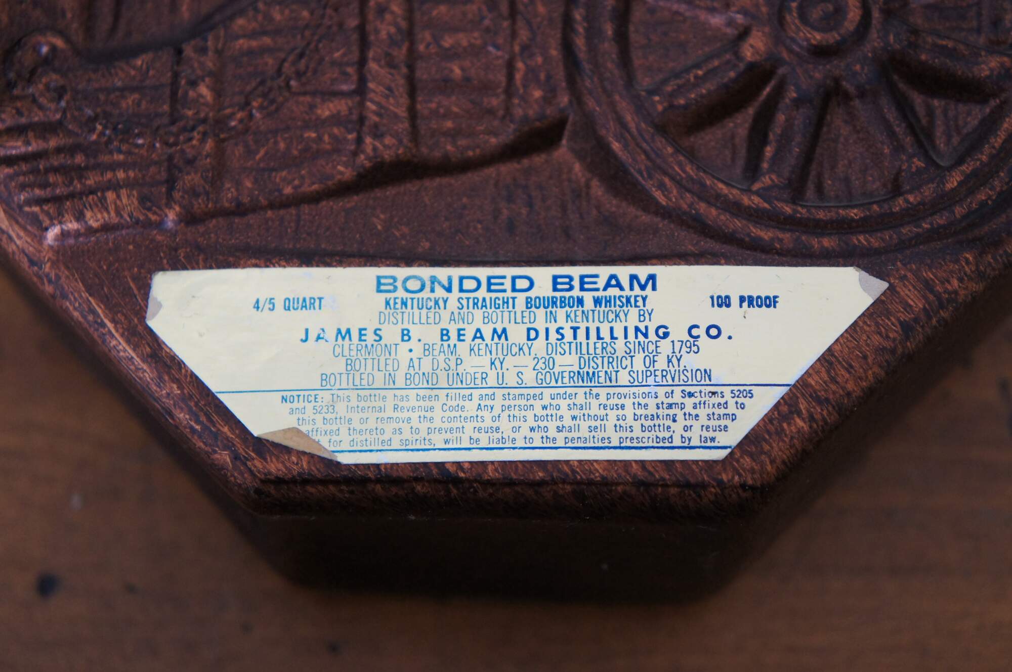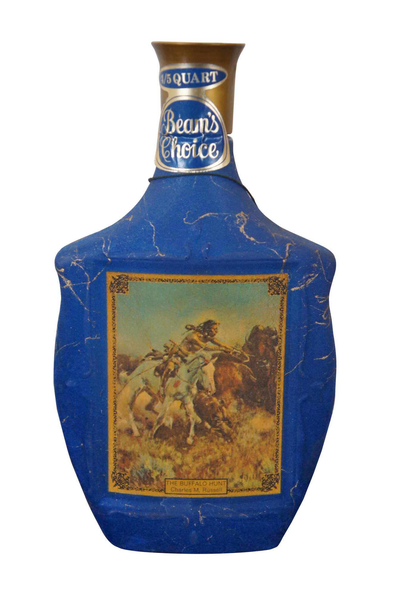 Lot of three vintage empty Jim Beam Whiskey collector’s bottles. Includes Beam’s Choice 8 Year blue velvet and gold splatter painted bottle featuring a print of The Buffalo Hunt by Charles M. Russell, Beam’s Choice 8 Year orange and gold splatter painted bottle featuring a portrait of Beethoven by Edward H. Weiss, and Bonded Beam 8 Year metallic bronze painted octagonal bottle molded with the image of a Revolutionary War era cannon.