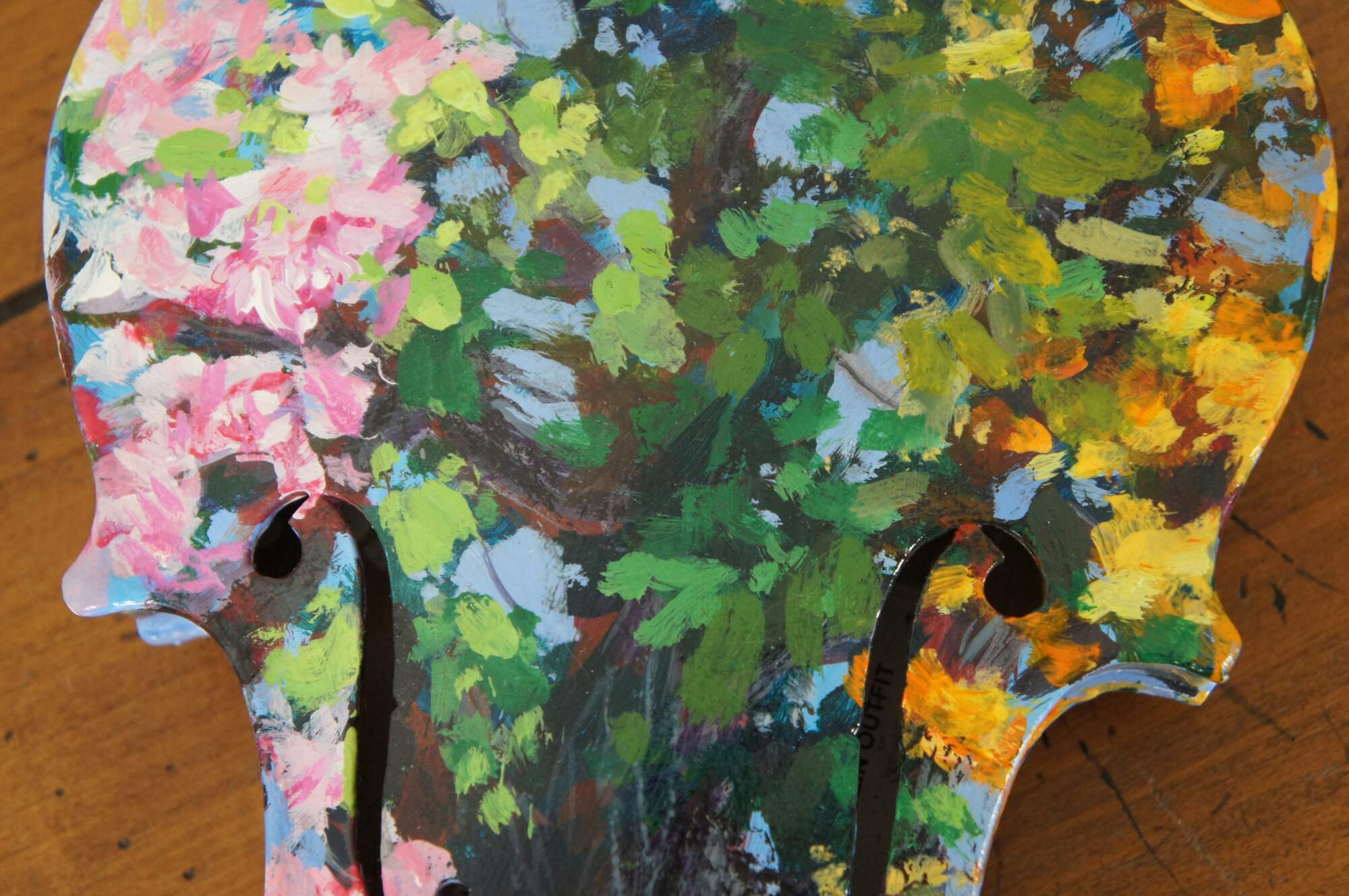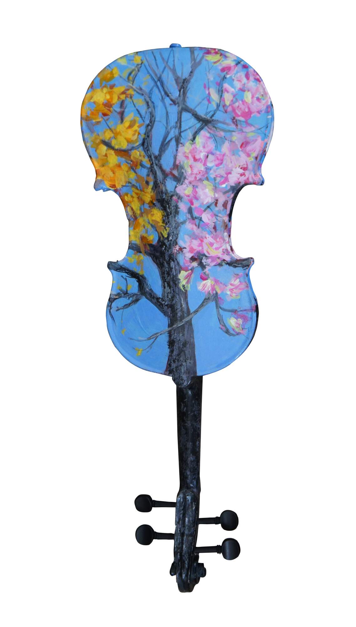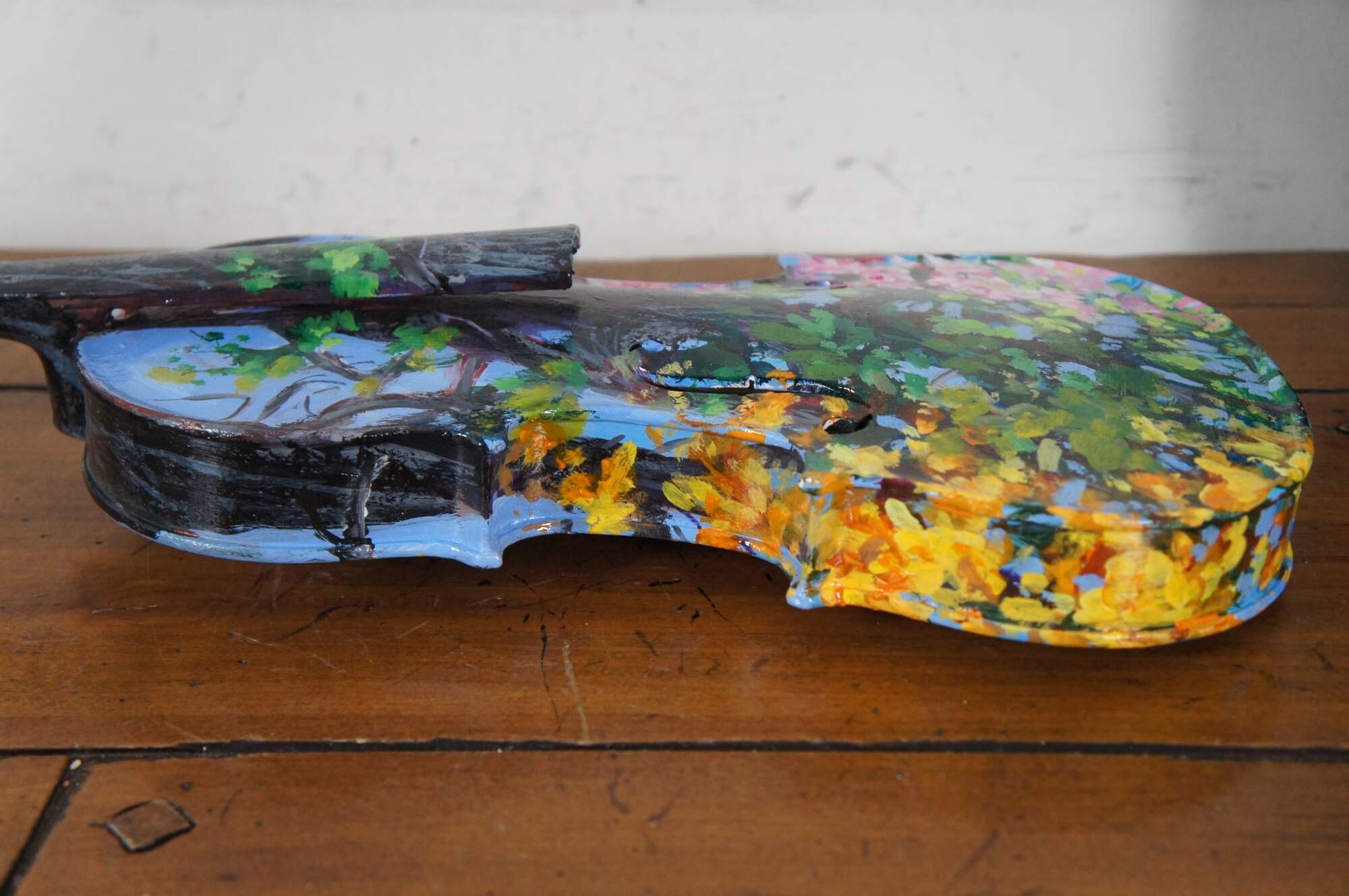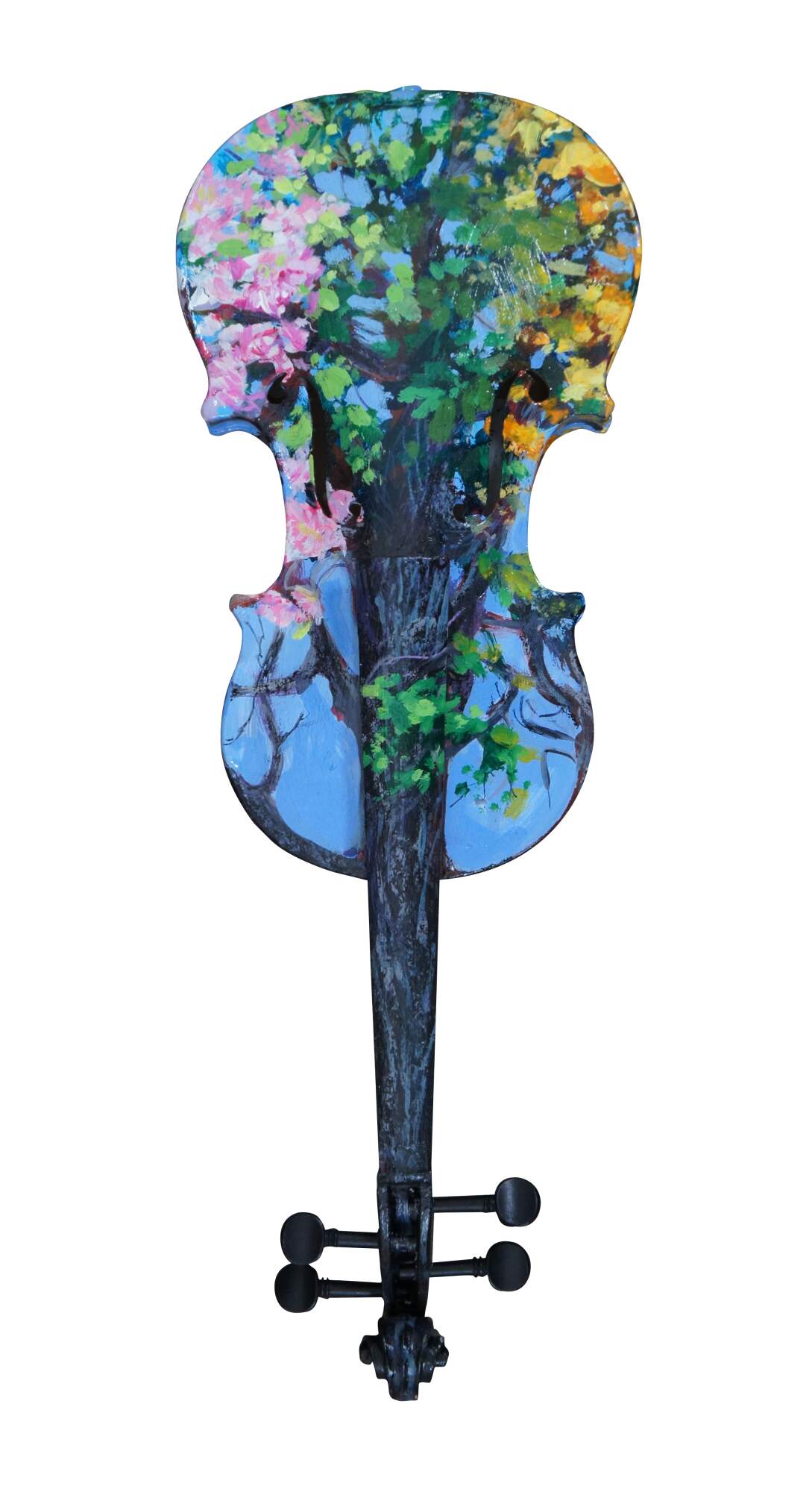 Three dimensional sculpture / mobile artwork by Susan Lucas titled “Four Seasons.” All sides of a re-purposed violin act as the canvas for an Impressionist style tree as it passes through the four seasons – the pink blossoms of spring, the deep green foliage of summer, the orange and yellow leaves of autumn, and the bare branches of winter. Signed on the side to the right of the neck. Originally displayed suspended from fishing line tied to the peg one the body end of the instrument. Includes new looking soft shell case.