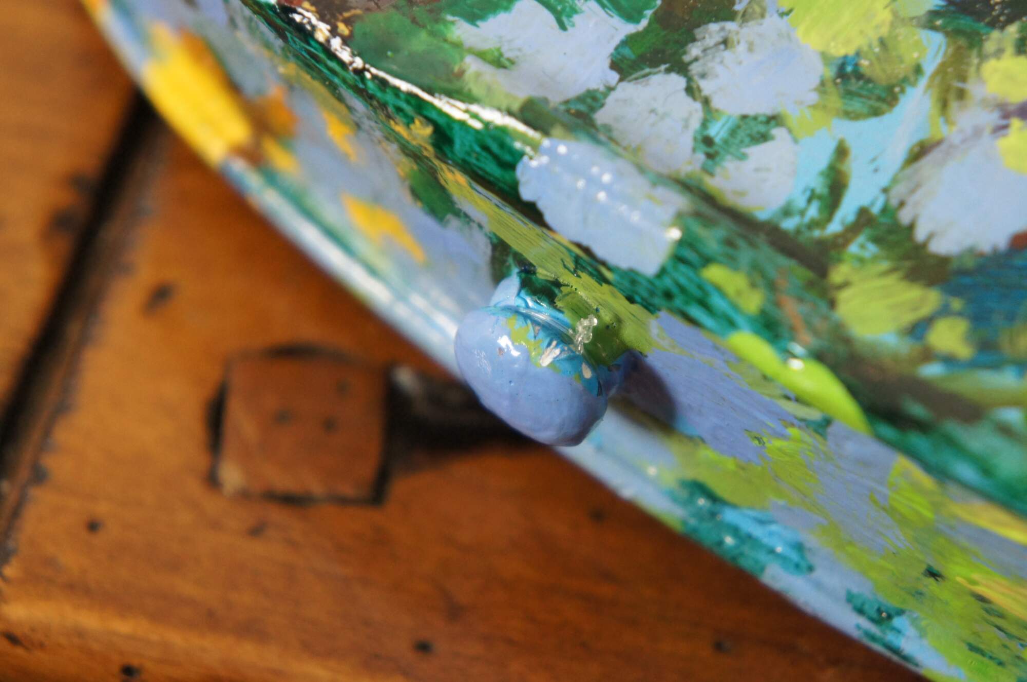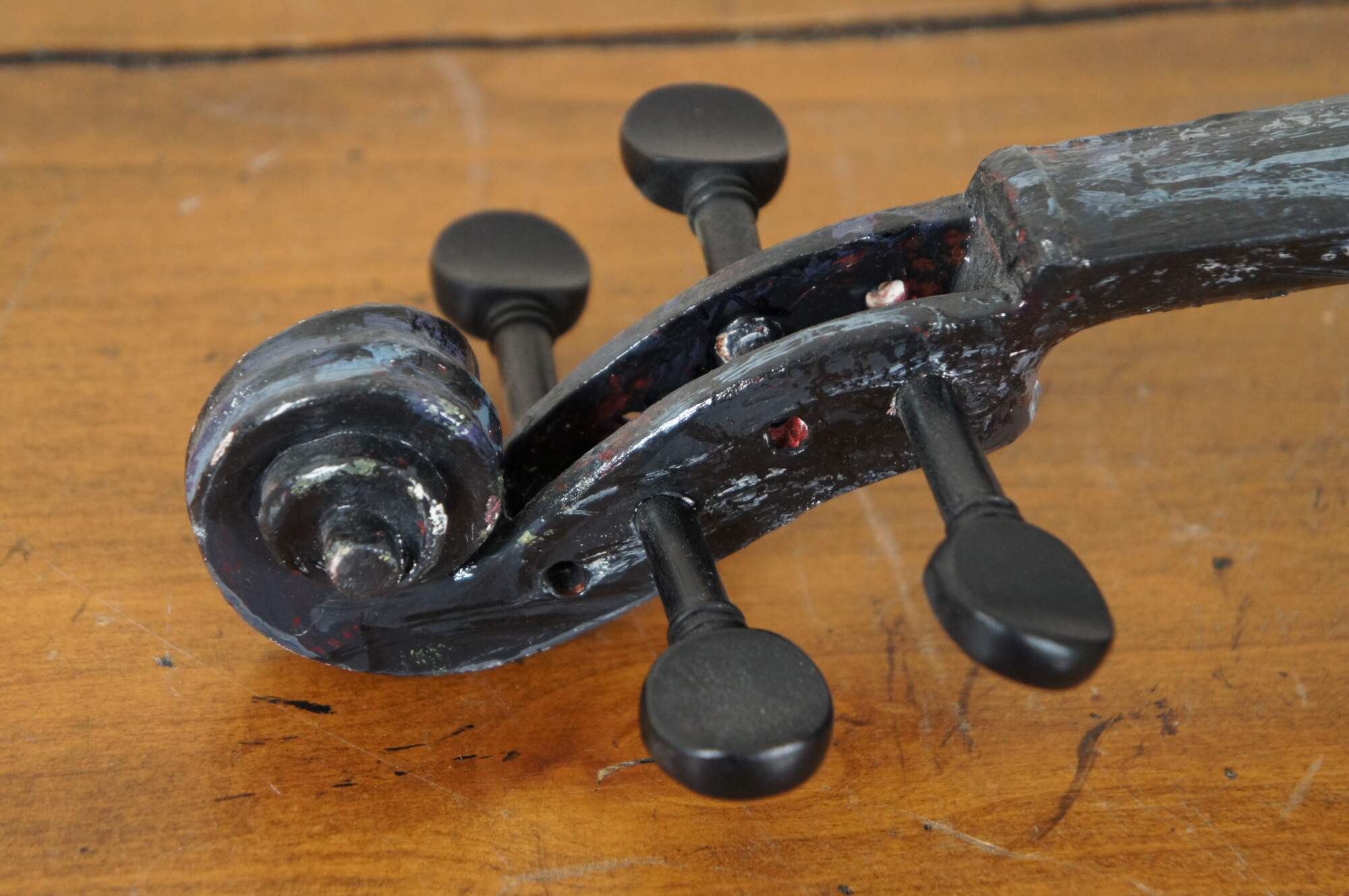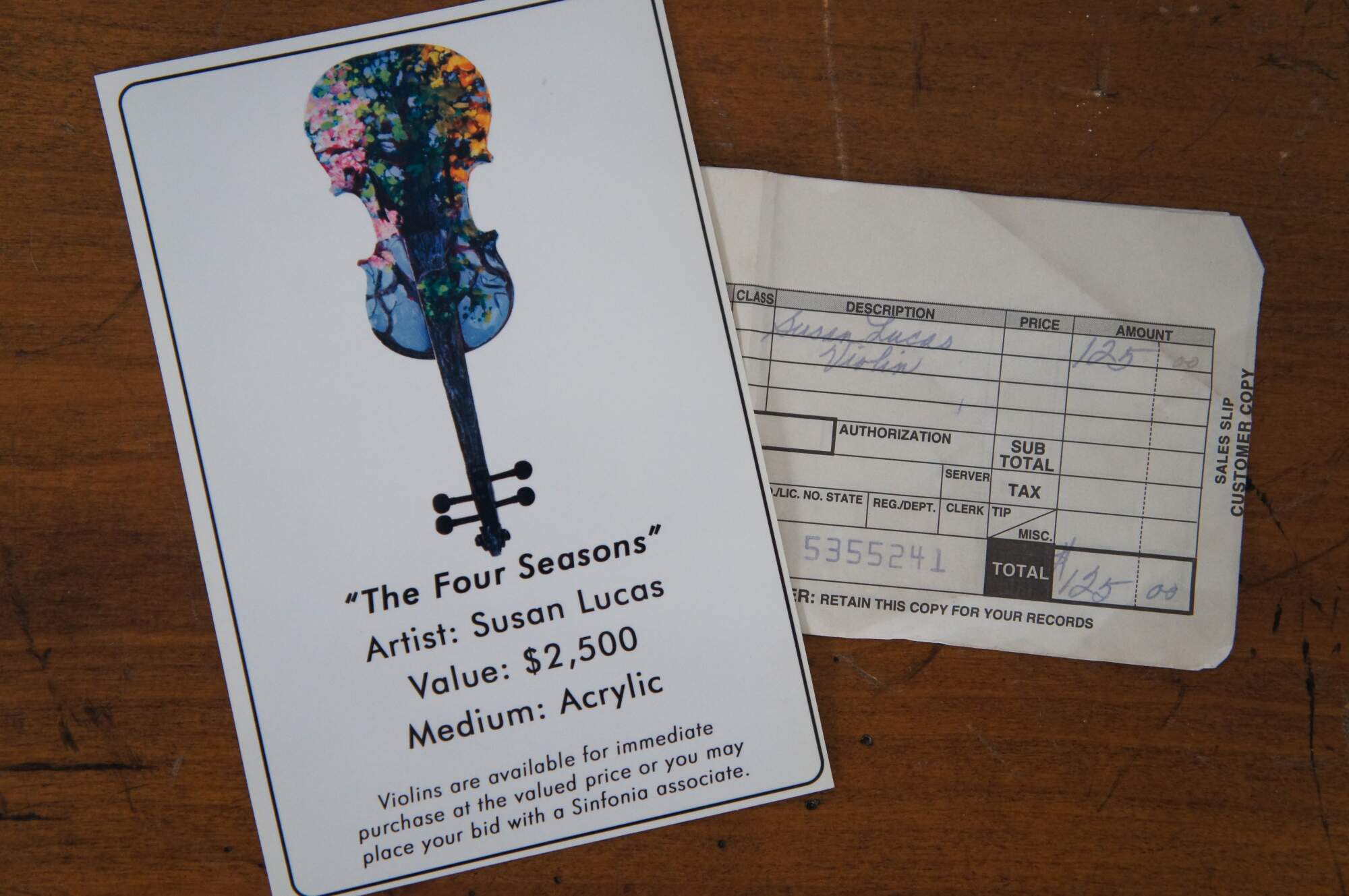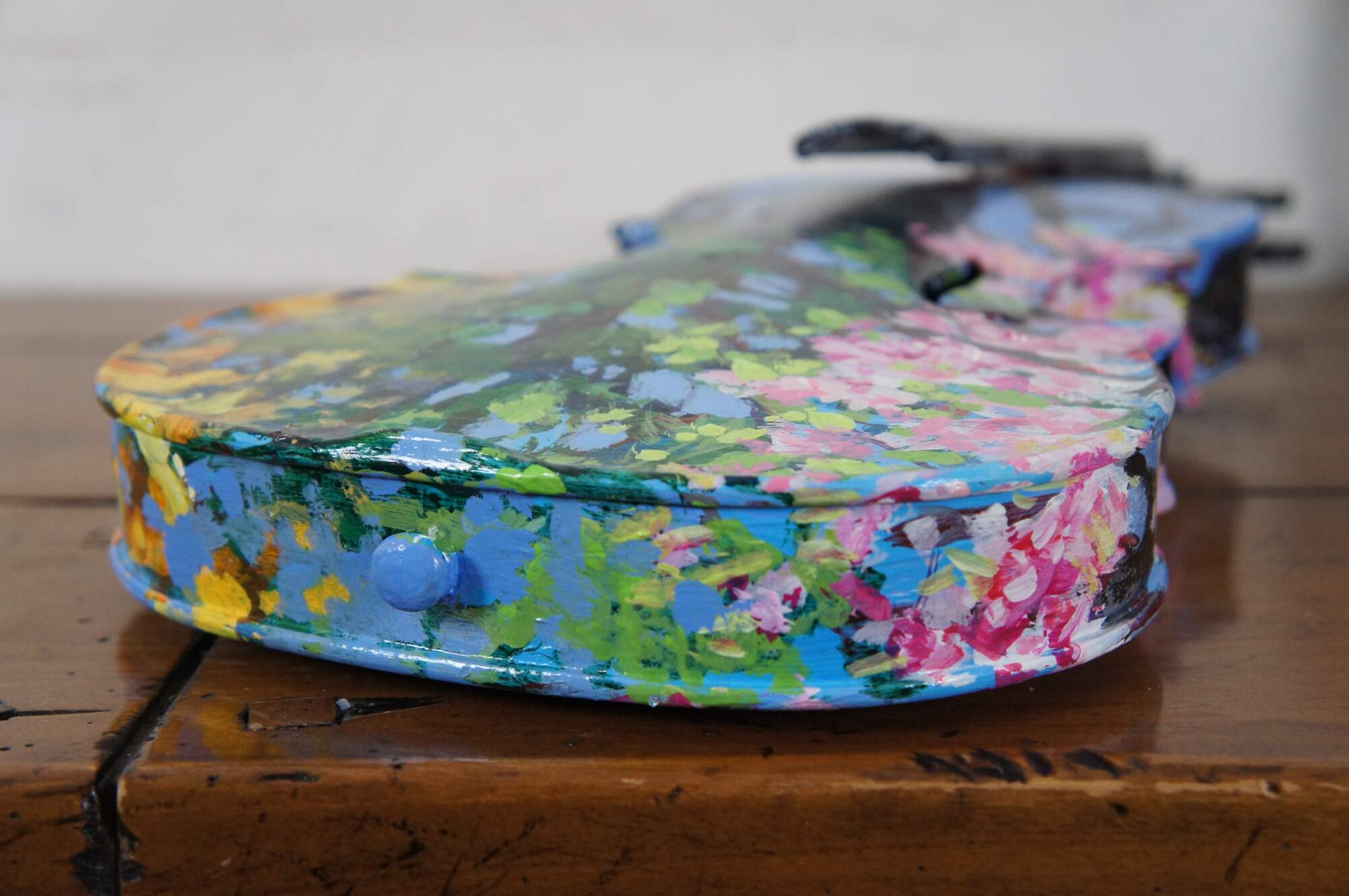 Three dimensional sculpture / mobile artwork by Susan Lucas titled “Four Seasons.” All sides of a re-purposed violin act as the canvas for an Impressionist style tree as it passes through the four seasons – the pink blossoms of spring, the deep green foliage of summer, the orange and yellow leaves of autumn, and the bare branches of winter. Signed on the side to the right of the neck. Originally displayed suspended from fishing line tied to the peg one the body end of the instrument. Includes new looking soft shell case.
