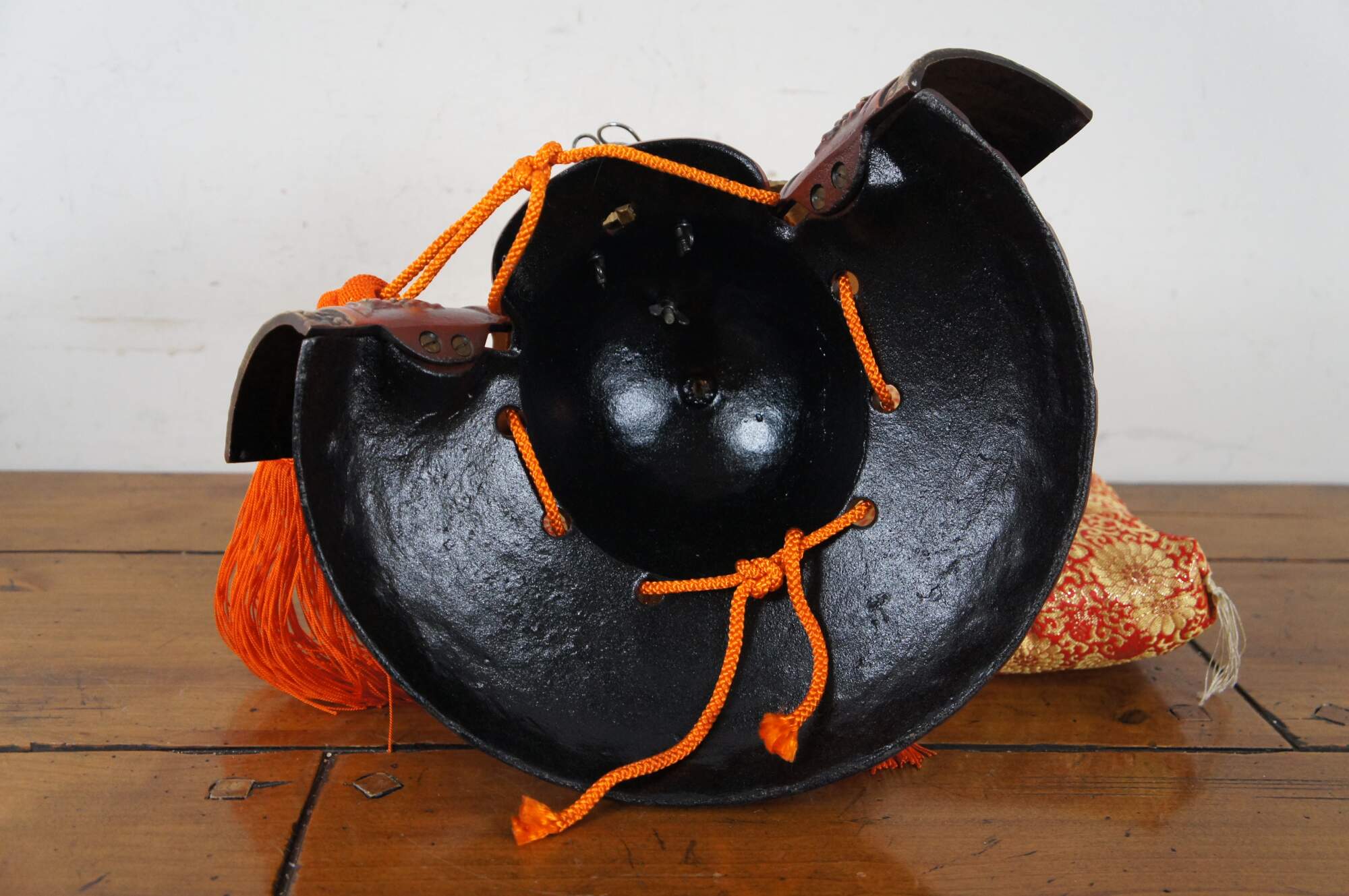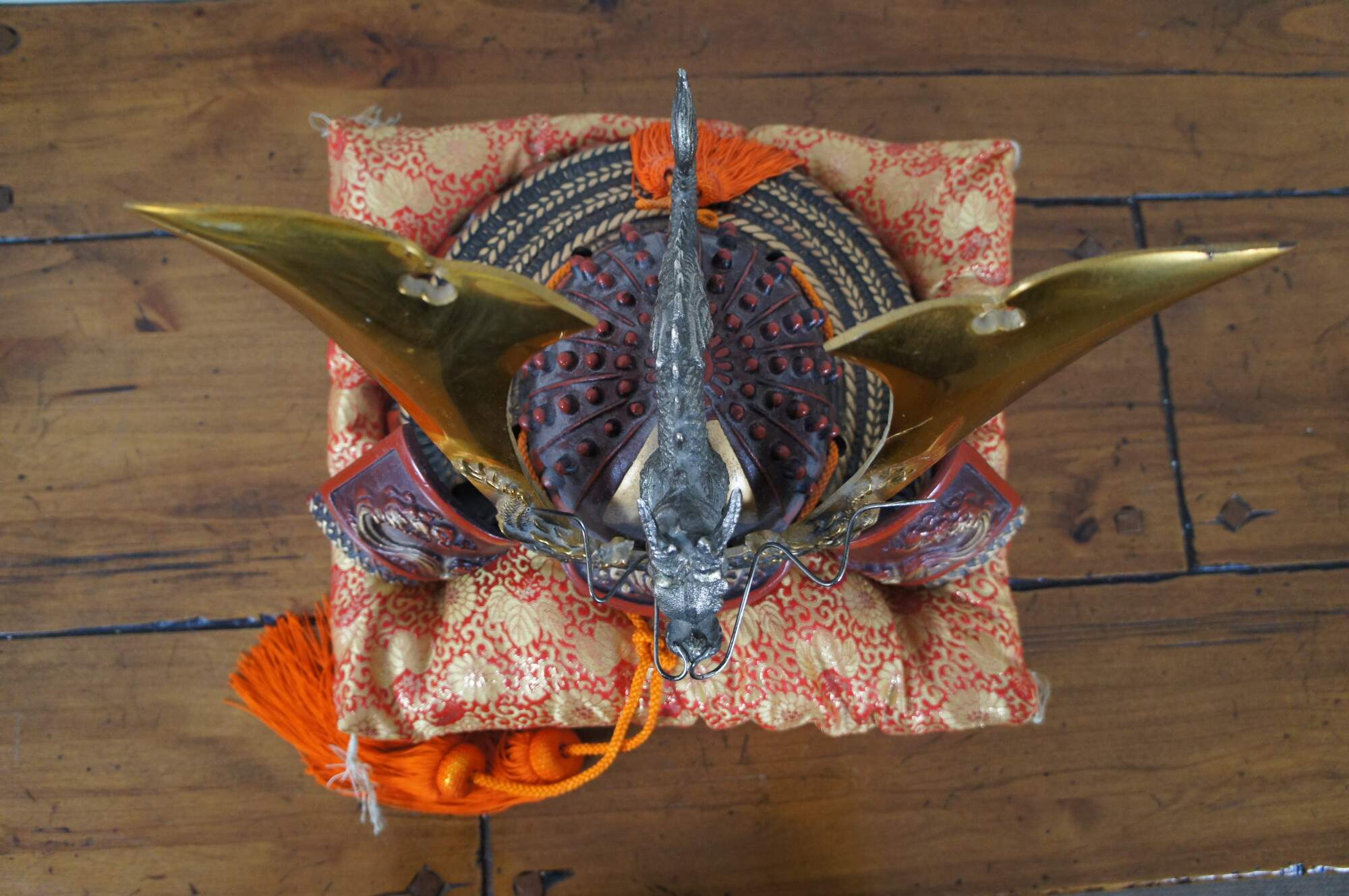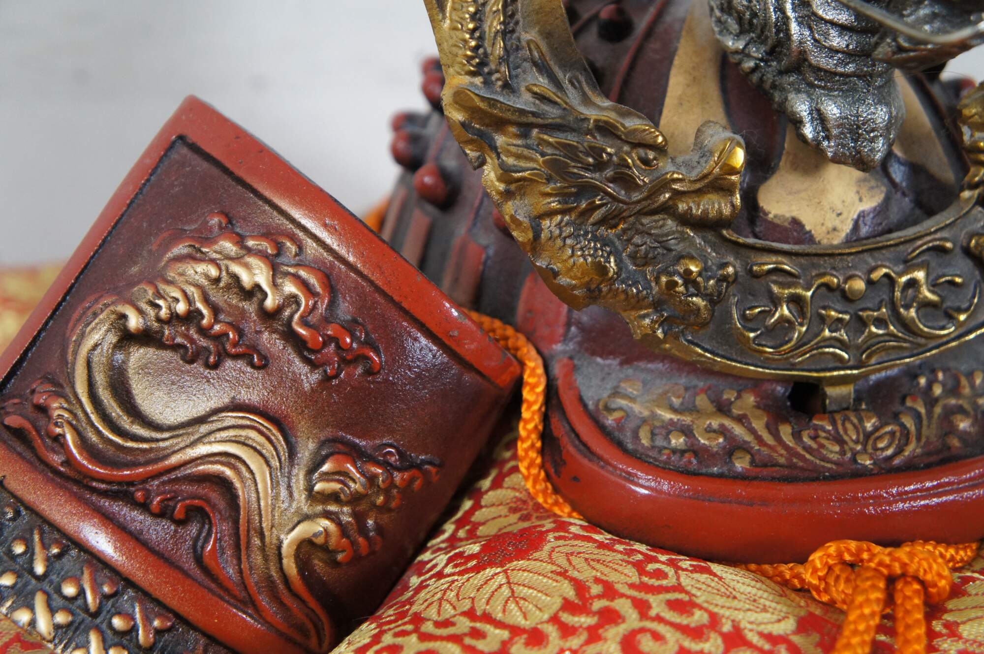 Vintage Japanese okimono kabuto samurai helmet, in the style of the Genji periord of 1864-65. Made of iron and painted deep blood red with black and gold accents. Ocean waves crash along the side panels while the main section is flanked with two gold dragons at the base of brass wing or blade shaped protrusions. Along the crest sits a silver toned dragon with long whiskers. An orange cord is strung through the brim. A red and gold floral silk pillow is included for display.