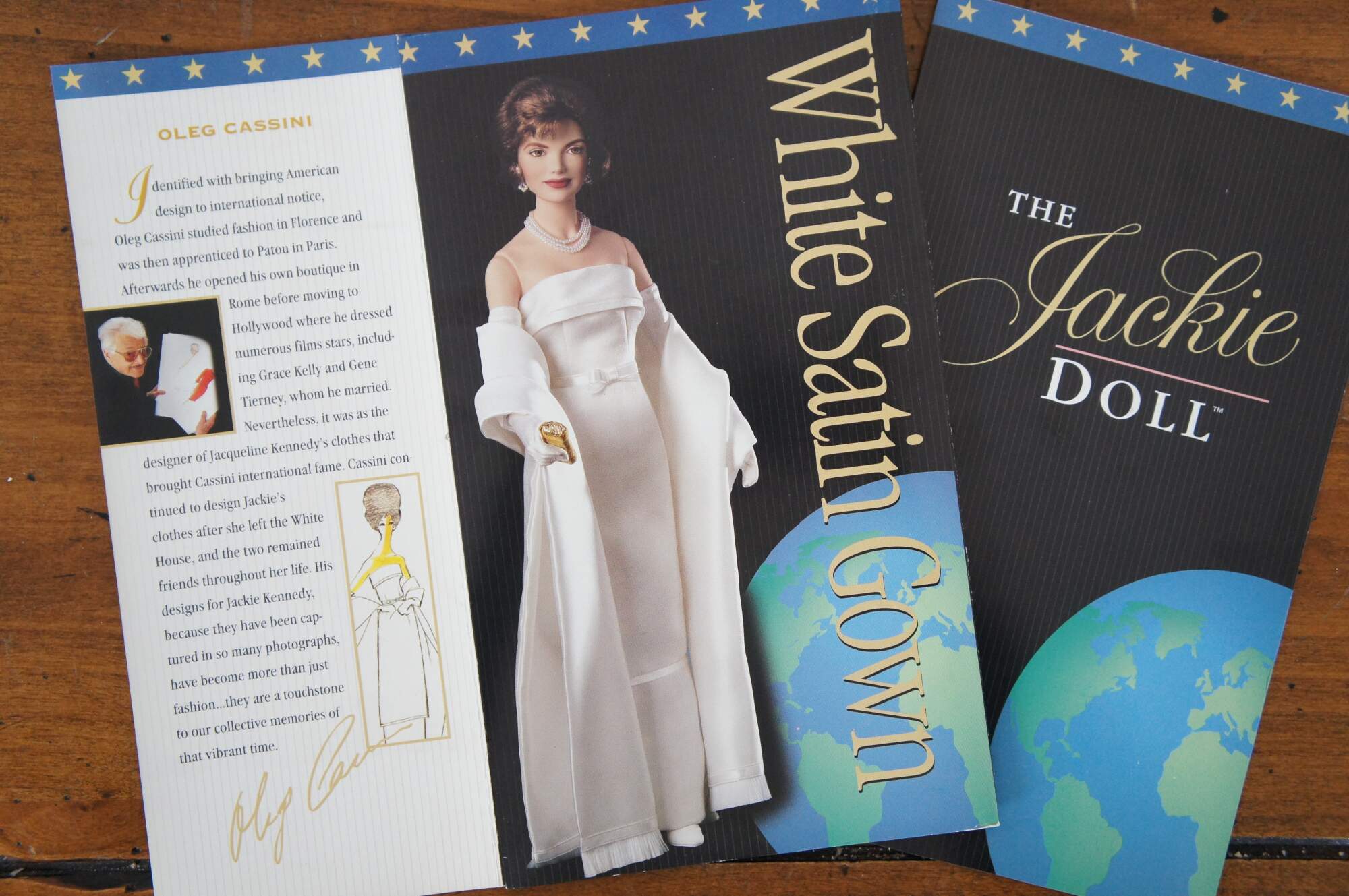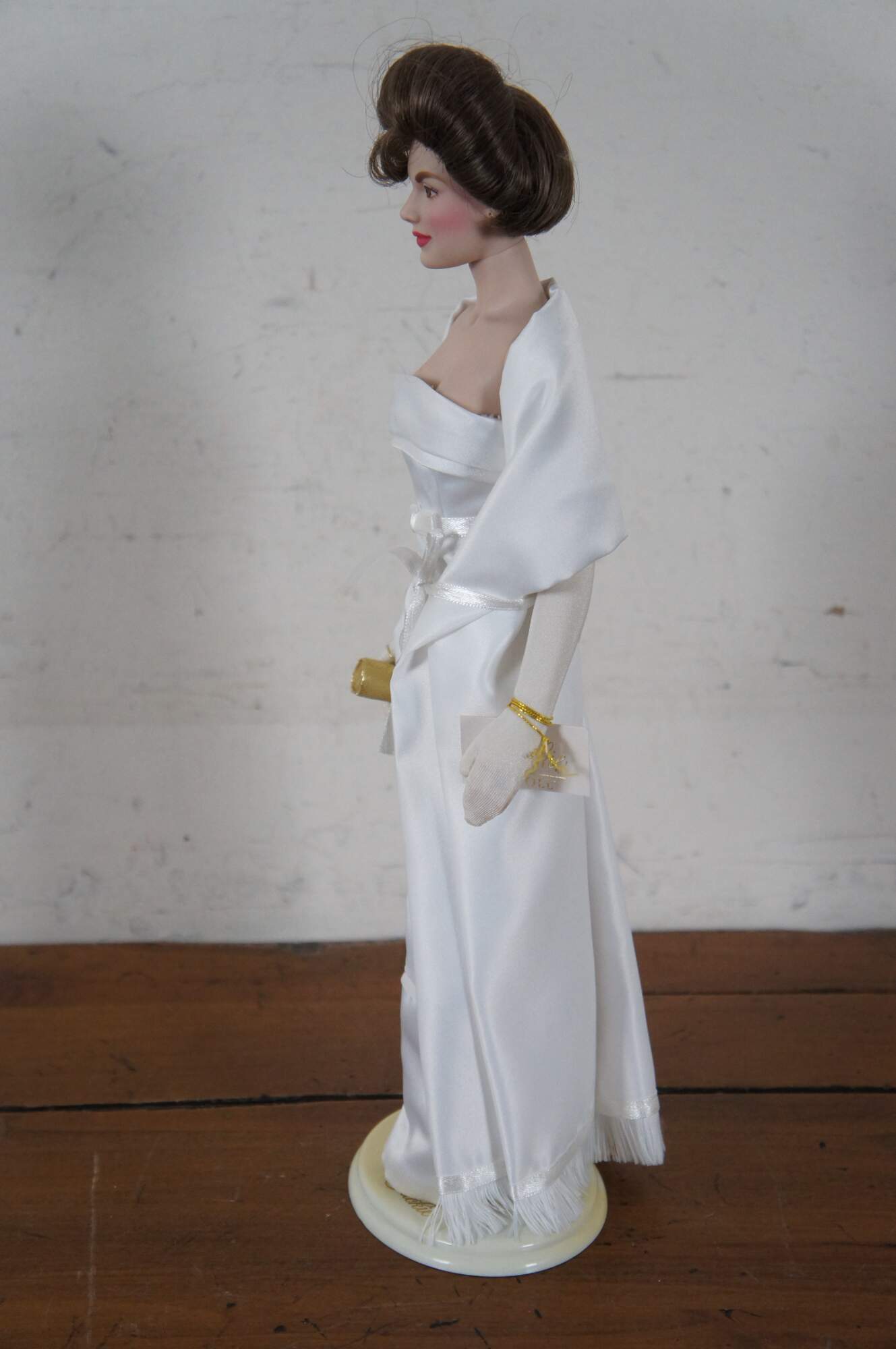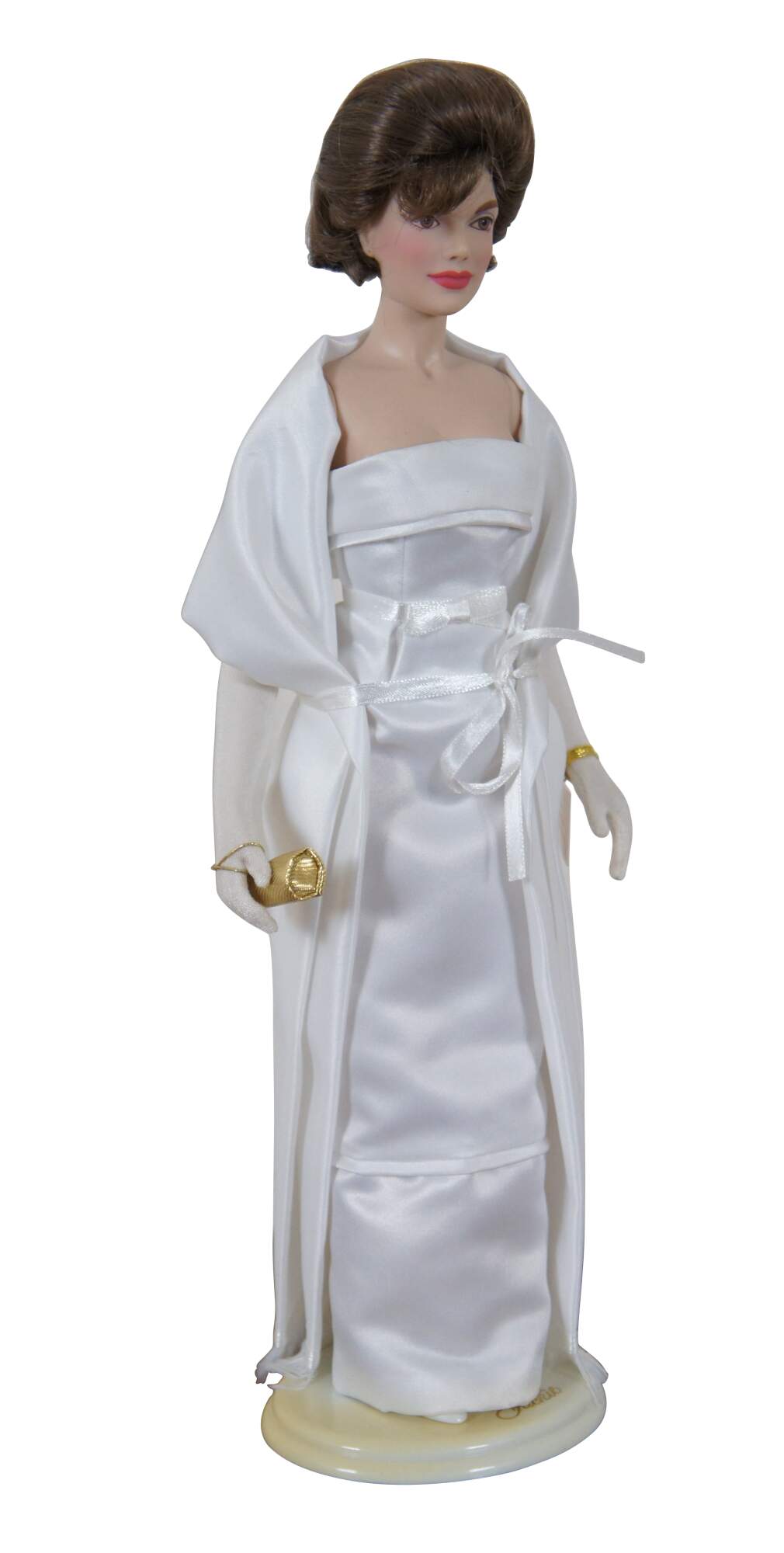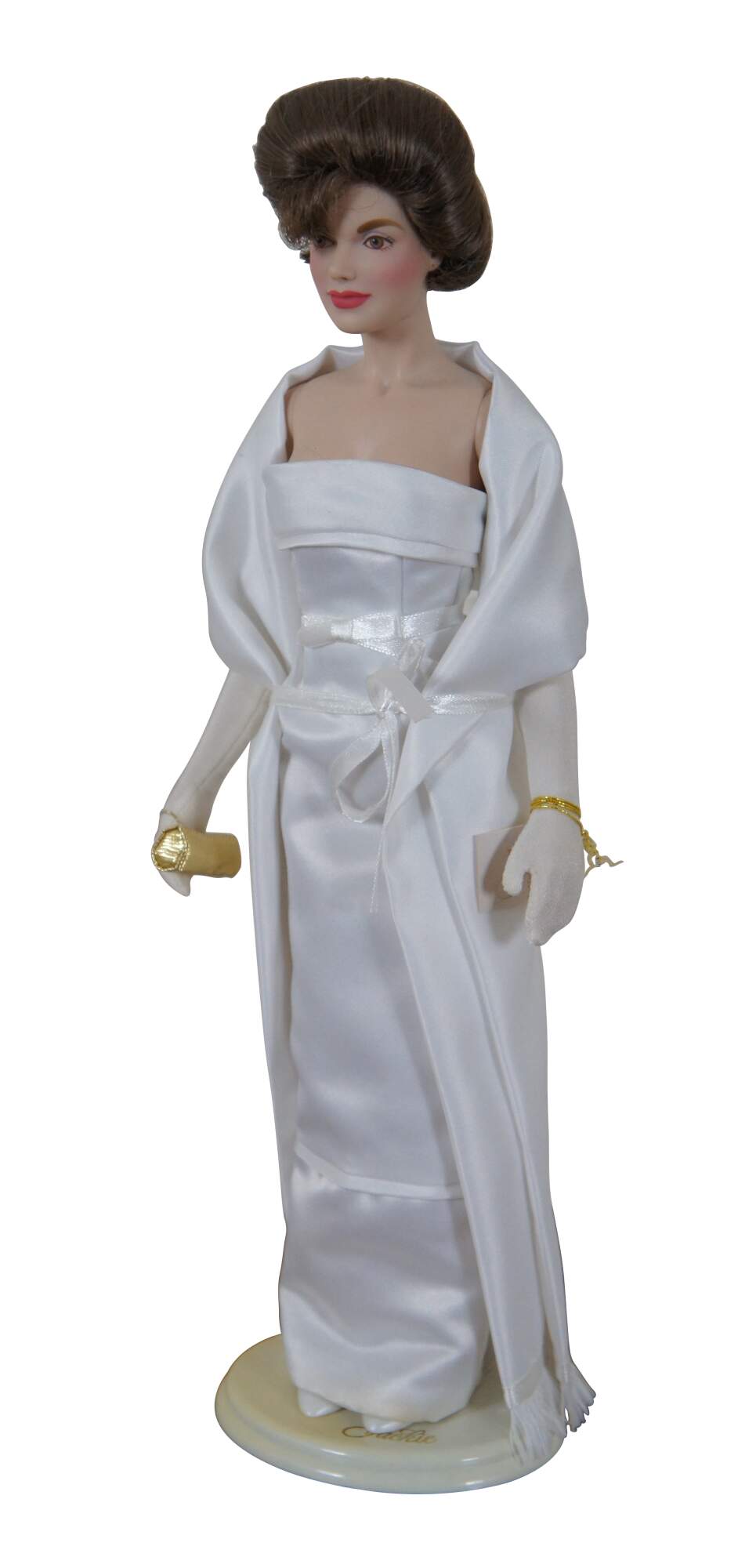 The Jackie Kennedy Doll, wearing the Indian State Visit White Satin Gown Ensemble designed by Oleg Cassini. Missing earrings and necklace. Includes original display box, white plastic stand, inserts and Certificates of Authenticity. Crafted in China for The Franklin Mint.