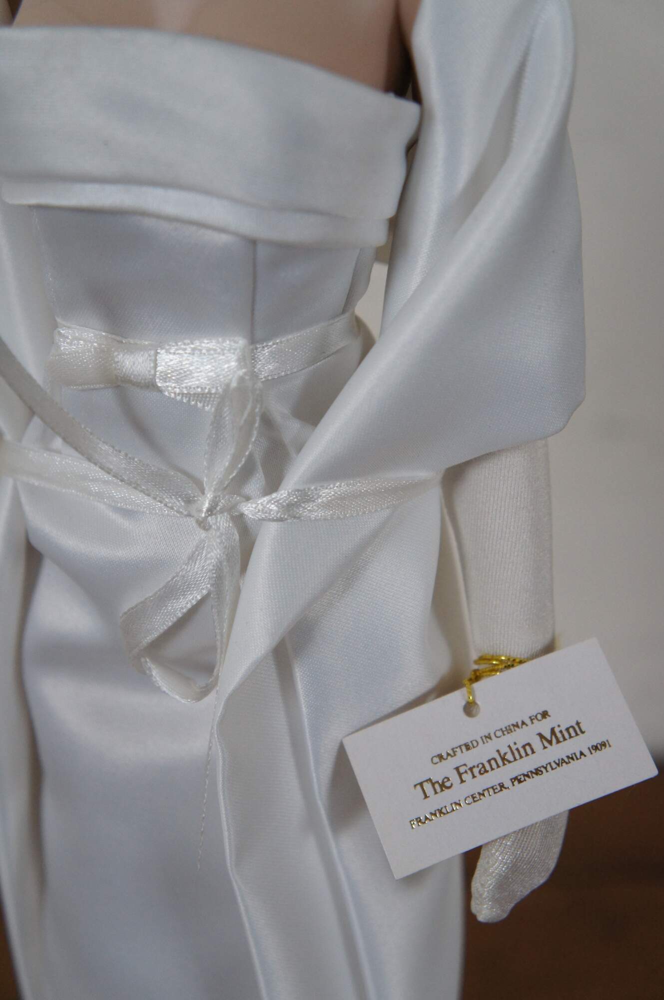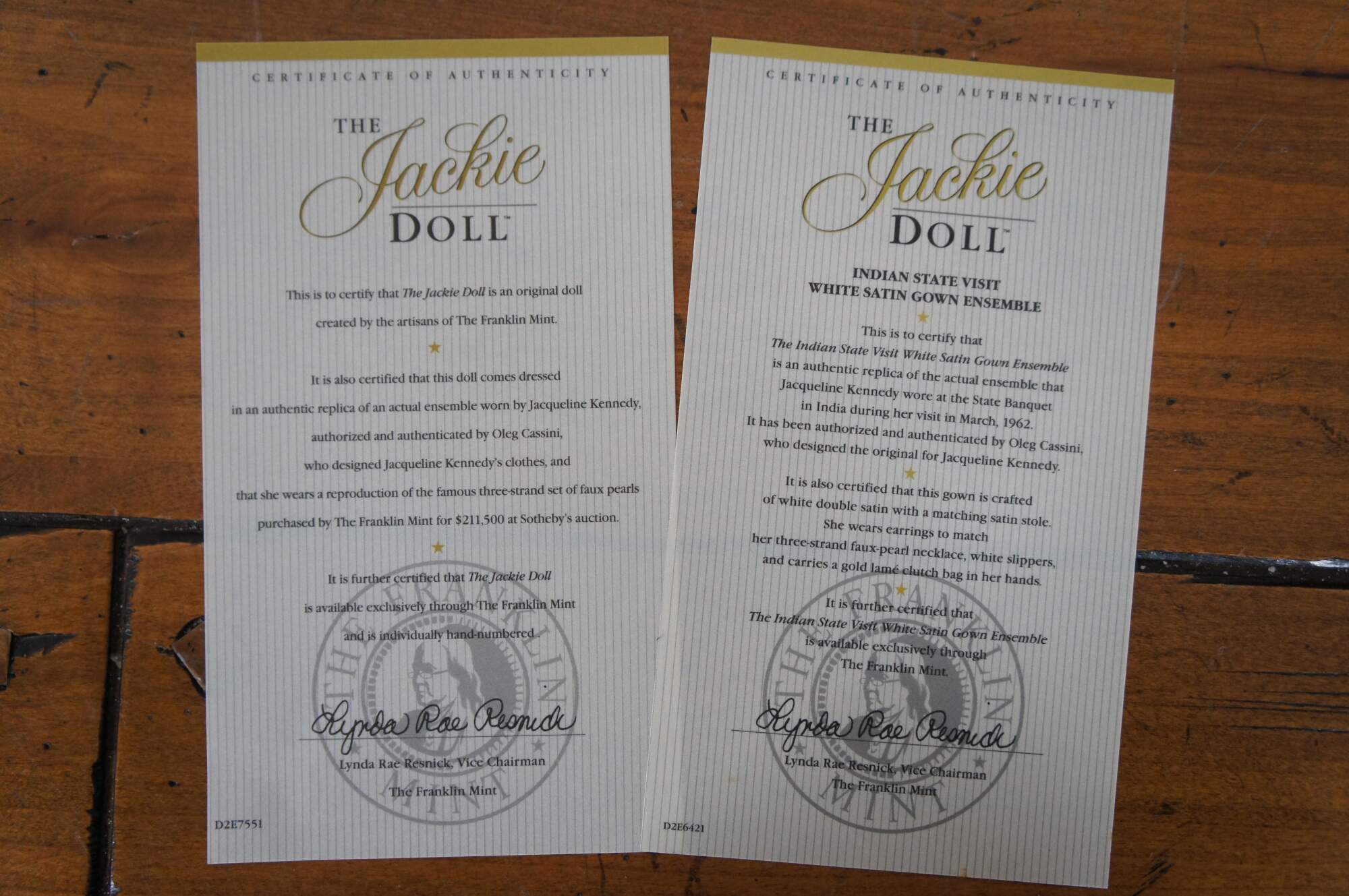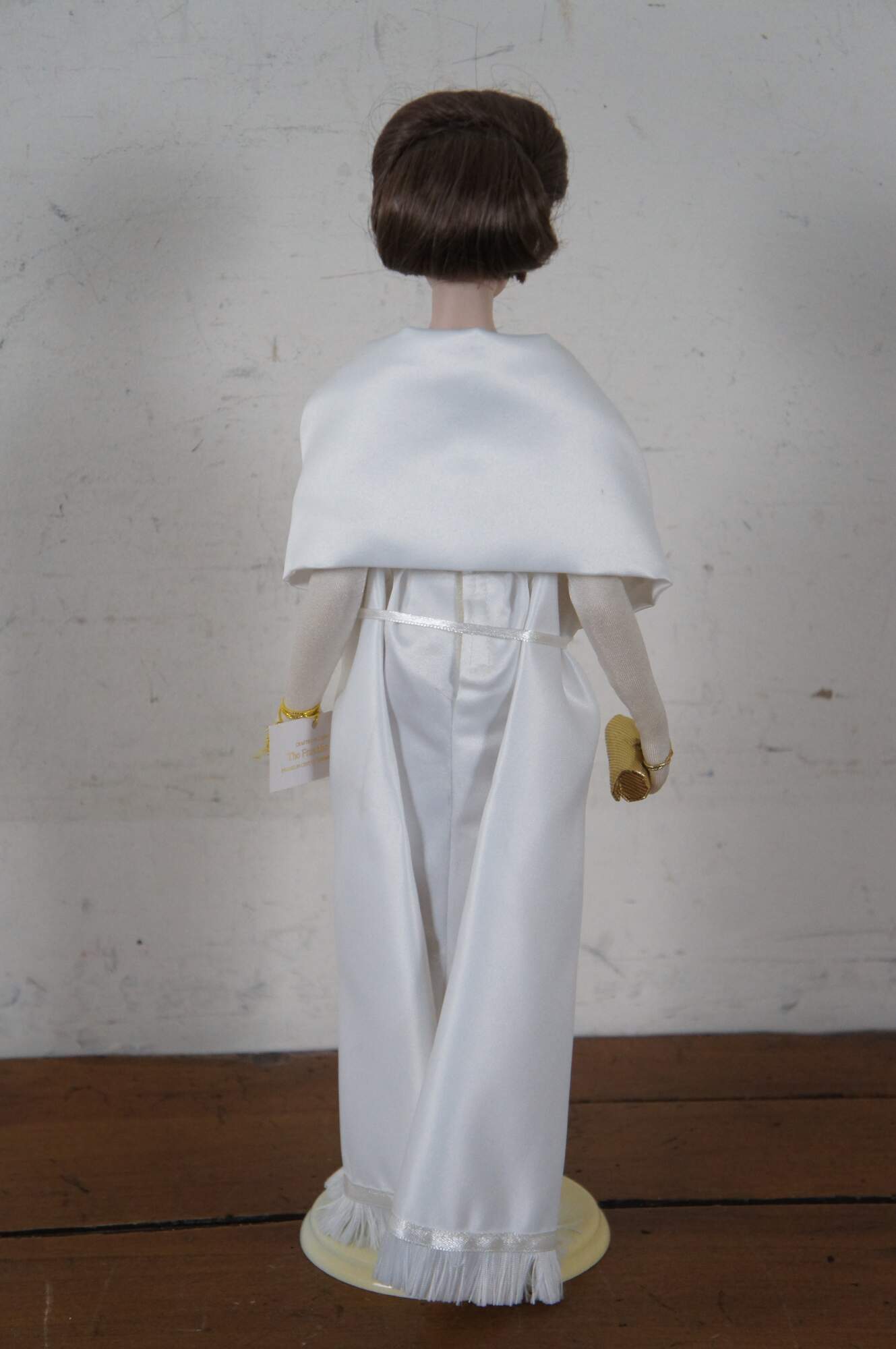 The Jackie Kennedy Doll, wearing the Indian State Visit White Satin Gown Ensemble designed by Oleg Cassini. Missing earrings and necklace. Includes original display box, white plastic stand, inserts and Certificates of Authenticity. Crafted in China for The Franklin Mint.