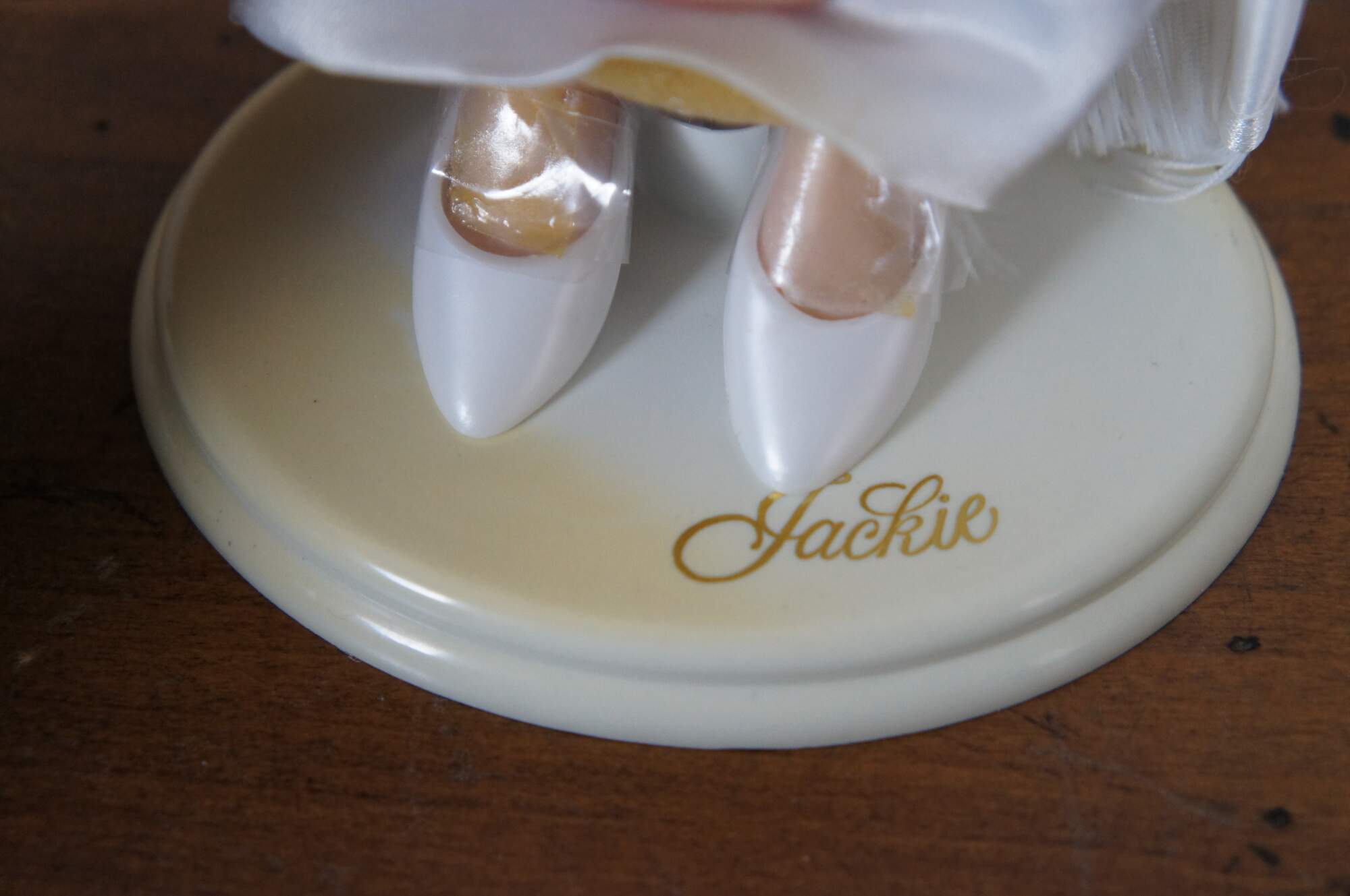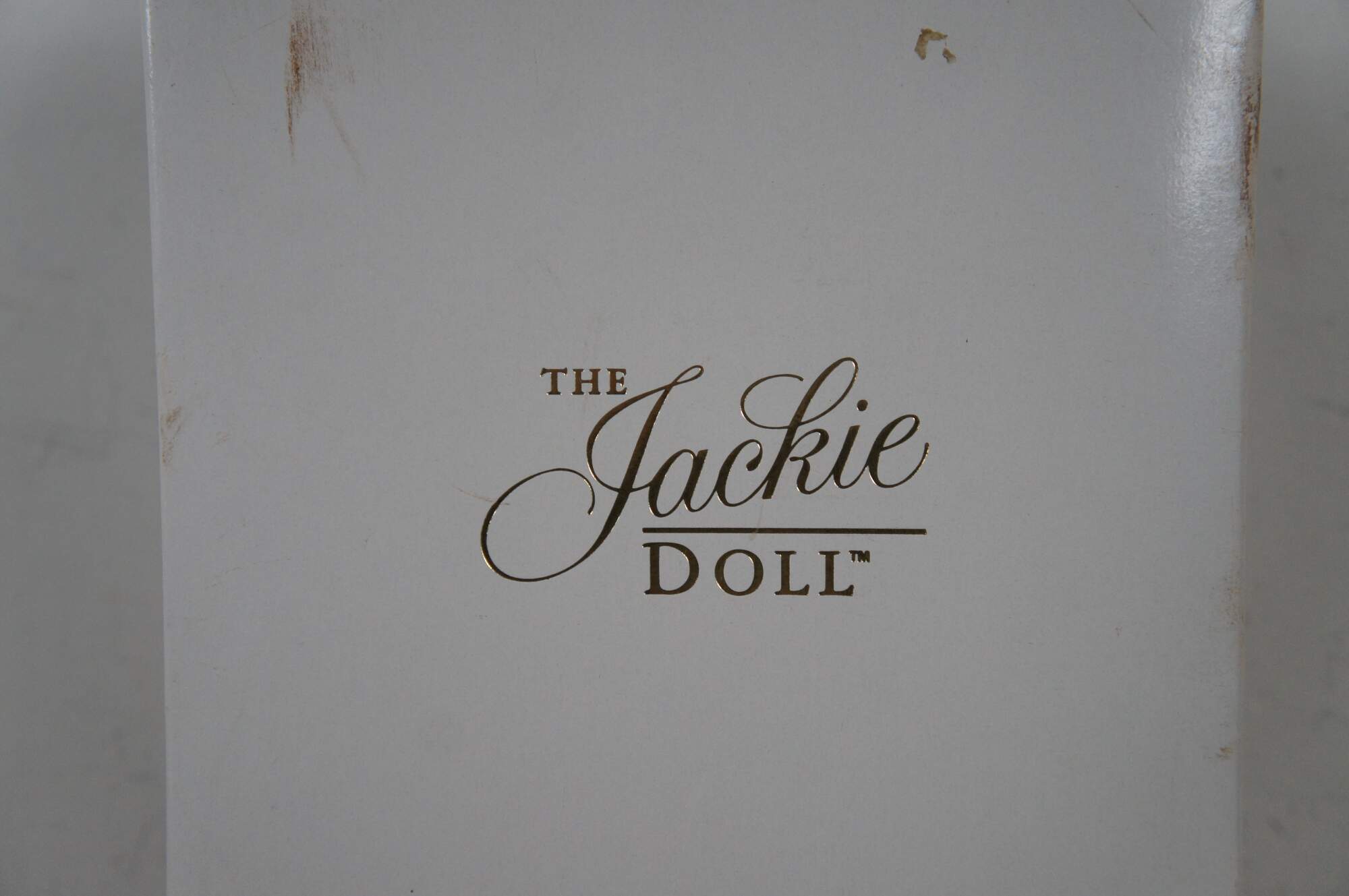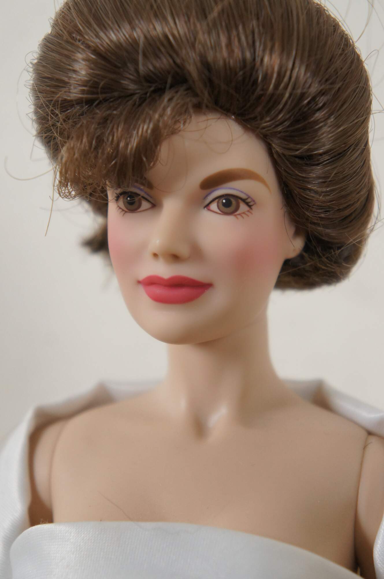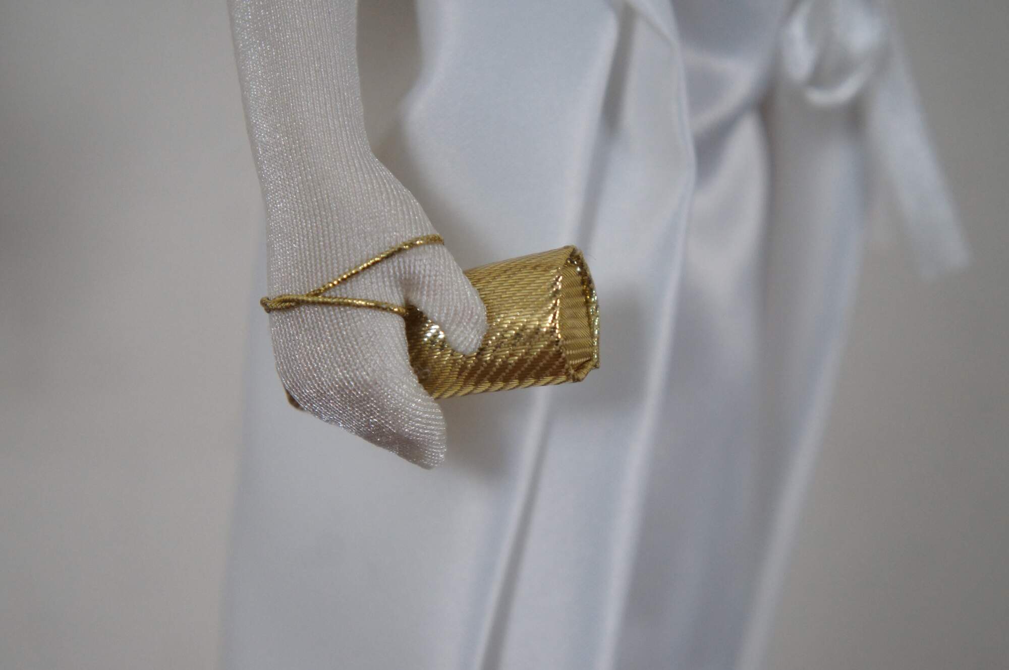The Jackie Kennedy Doll, wearing the Indian State Visit White Satin Gown Ensemble designed by Oleg Cassini. Missing earrings and necklace. Includes original display box, white plastic stand, inserts and Certificates of Authenticity. Crafted in China for The Franklin Mint.