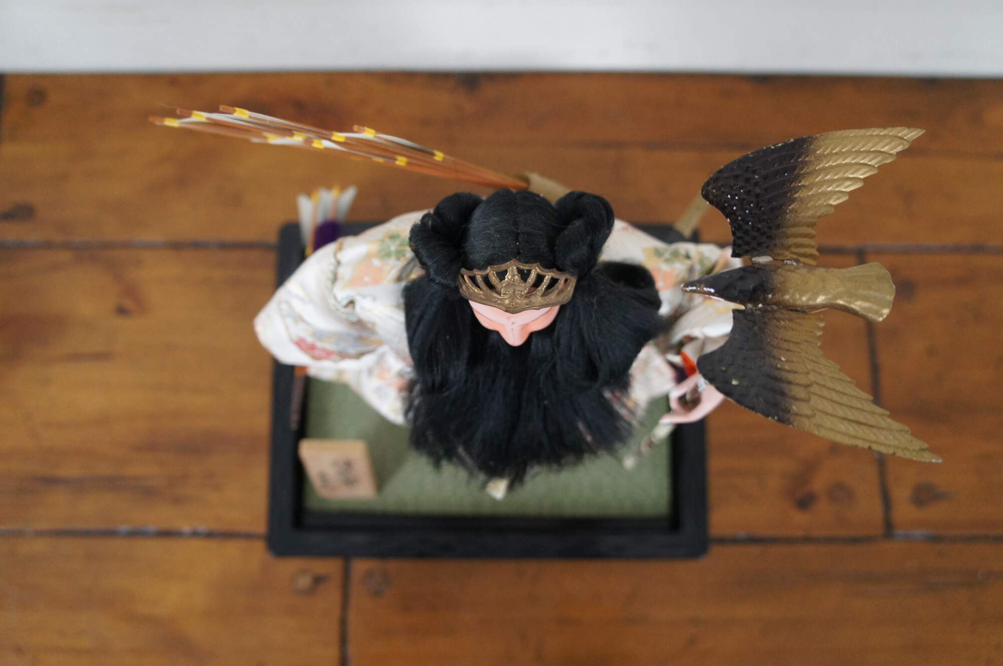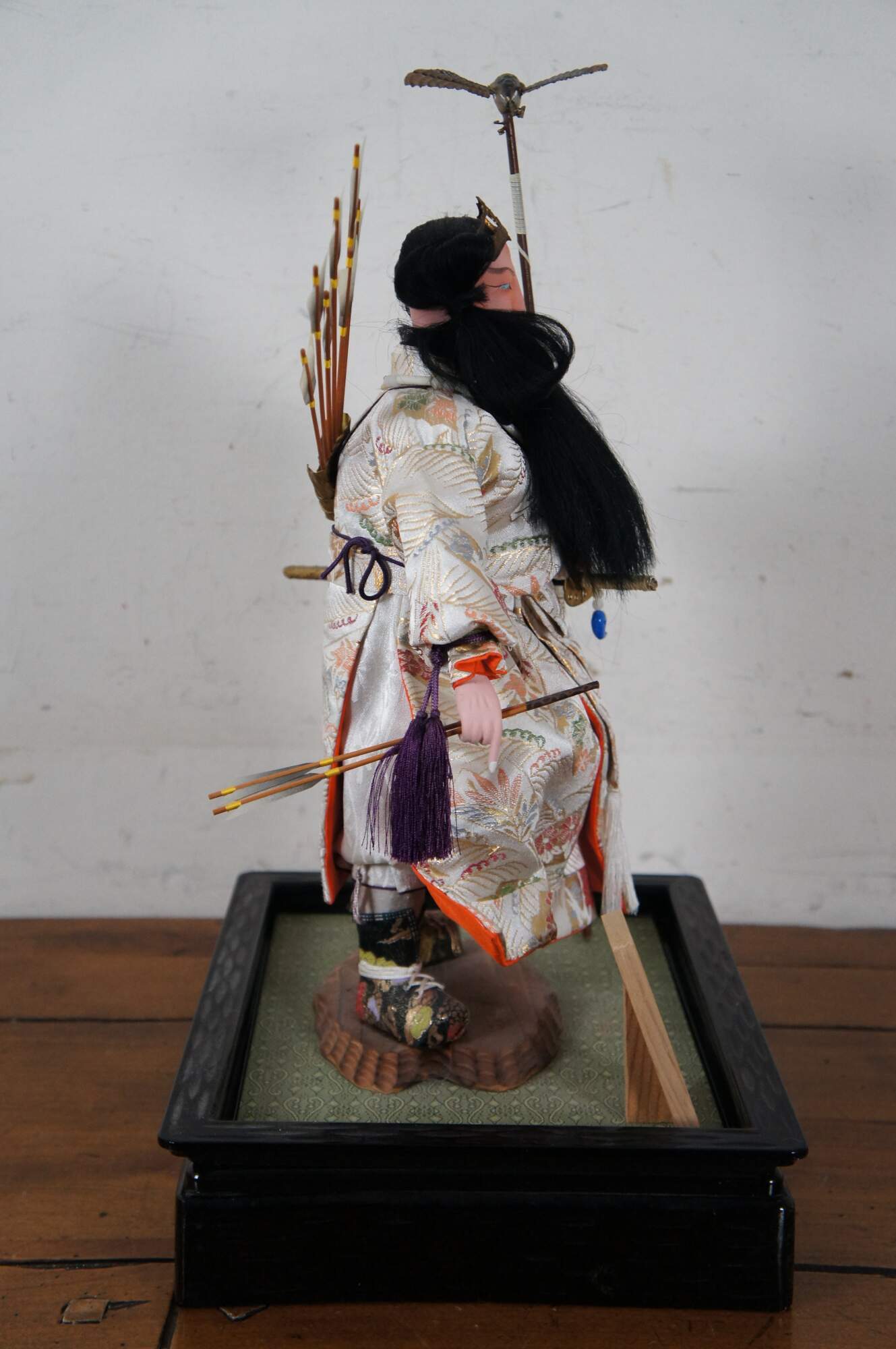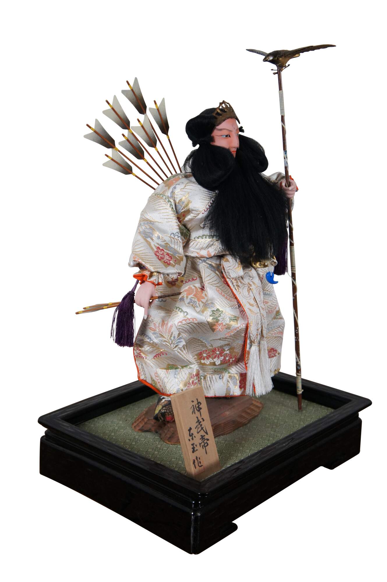 Vintage doll / figurine portraying Jinmu Tenno – Japan’s legendary first emperor. The doll is crafted with un-glazed porcelain / bisque head and hands, painted features and a lovely white silk robe. The Emperor wears a quiver of arrows on his back, and white beads around his neck, carries an arrow in one hand, and a staff topped with a flying eagle in the other; a magical sword hangs at his side and a golden diadem sits on his long dark hair. The stand is black plastic (mimicking lacquer) with a green surface and a small section of brown rock where the Emperor stands. A small wood plaque is mounted in the front corner.