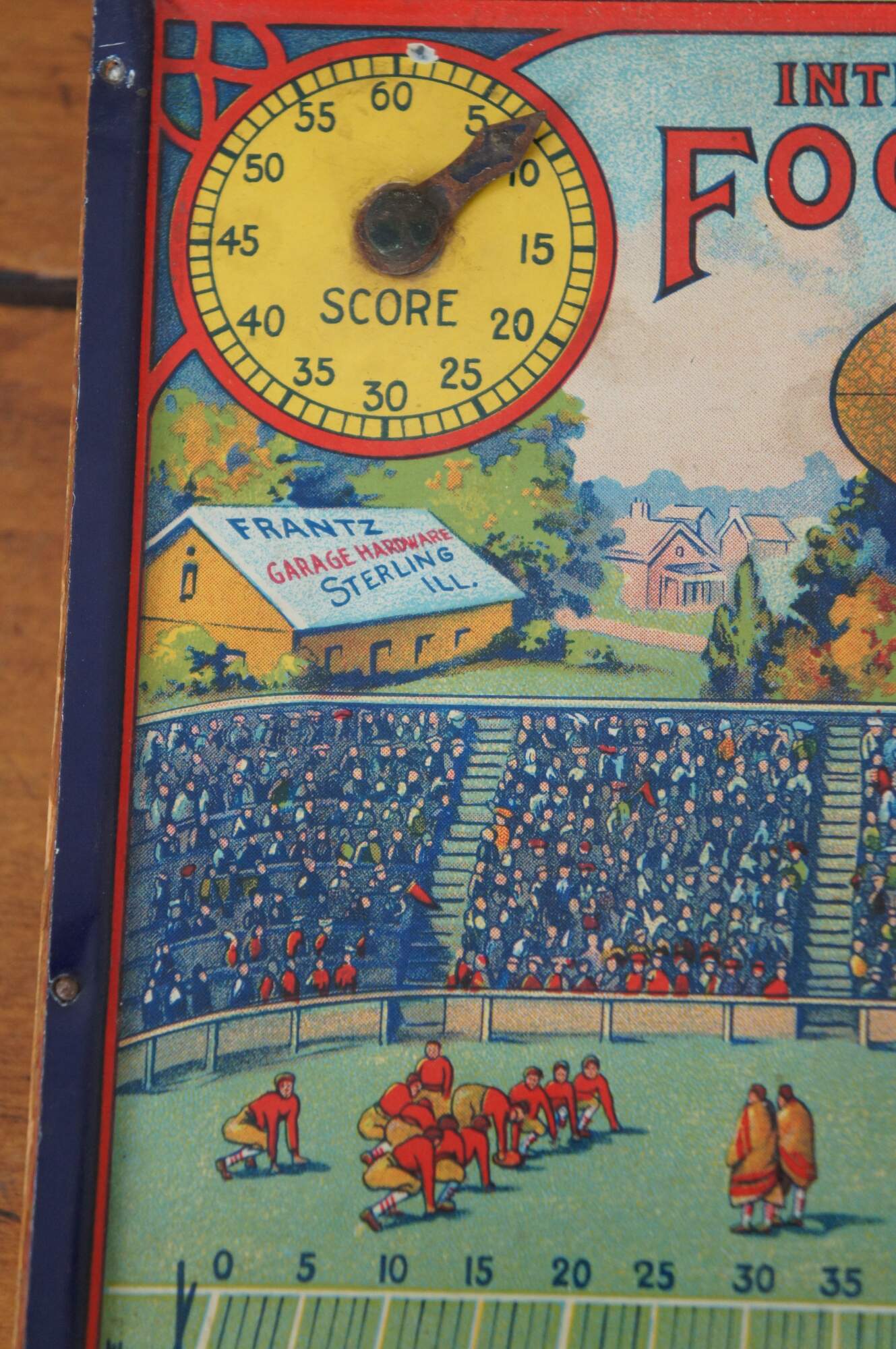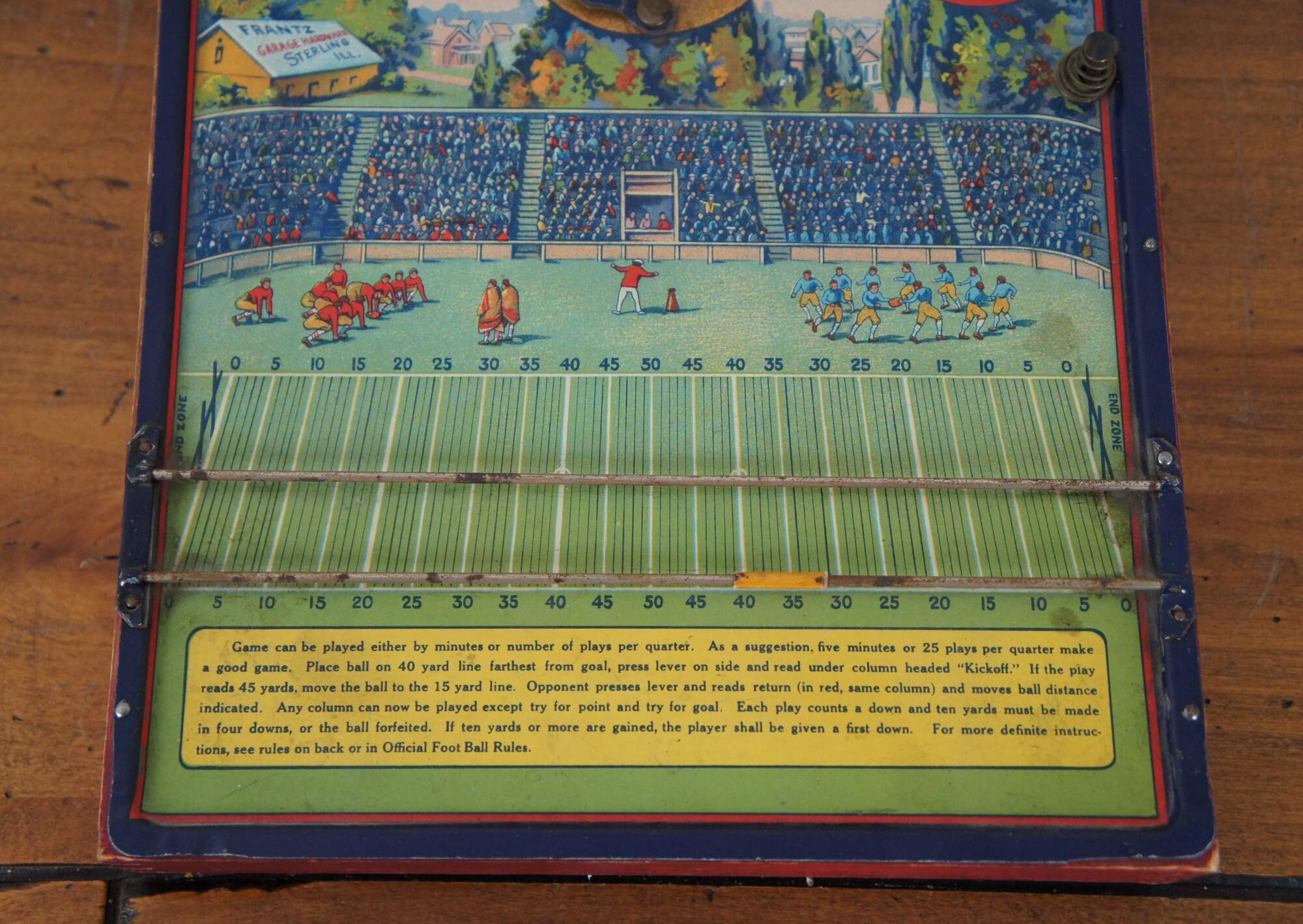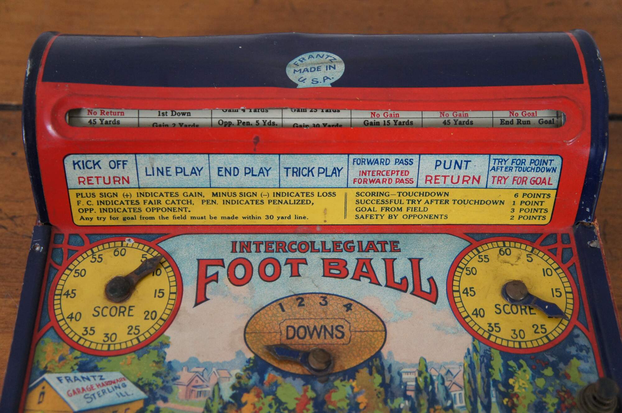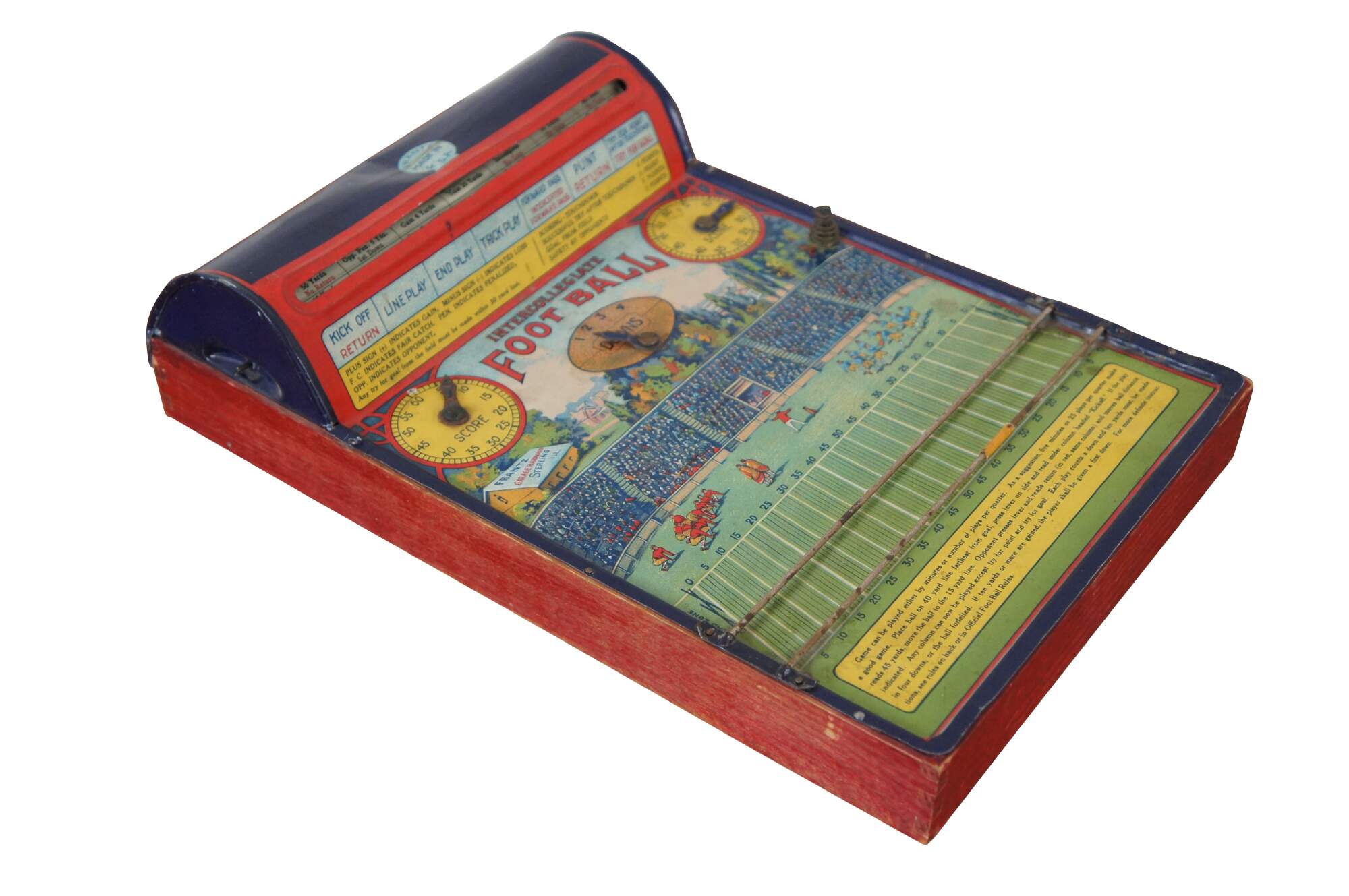 Antique 1920’s Intercollegiate Football table top spinner game by Frantz Manufacturing Company of Sterling, Illinois. Tin body on a wooden base frame, with lithograph printed details and instructions. Mechanism that spins the play wheel is functional.