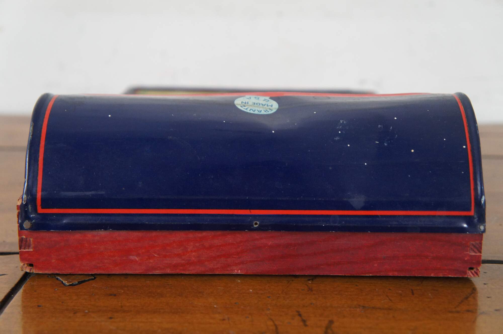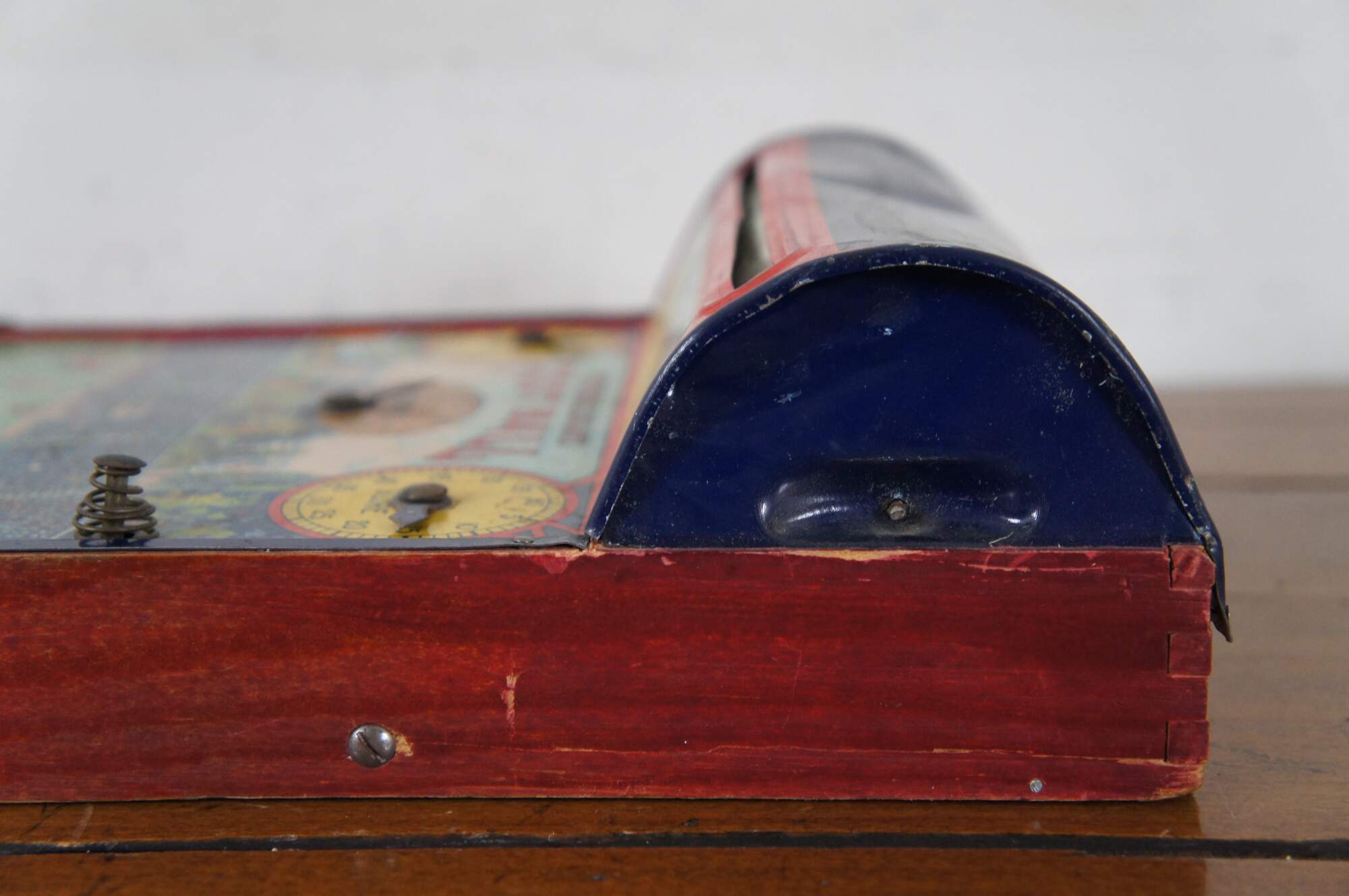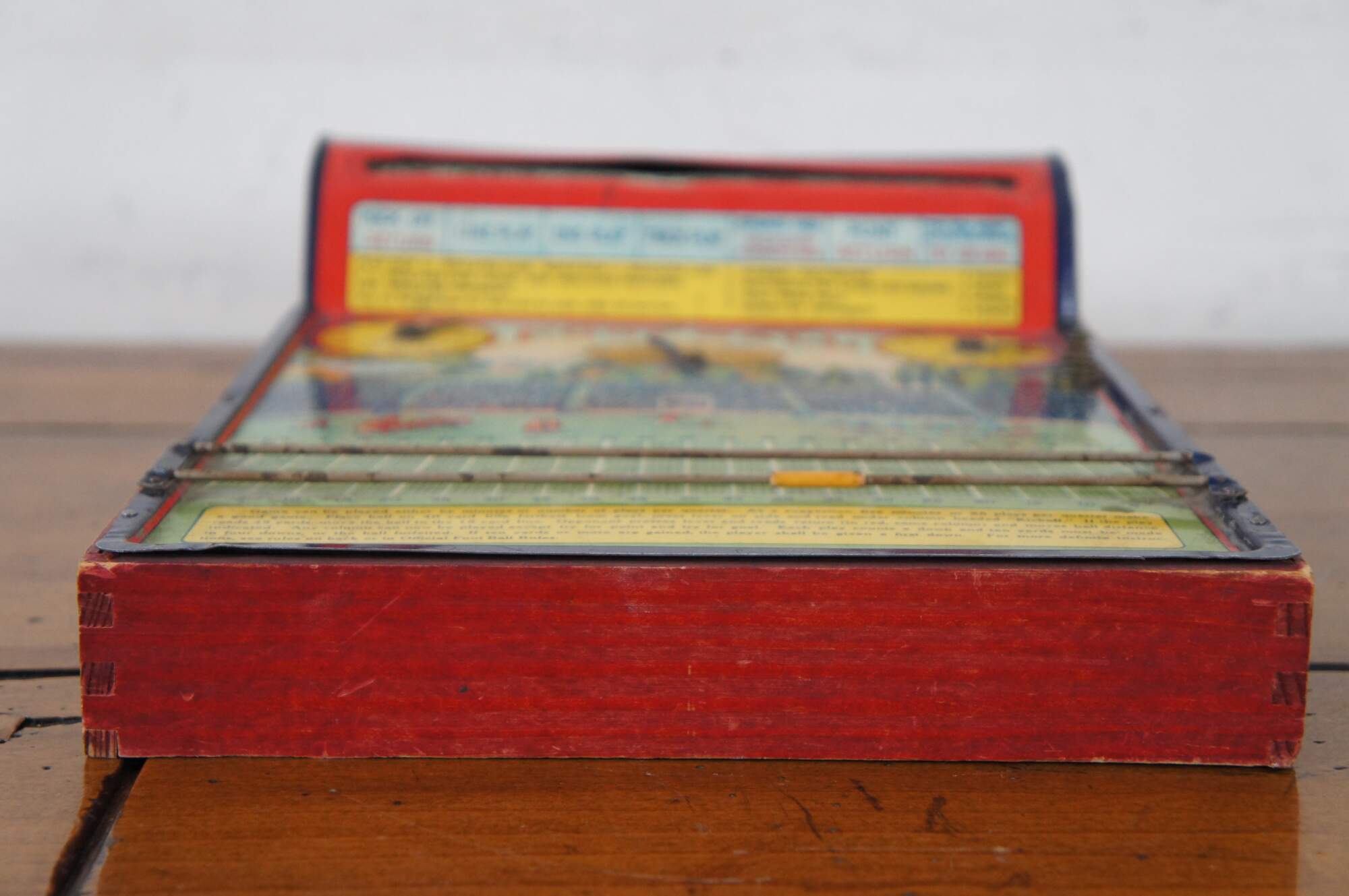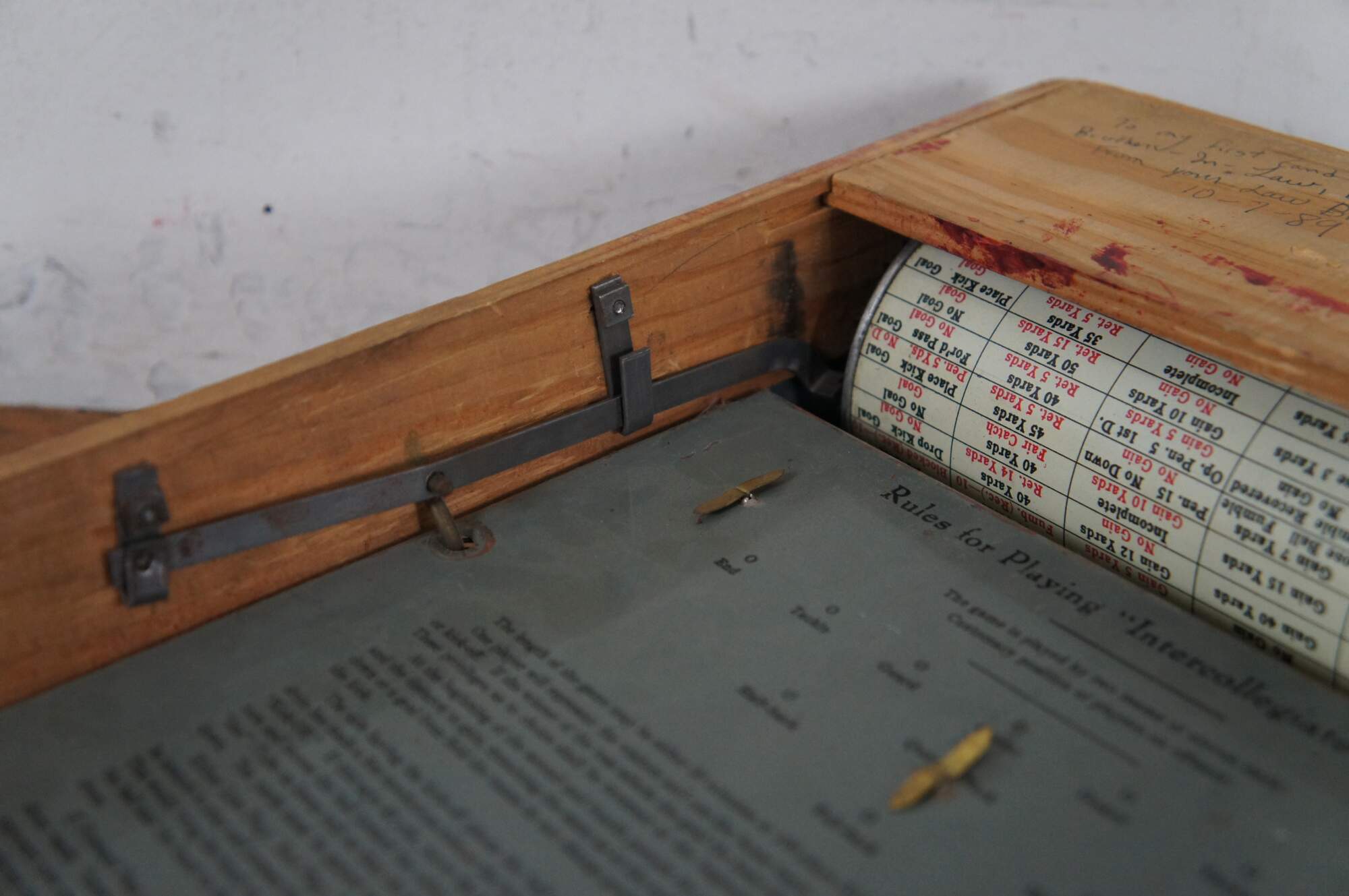 Antique 1920’s Intercollegiate Football table top spinner game by Frantz Manufacturing Company of Sterling, Illinois. Tin body on a wooden base frame, with lithograph printed details and instructions. Mechanism that spins the play wheel is functional.