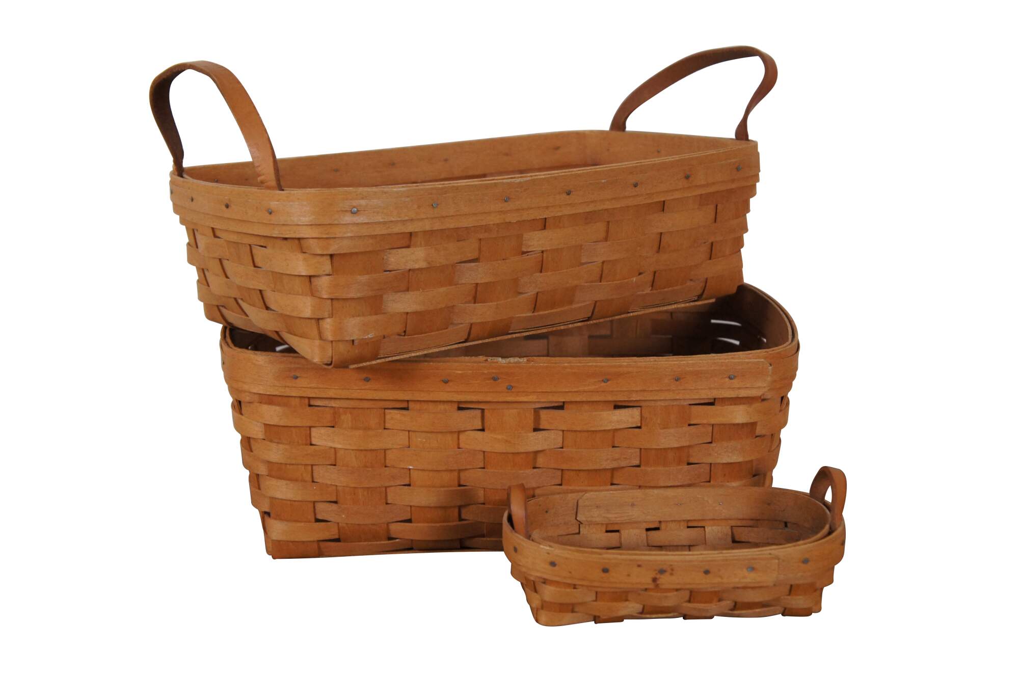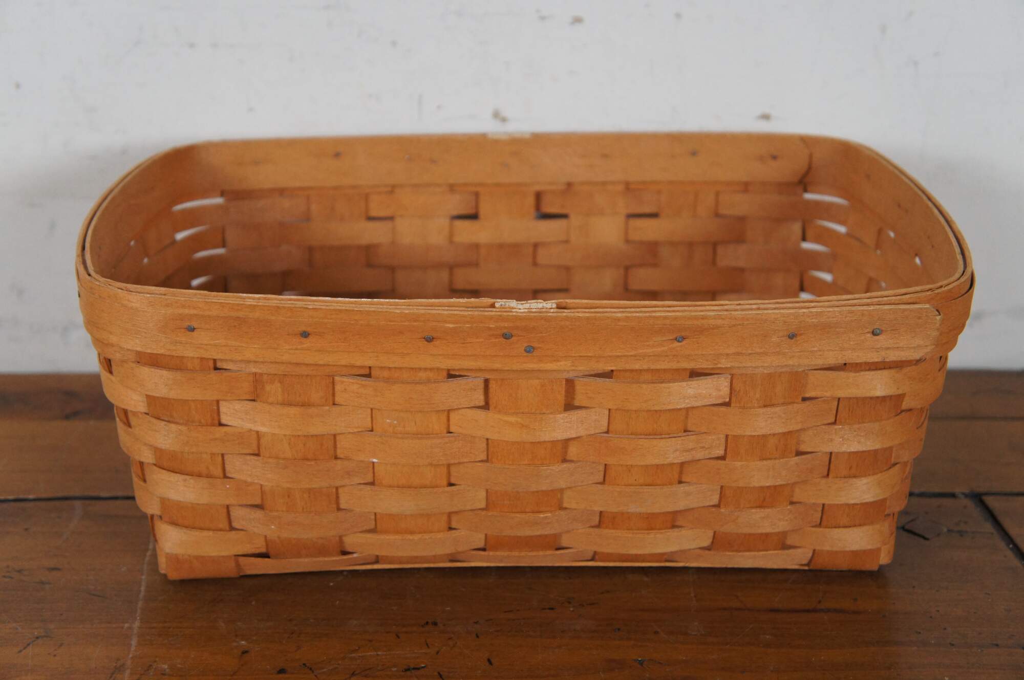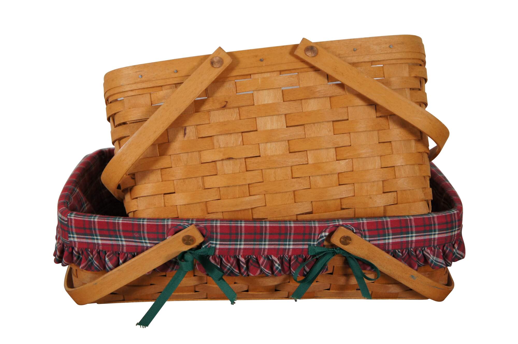 Lot of 5 vintage Longaberger rectangular handwoven maple market baskets. Largest: 1993 Christmas Collection Bayberry Basket with two rotating bail handles and plaid cotton liner; signed US 1993. Next largest also has double rotating bail handles; signed 7K 1994. Of the two medium baskets one is without handles and the other has leather handles; signed MED 1991 and SIA 1991. Smallest basket has leather handles; signed KM 1992.