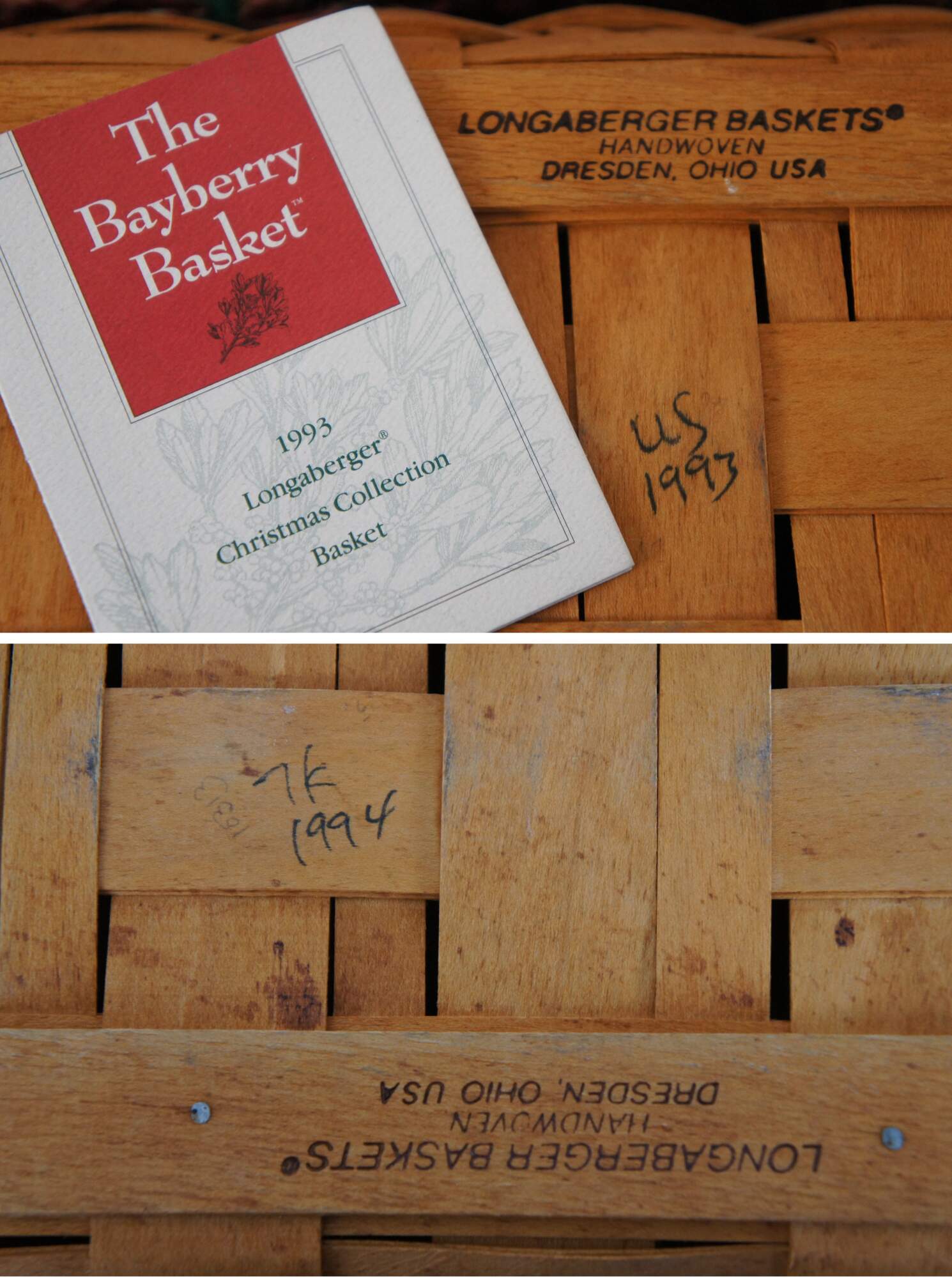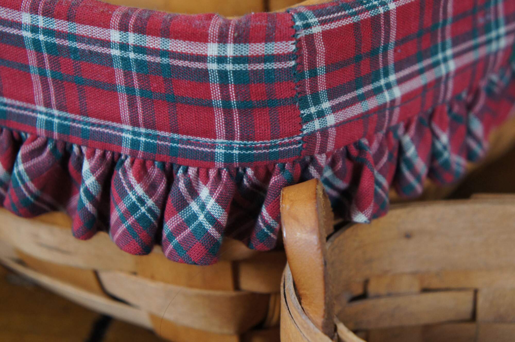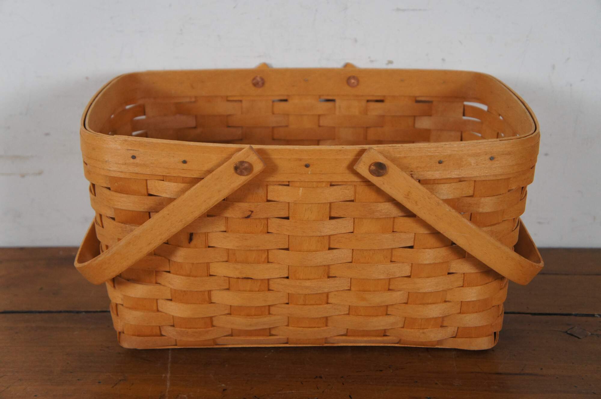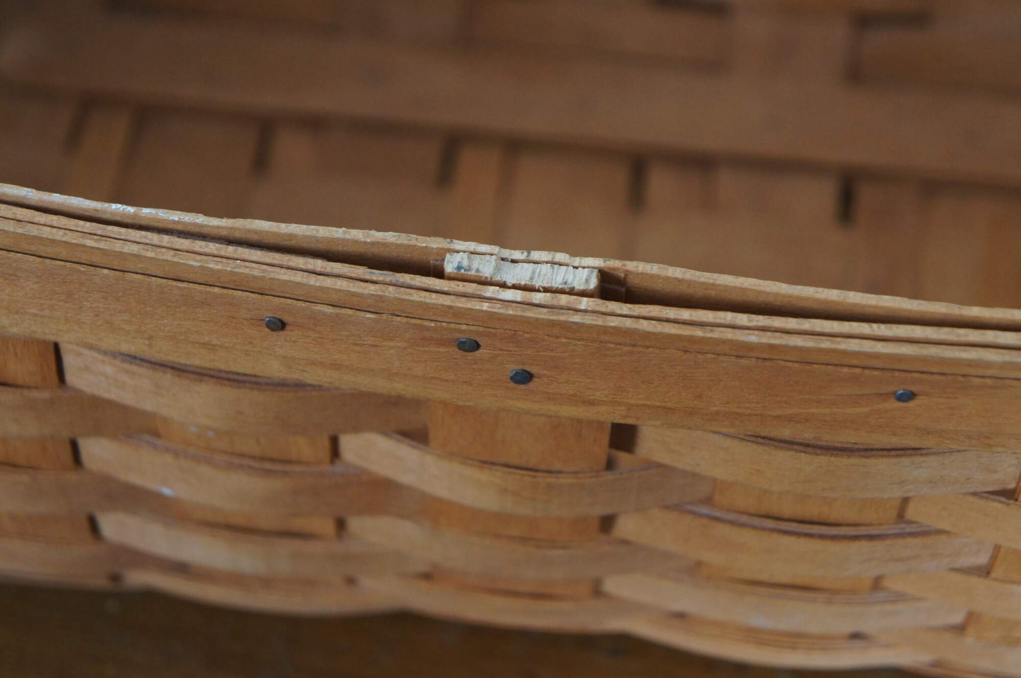 Lot of 5 vintage Longaberger rectangular handwoven maple market baskets. Largest: 1993 Christmas Collection Bayberry Basket with two rotating bail handles and plaid cotton liner; signed US 1993. Next largest also has double rotating bail handles; signed 7K 1994. Of the two medium baskets one is without handles and the other has leather handles; signed MED 1991 and SIA 1991. Smallest basket has leather handles; signed KM 1992.
