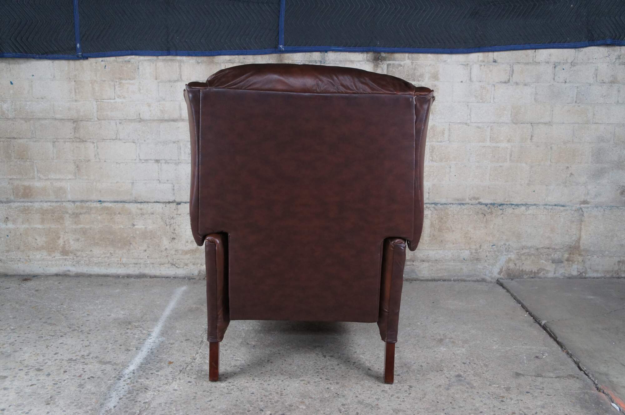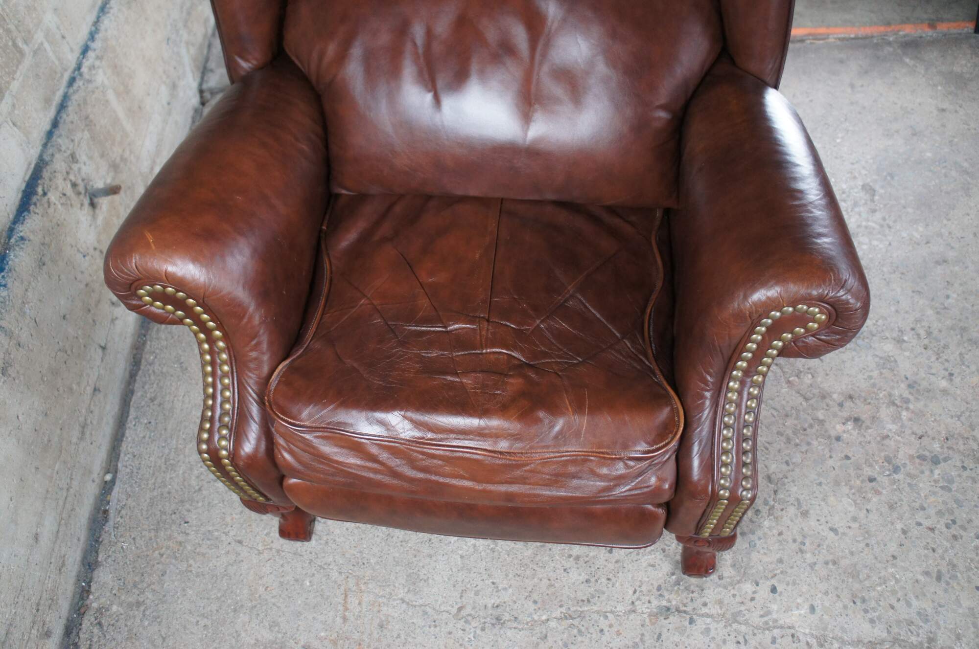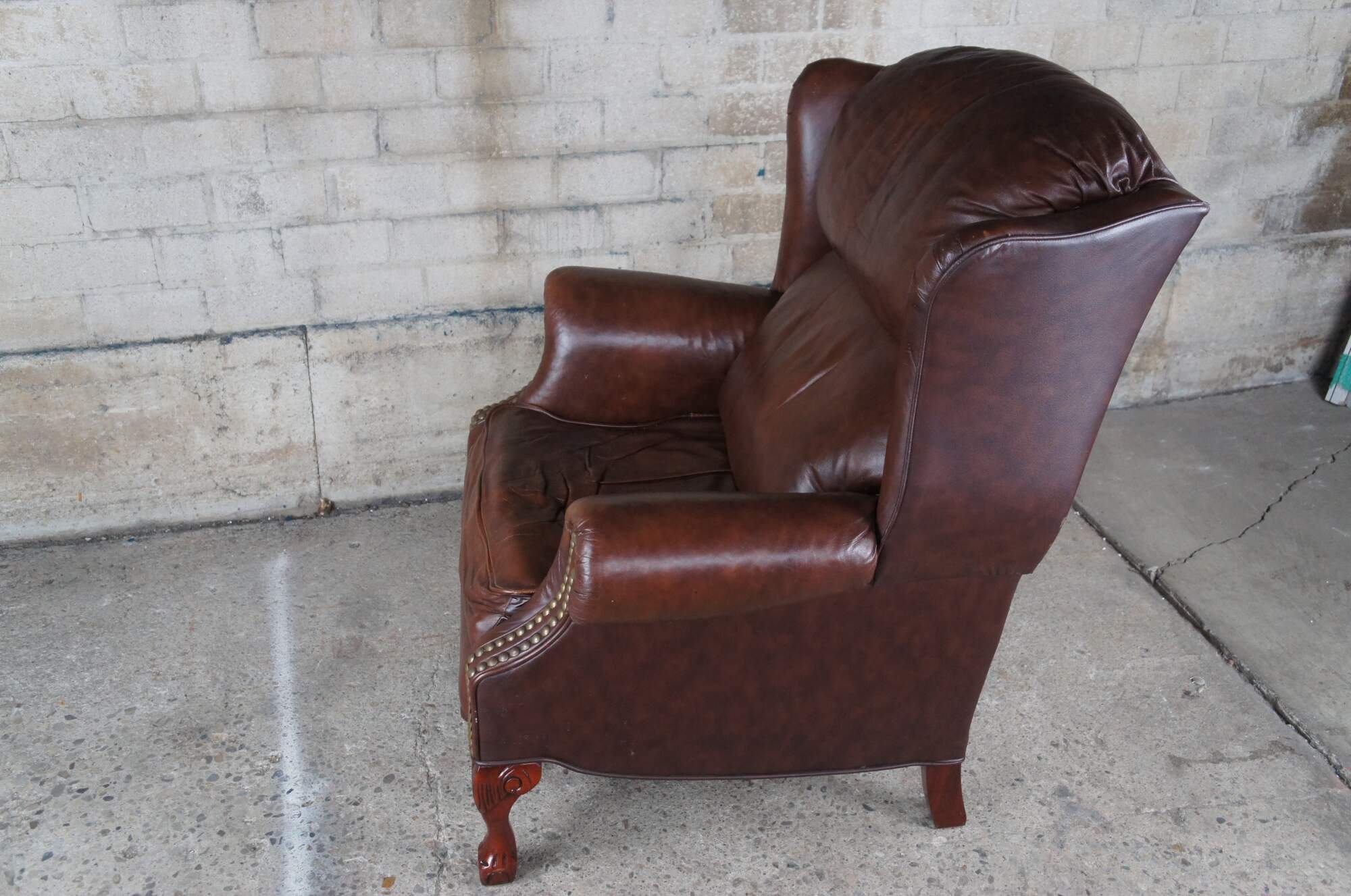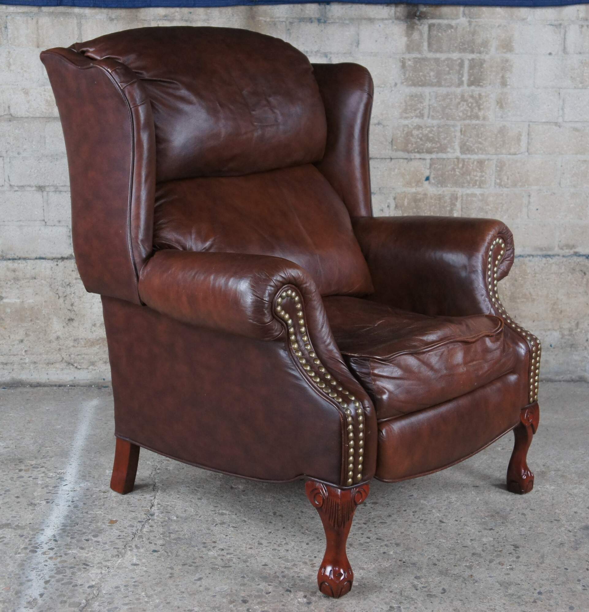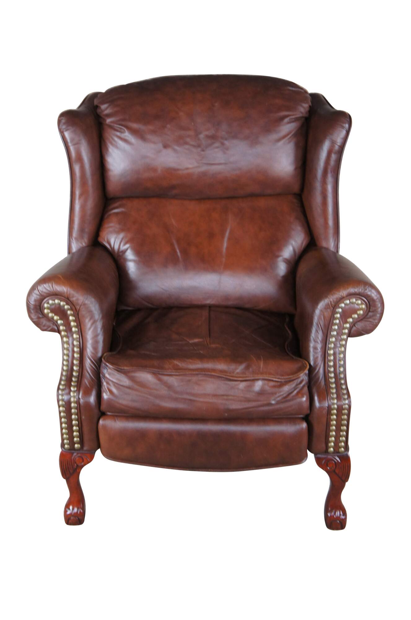 Vintage Bradington Young Maxwell Wingback Club Chair. Drawing inspiration from iconic chippendale styling. Features rolled arms, nailhead trim and acanthus carved ball and claw feet. Chair reclines by pushing back along the seat. Made in America.