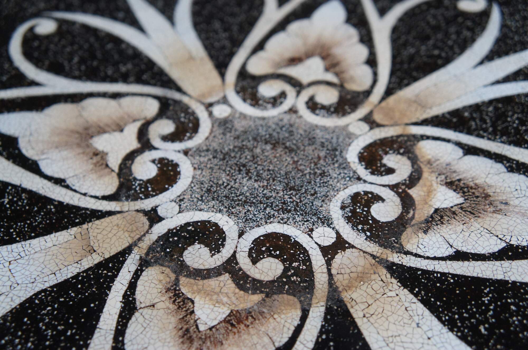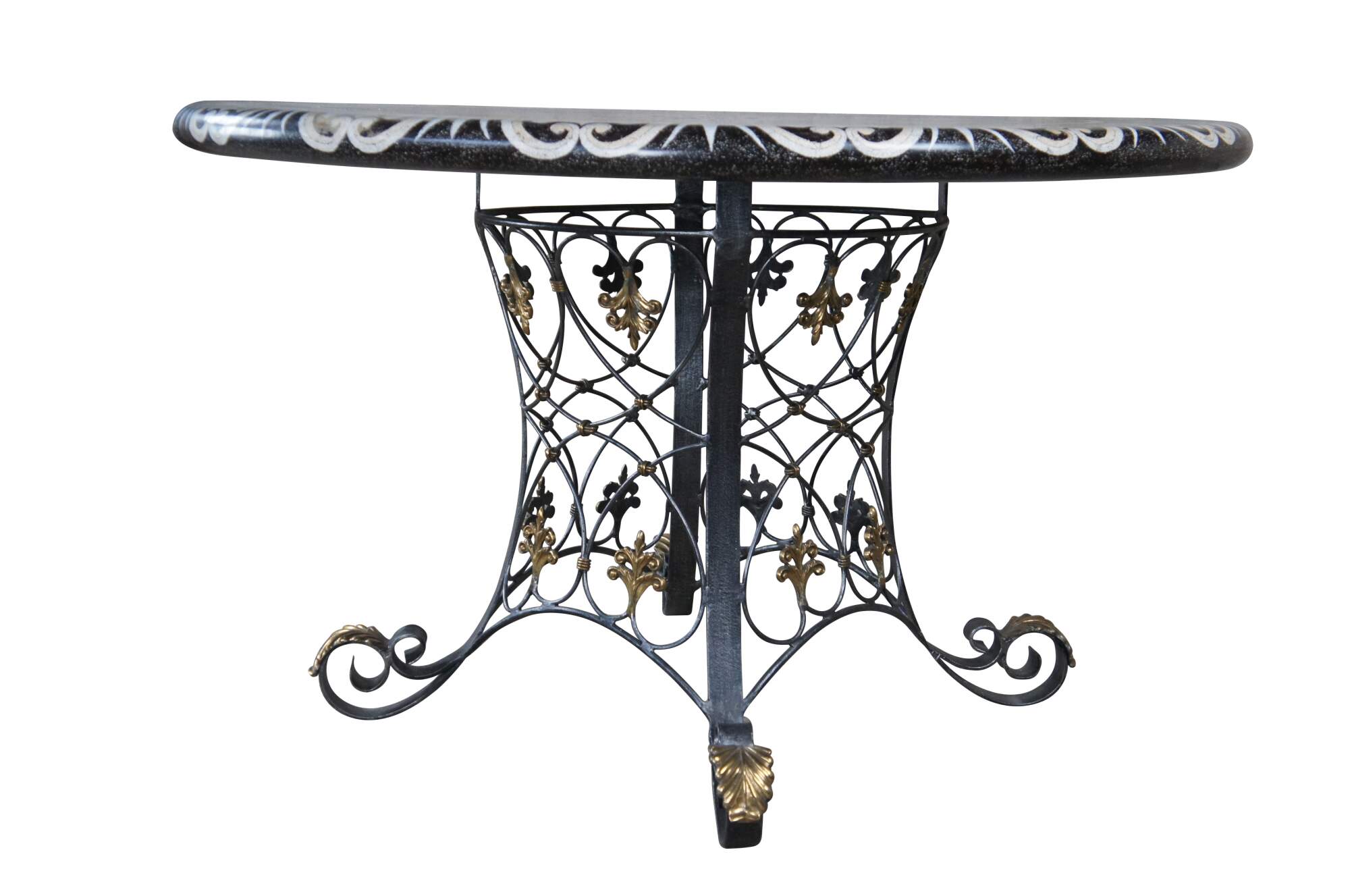 An eye catching handmade Breakfast, Centre or Foyer table by Maitland Smith, circa 1990s. Features a rounded top with inlaid and tessellated stone in the shape of shells and tulips. The table is supported by an intricate iron base with lattice form and cast bronze golden fleurs over scrolled feet with bronze acanthus mounts.