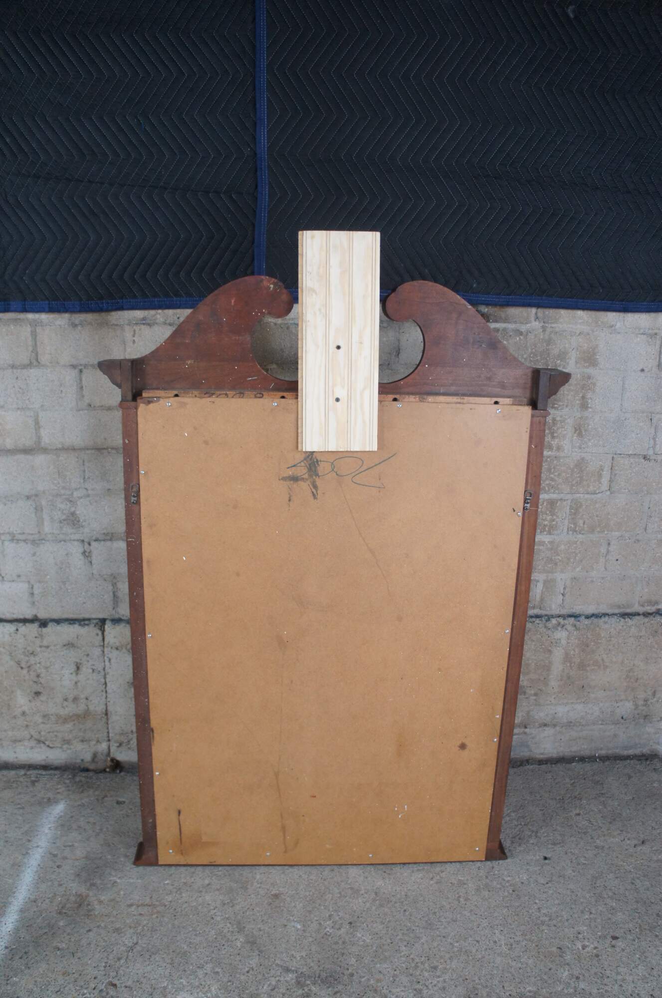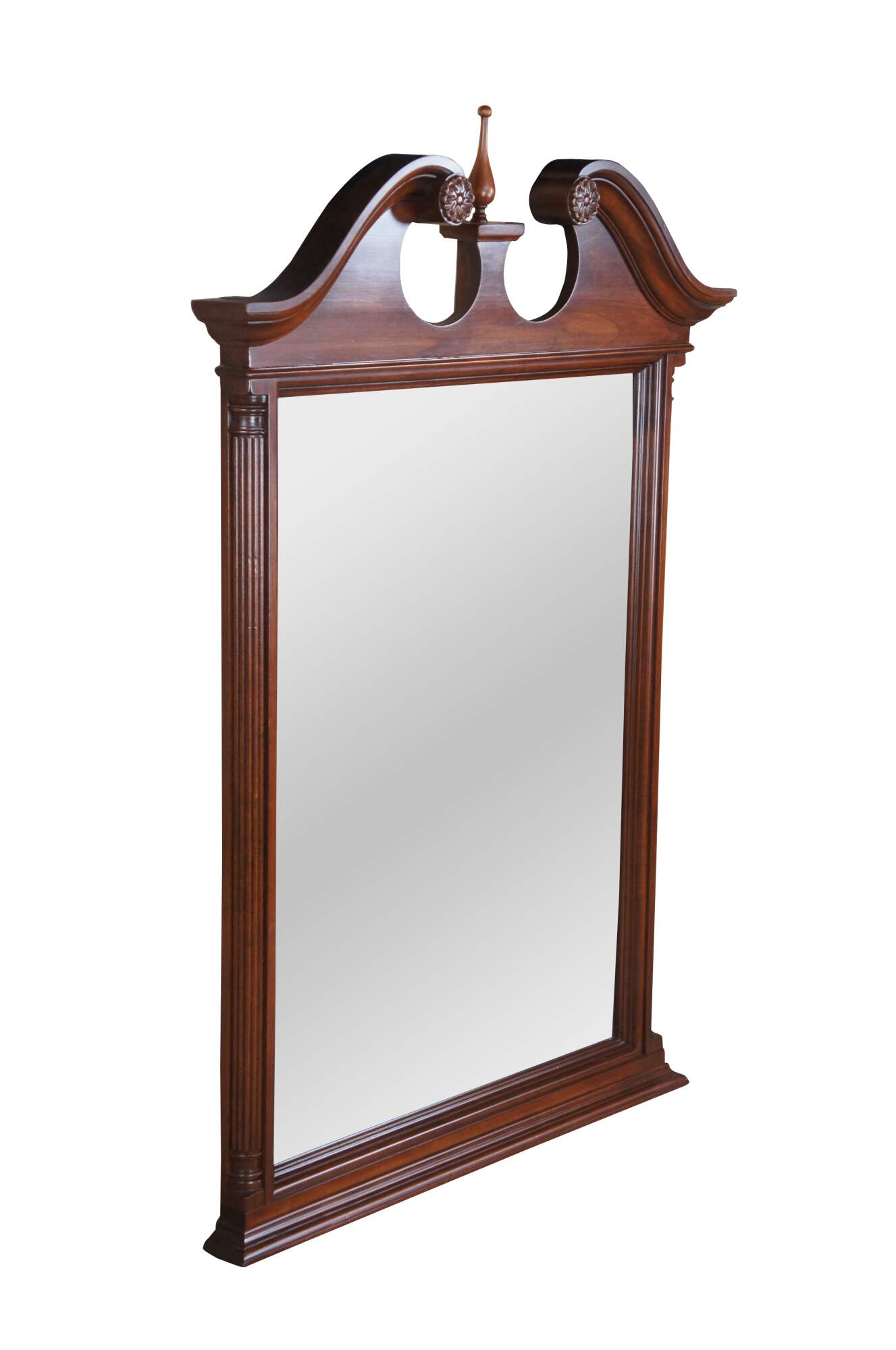Late 20th Century English Georgian / Chippendale style over mantel or wall hanging mirror. Made from cherry with an open pediment, spire shaped finial, beveled glass and quarter cut reeded columns along the side.