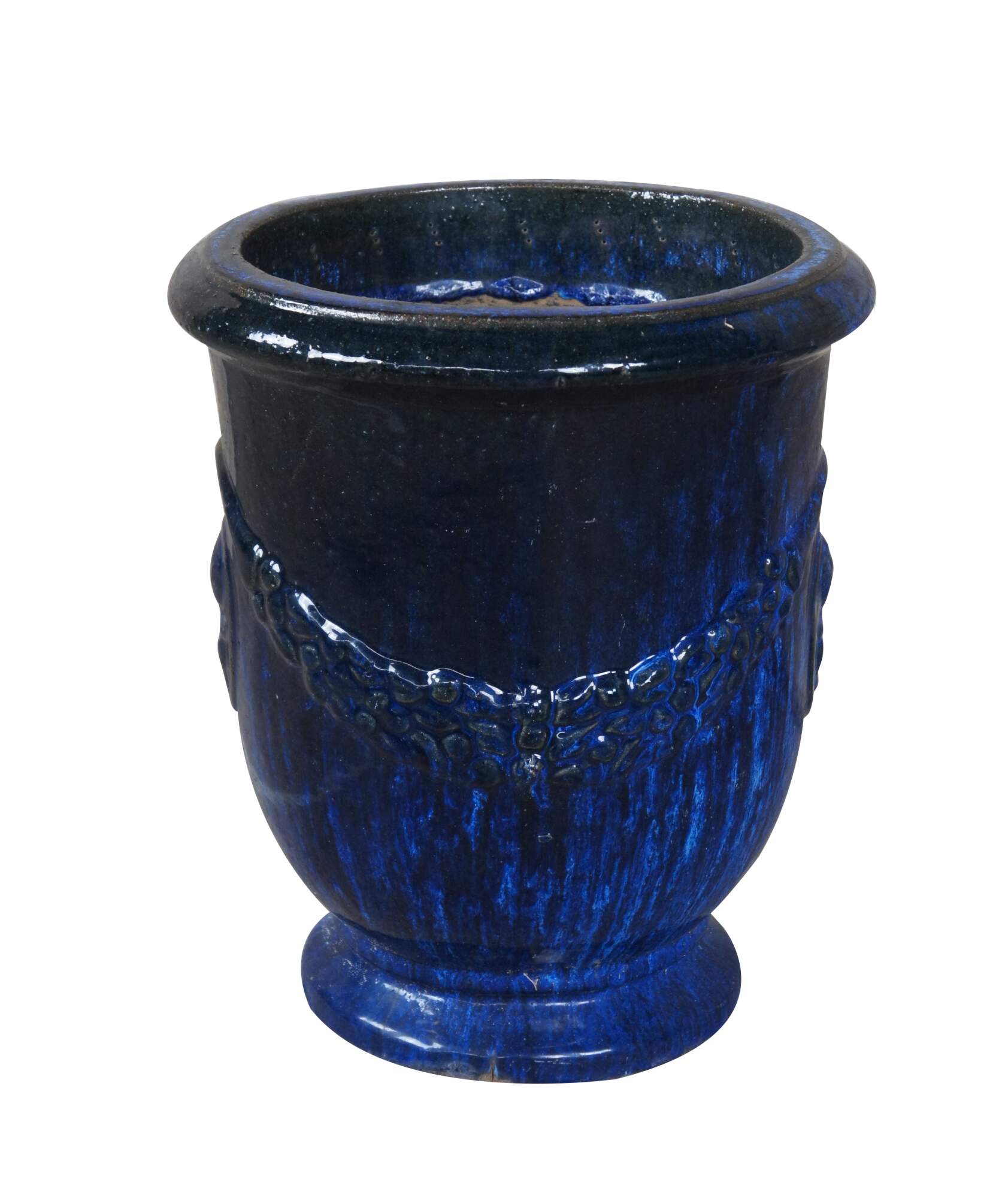 A lovely French clay fired pot in blue glaze with wreath detail and medallion along each side. The raised medallion features a bush in a pot. The beautiful blue glaze has varying shades of blue. Drip hole at the center of base.