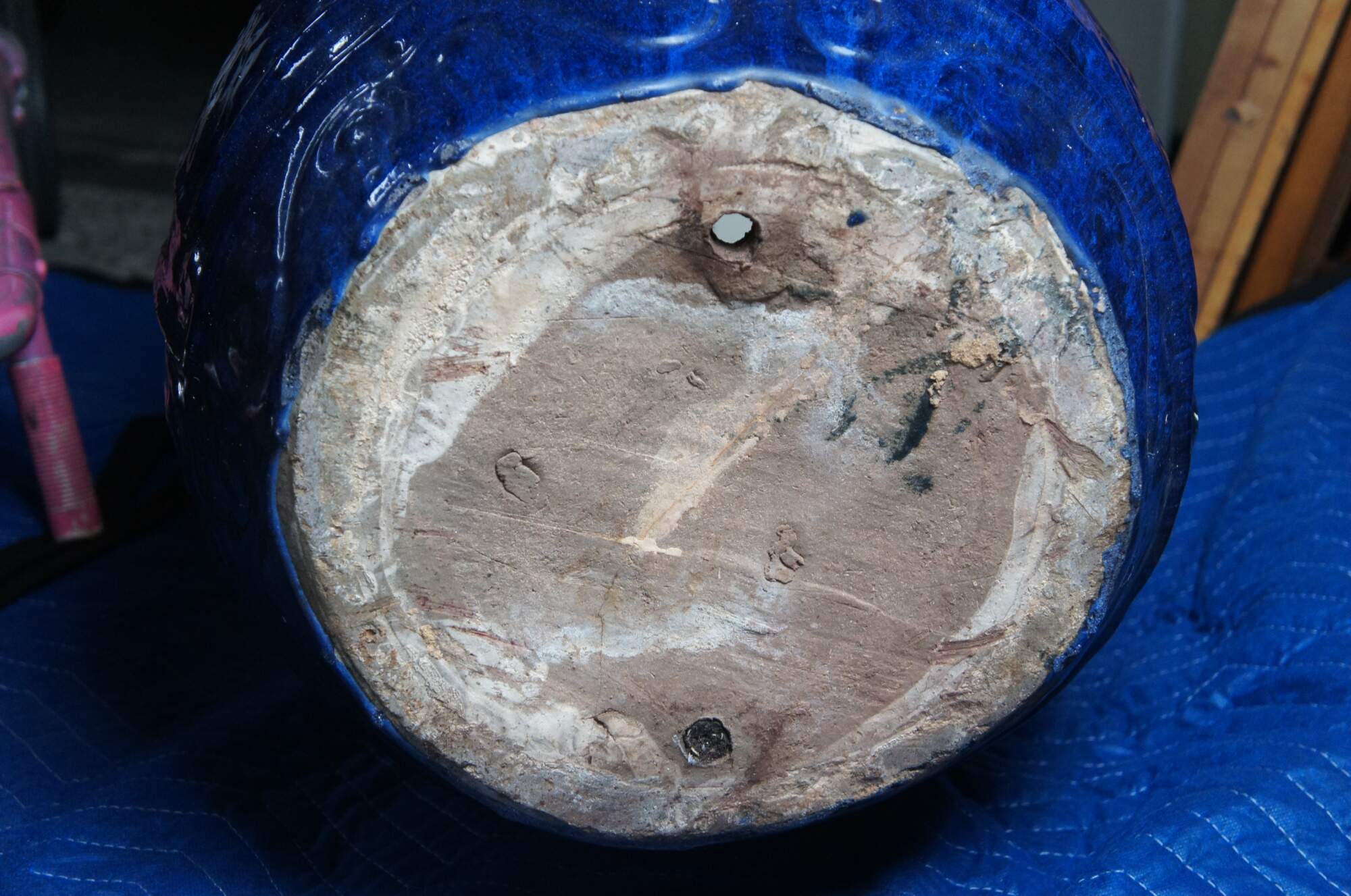 Vintage French clay fired bulbous pot in blue glaze paneling and artistic detail. 2 Drip holes at the base.