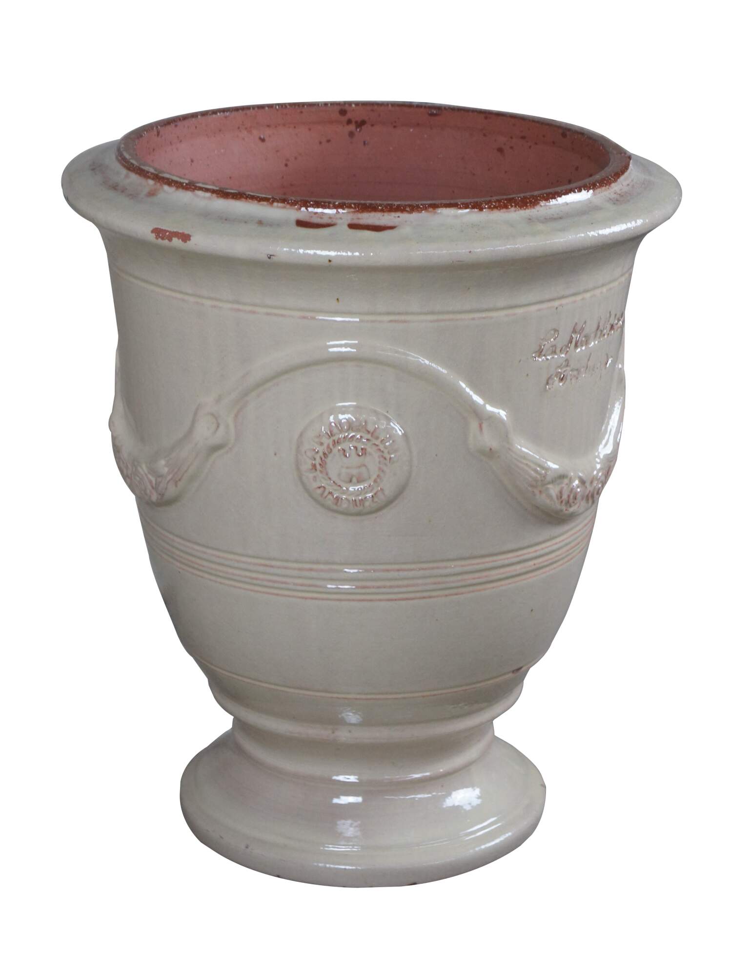 During the 16th and 17th centuries these large vases only appeared in the gardens of the french landed gentry. In the 19th century wealthy families of the local silk merchants in the Anduze region began planning attractive gardens in which they held orange trees. Legend has it that a potter from Anduze in the Cevennes region of southern France was inspired by italian medici vases which he saw at the fair of Beaucaire, these vases where decorated with garlands, fruit and flowers. Leaving these vases outdoors gives a marvellous patina which relates the passage of time, and is recreated today by the ancestors of the Anduze family craftsmen.