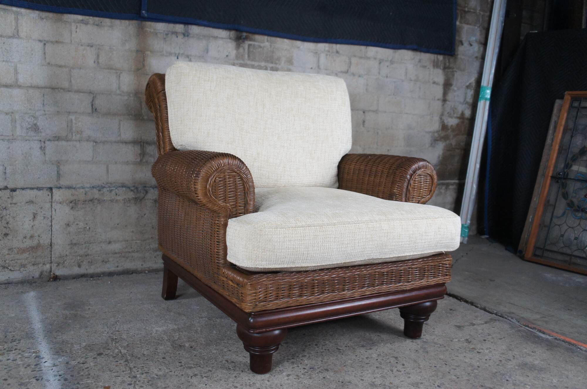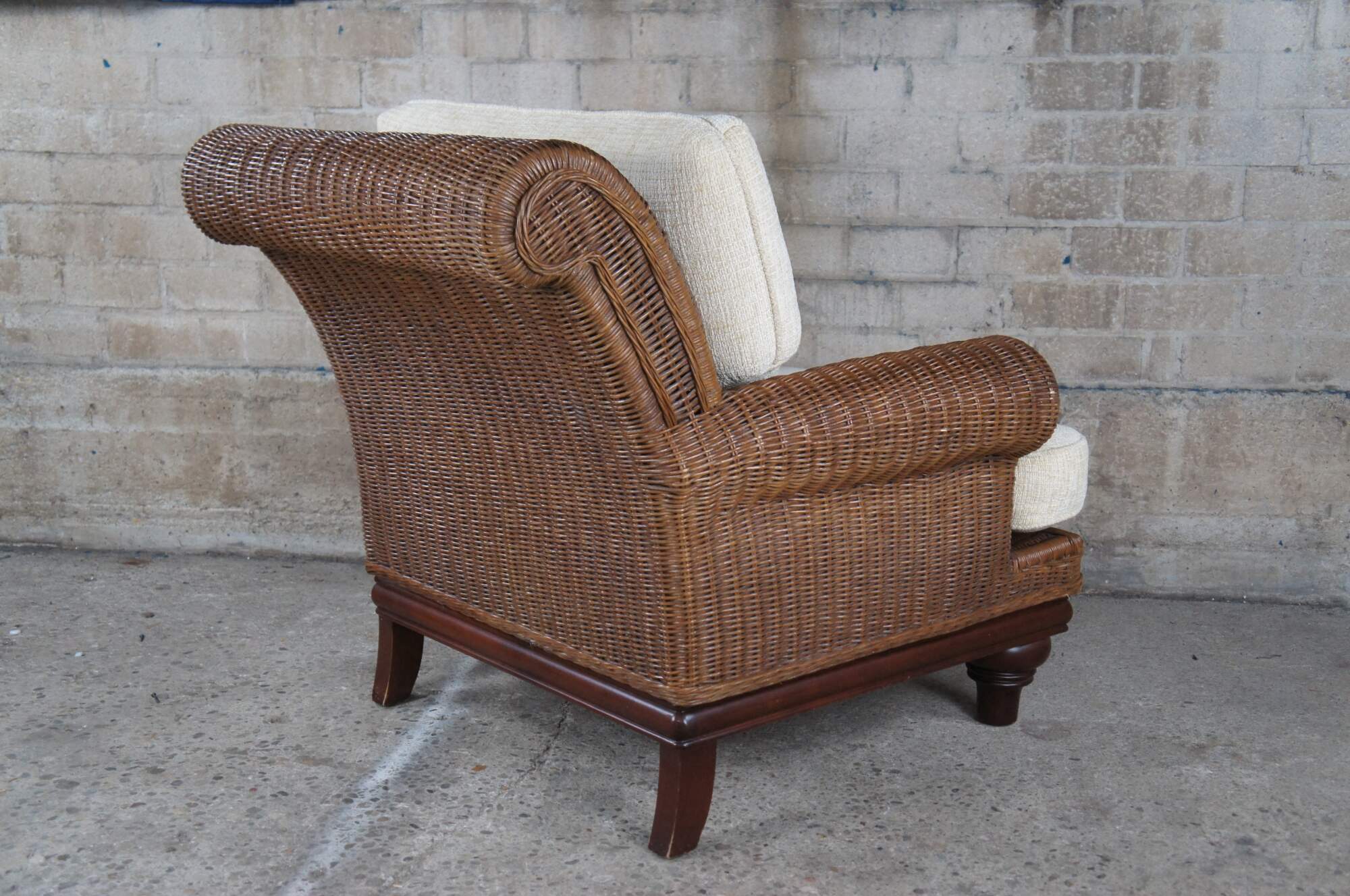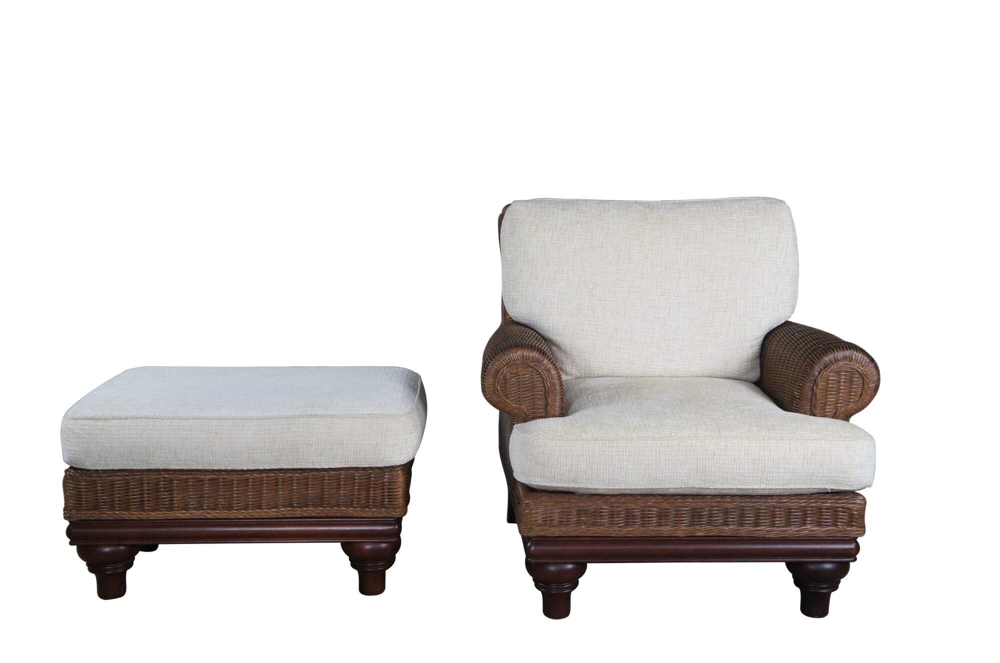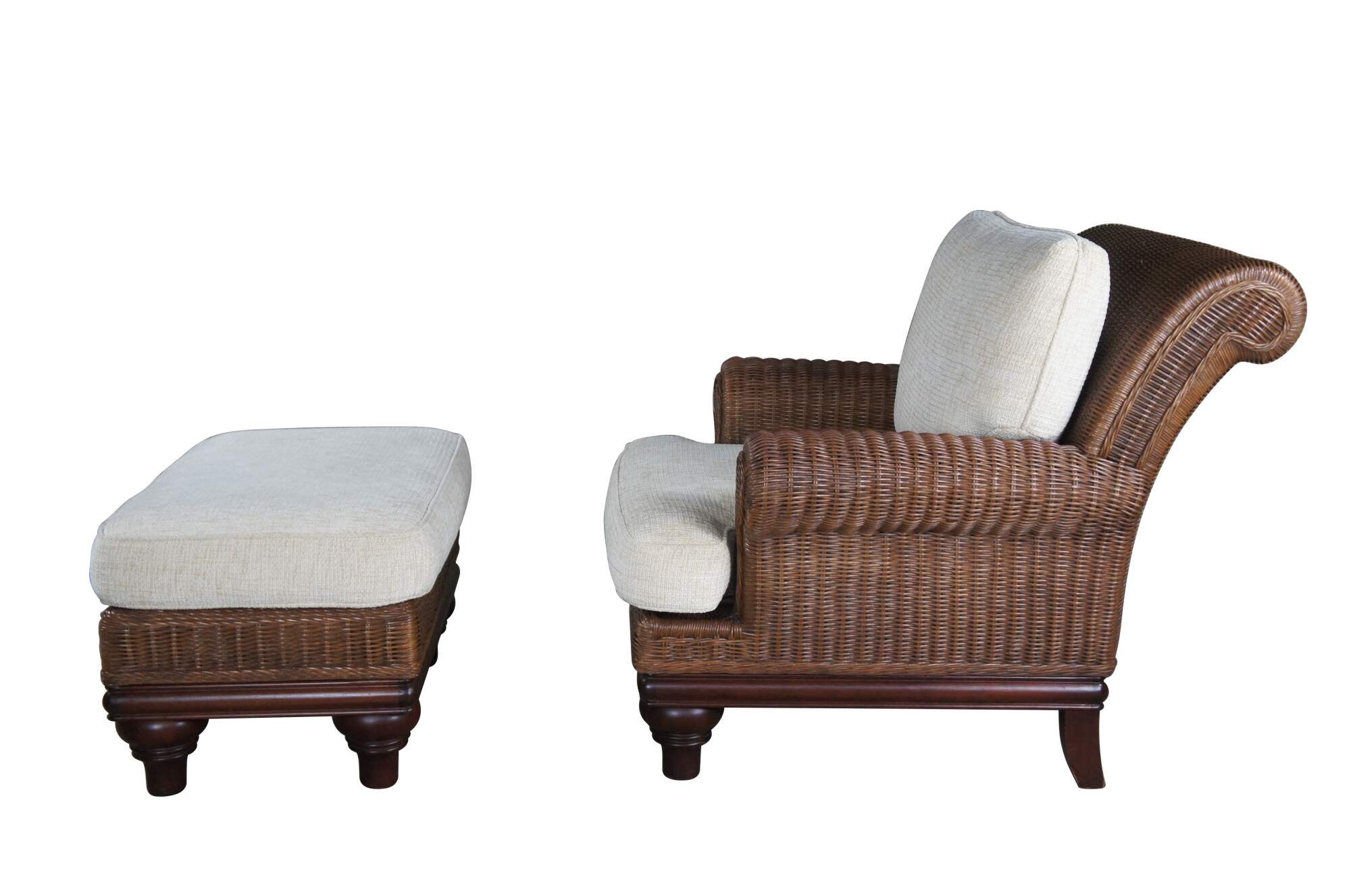 Vintage Lexington Casuals woven rattan armchair and ottoman. Inspired by British Colonial styling. Features a sculptural frame with rolled arms beige cushions and a mahogany finished base. Rests upon turned turnip feet.