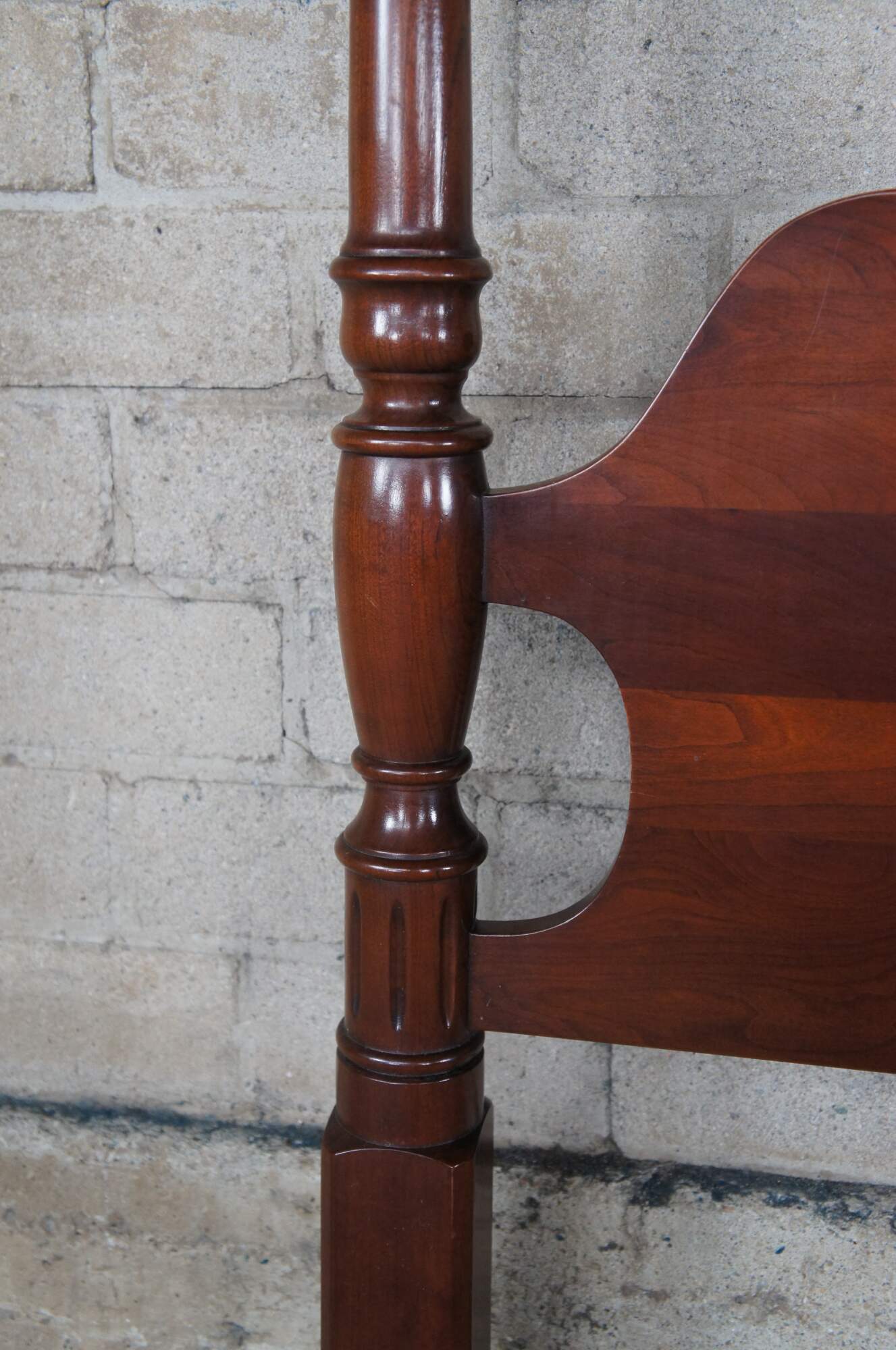 Early 1970s solid cherry poster bed by Statton. Part of their Old Towne Collection. Features a rich cherry finish with a contoured headboard, turned posts, trophy finials, turnip feet and brass brackets along the front.