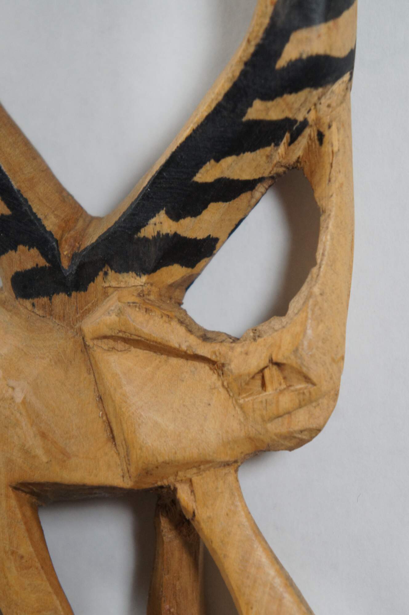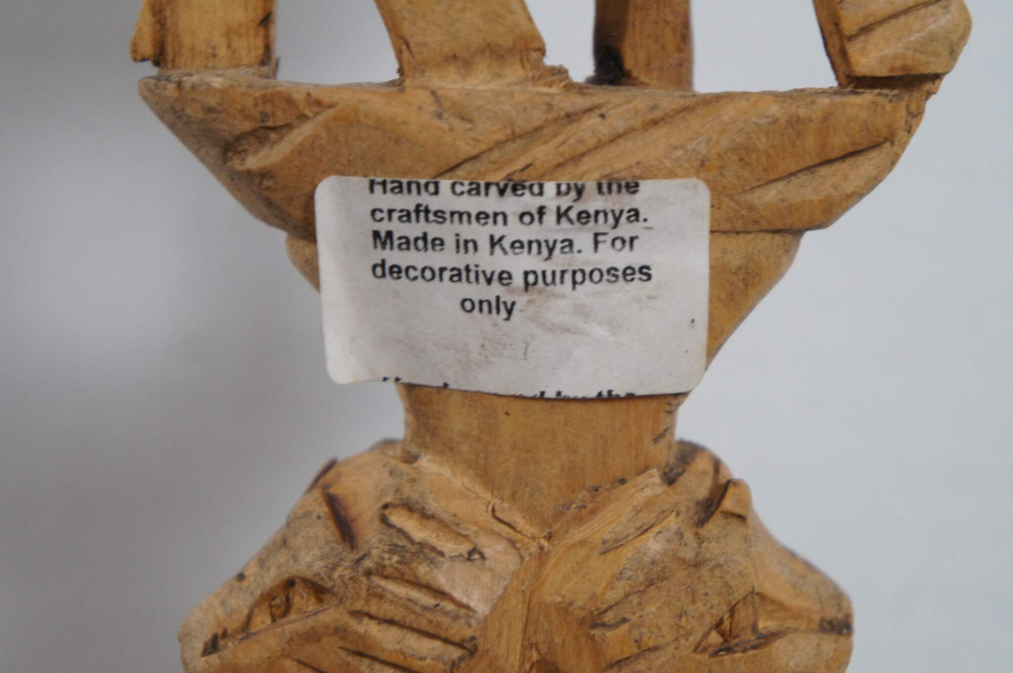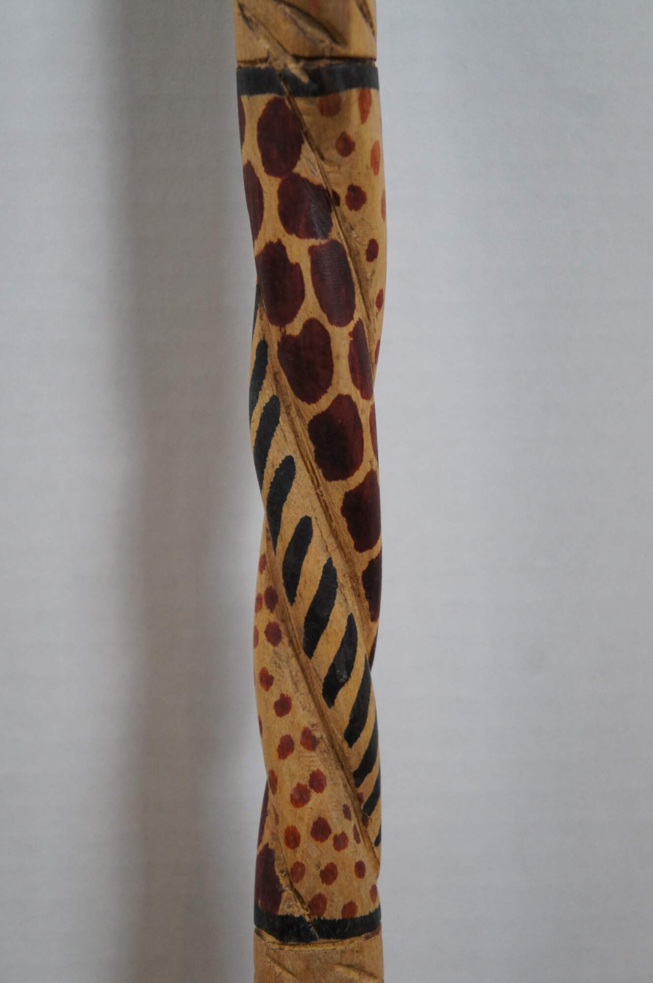 Vintage African folk art walking stick / cane, hand carved with a loop handle, elephant with trunk raised, pair of lion heads and twisted shaft, stained / painted with the stripes and spots of other native animals / giraffes. Hand carved by the craftsmen of Kenya. Made in Kenya.