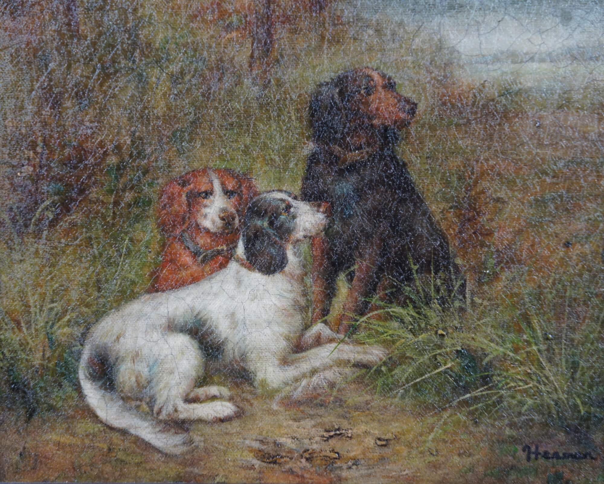 Two vintage oil on canvas paintings, each showing a trio of spaniels / British style hunting dogs in a picturesque landscape, with a crackled antiqued finish. One signed Dellano (Dellamo?) in lower left. The other signed Herman in lower right. Matching carved and deeply beveled gilt frames.