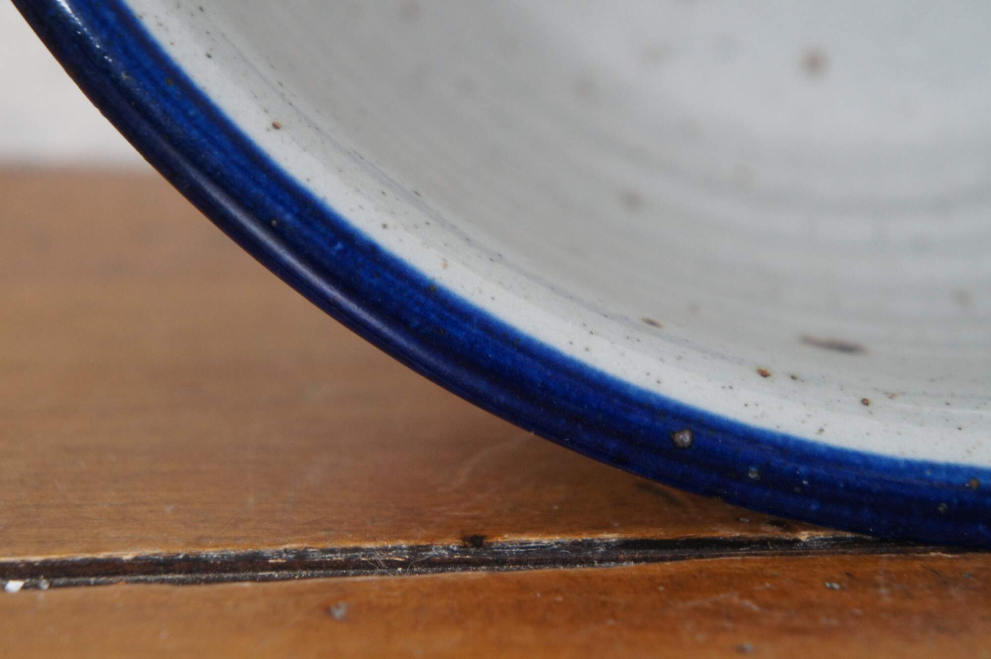 Vintage gray speckled stoneware bowl with blue edge and decorated with blue folk art hearts. Crafted by Bastine Pottery of Noblesville, Indiana, founded by Dan Bastine and his wife in 1978. Signed on base: Bastine 1992 IND.