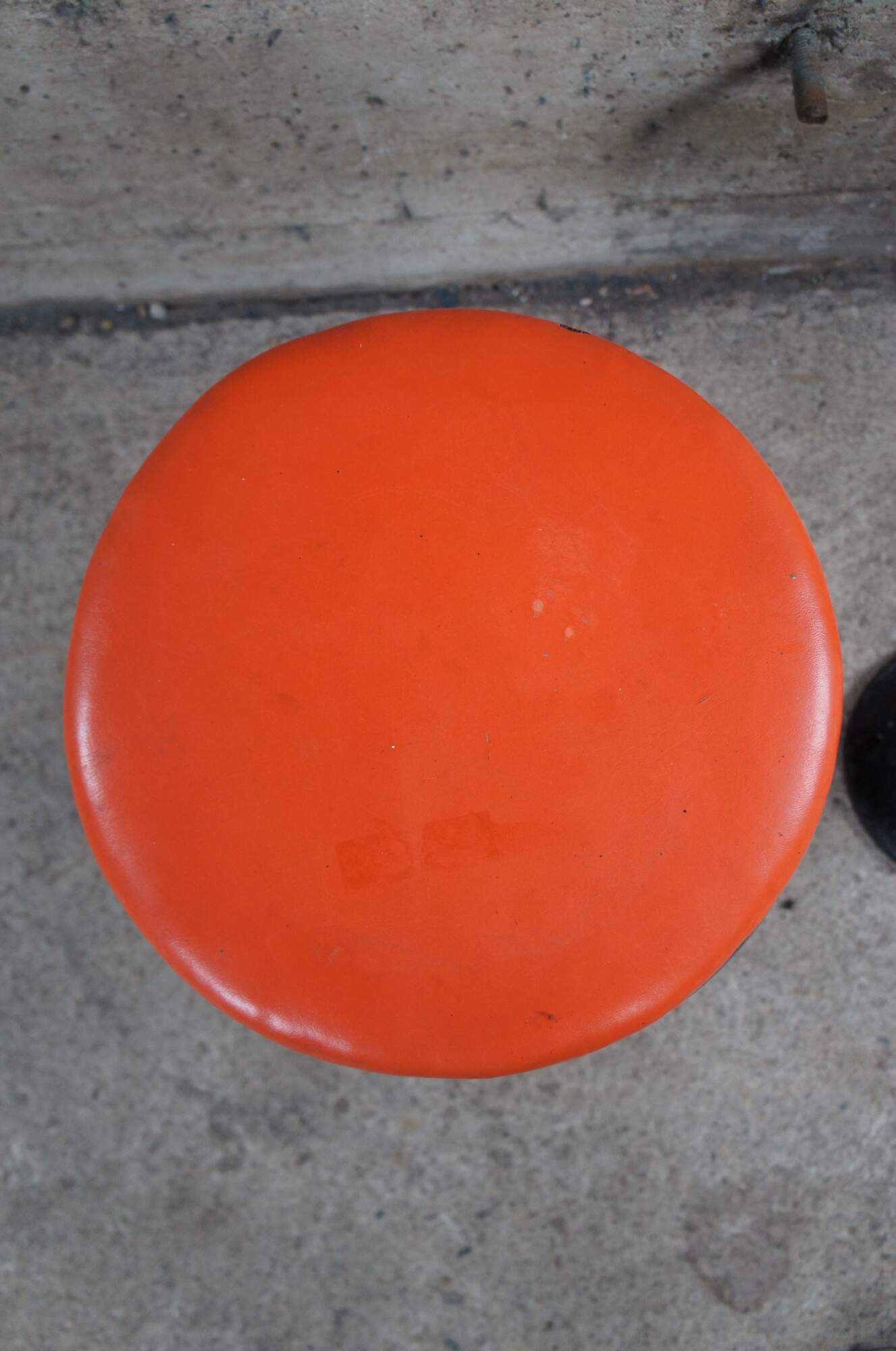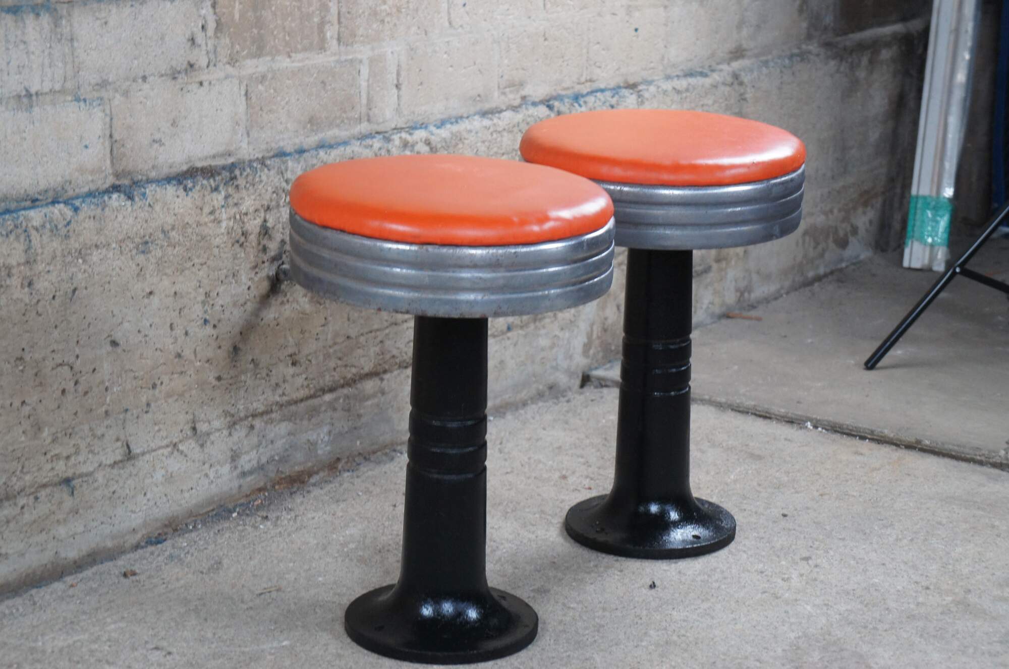Pair of Late Art Deco Retro Soda / Fountain stools. Made from chrome with a cast iron base and orange seat. Each stool swivels.