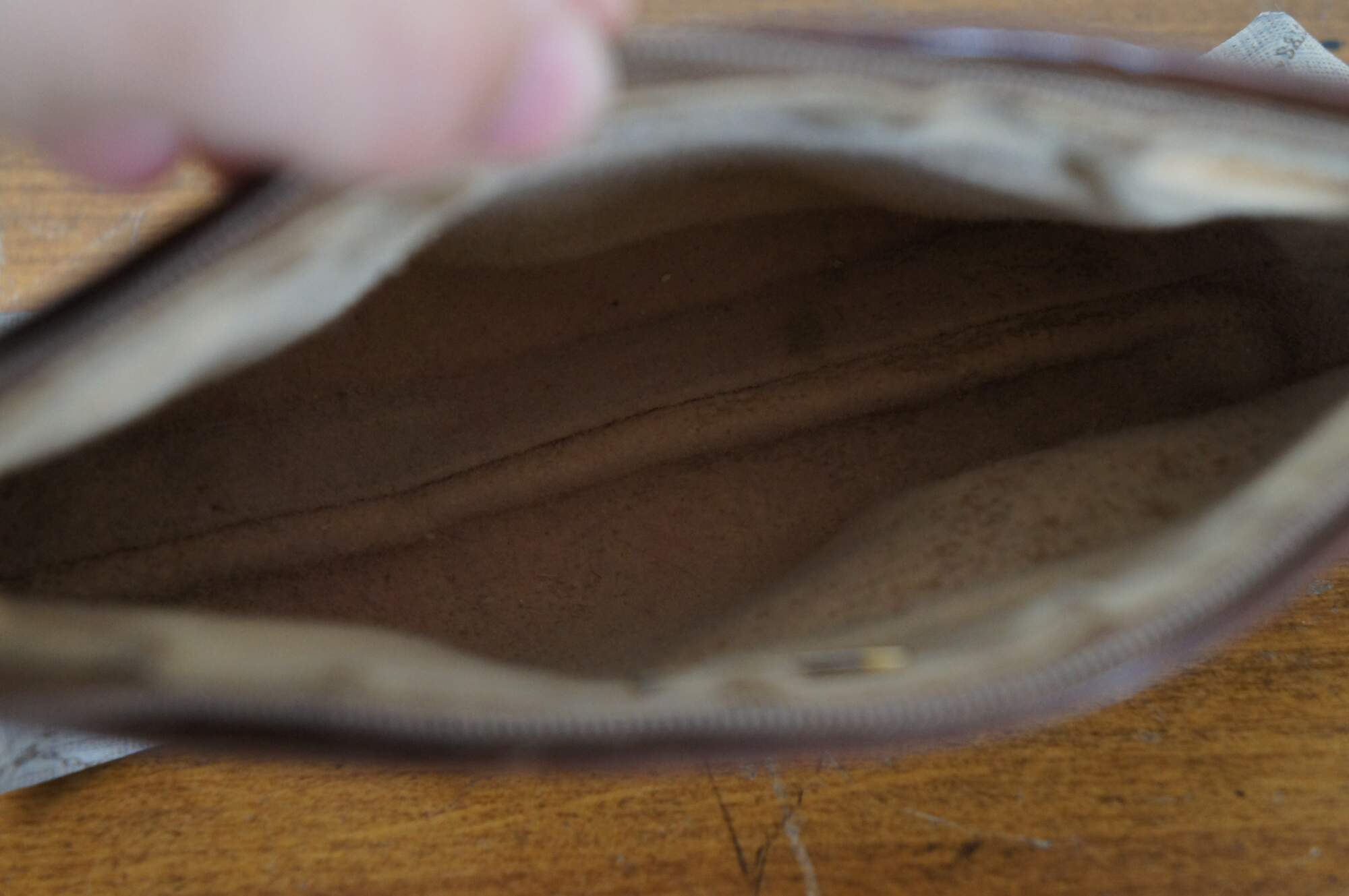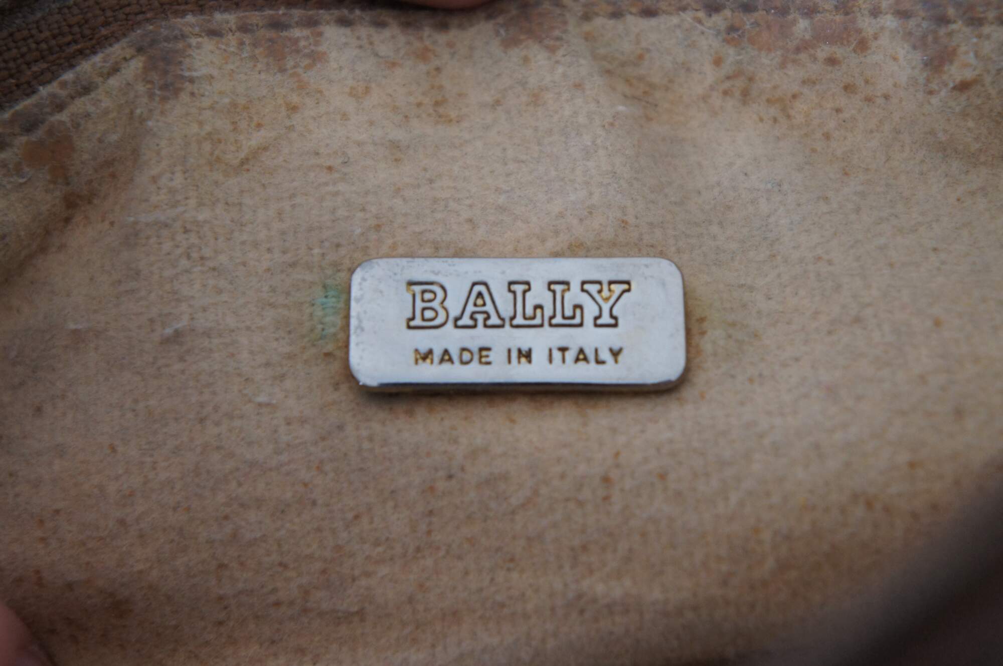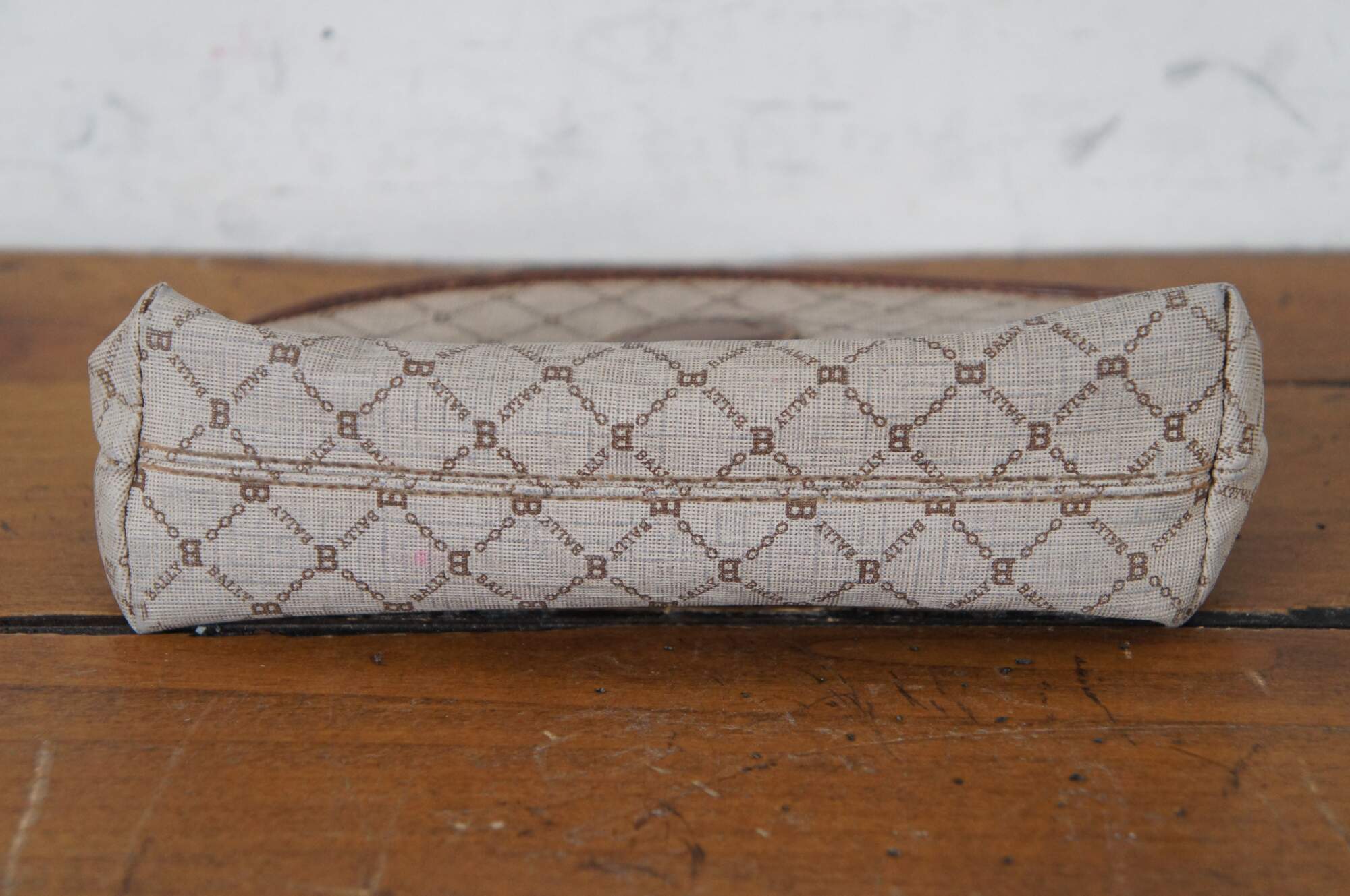 Vintage Bally zip closure make up / cosmetic / toiletry bag in beige monogram lattice print canvas with brown leather trim. Crochet zipper pull and flannel interior. Made in Italy.