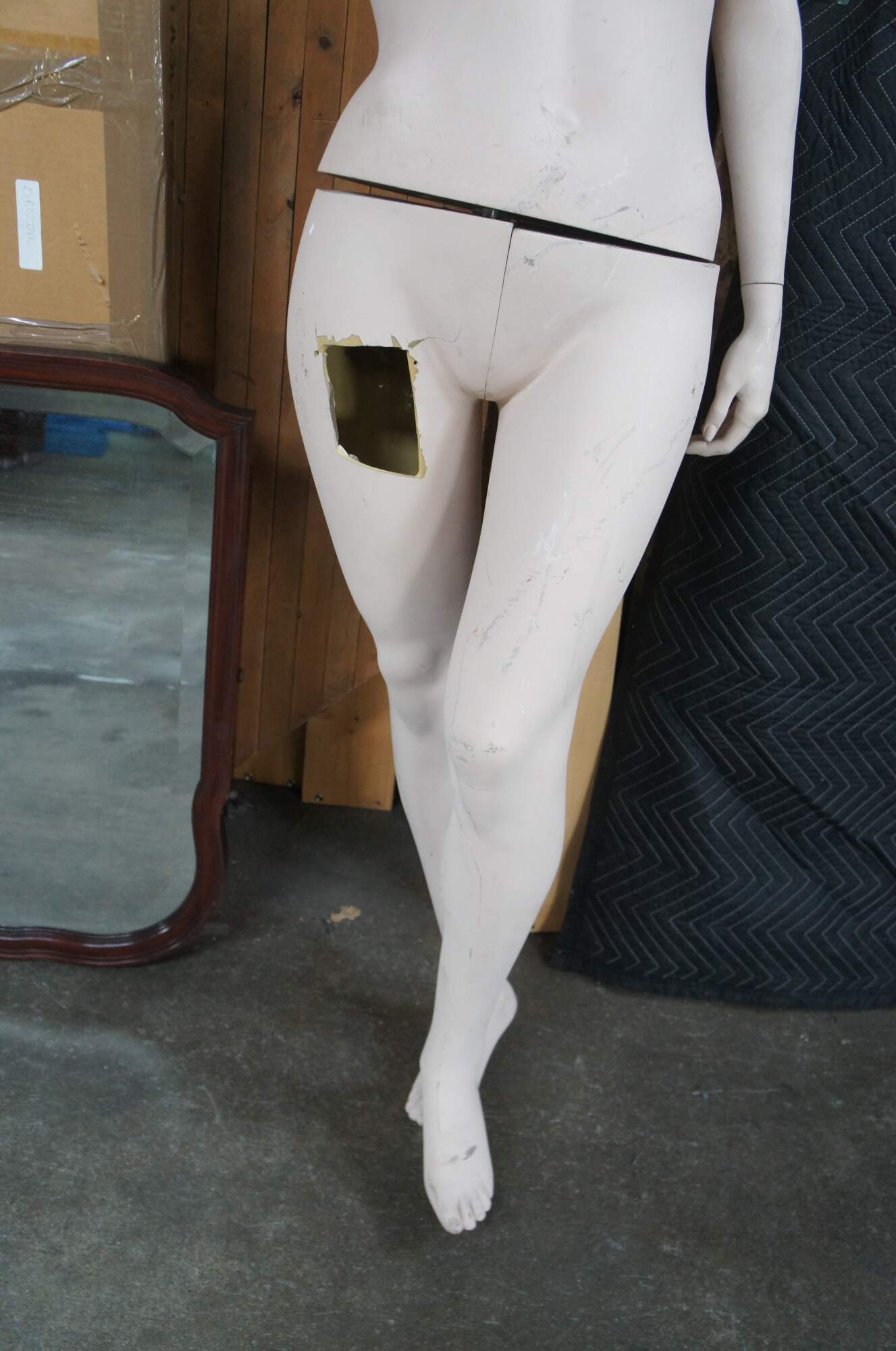 Fair condition, wear and distressing, missing arm, hole in leg, splitting, no base.