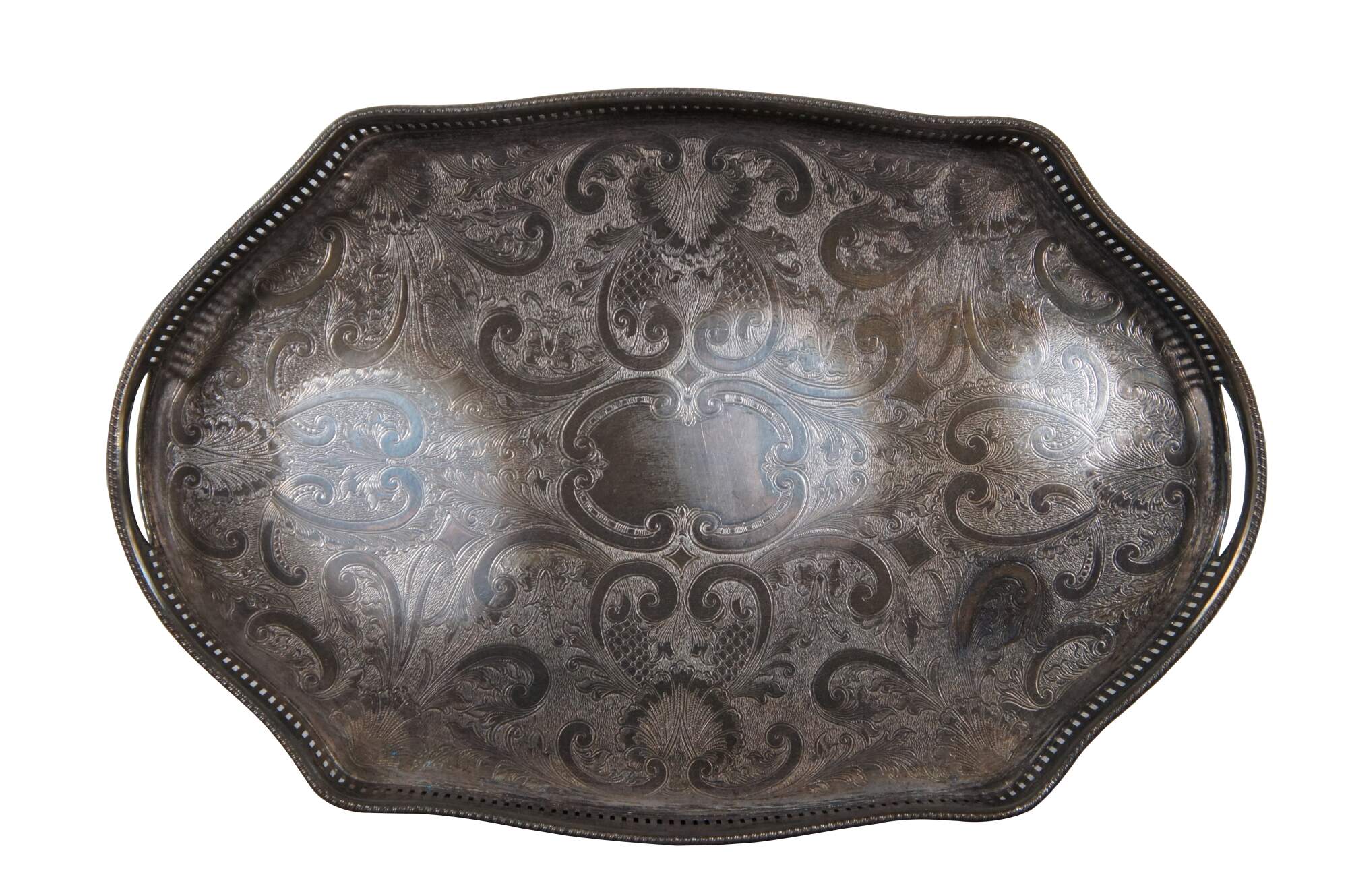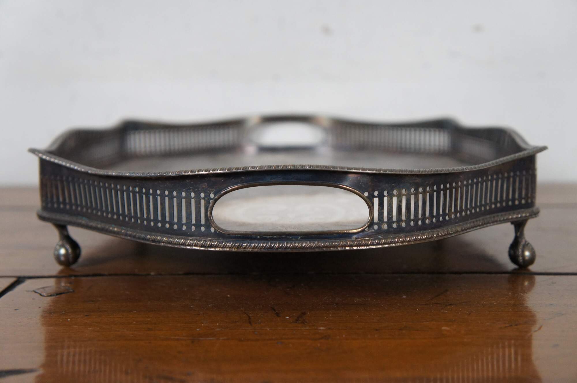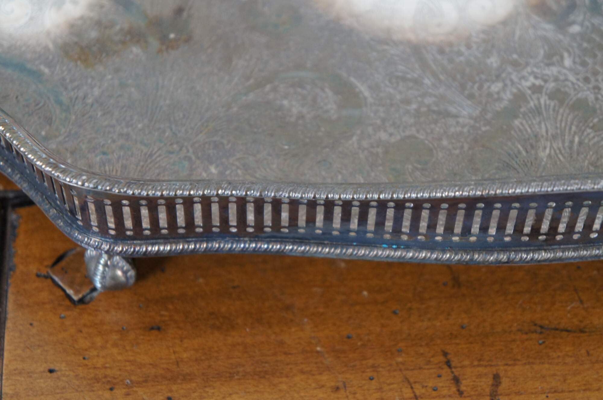 Vintage Reed & Barton silver plate on copper, number 402, serving / bar / vanity tray. Rounded rectangular / oblong form with scalloped sides, raised pierced reticulated gallery edge with handles on either end and rope twist trim, four ball and claw feet and surface etched with scallops and florals. Made in Sheffield, England.