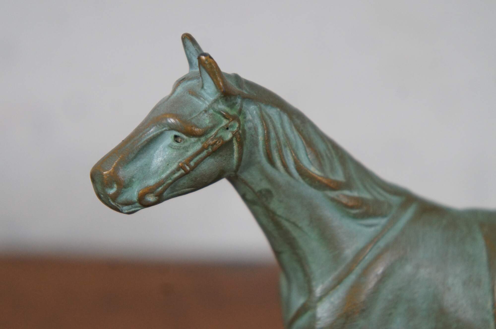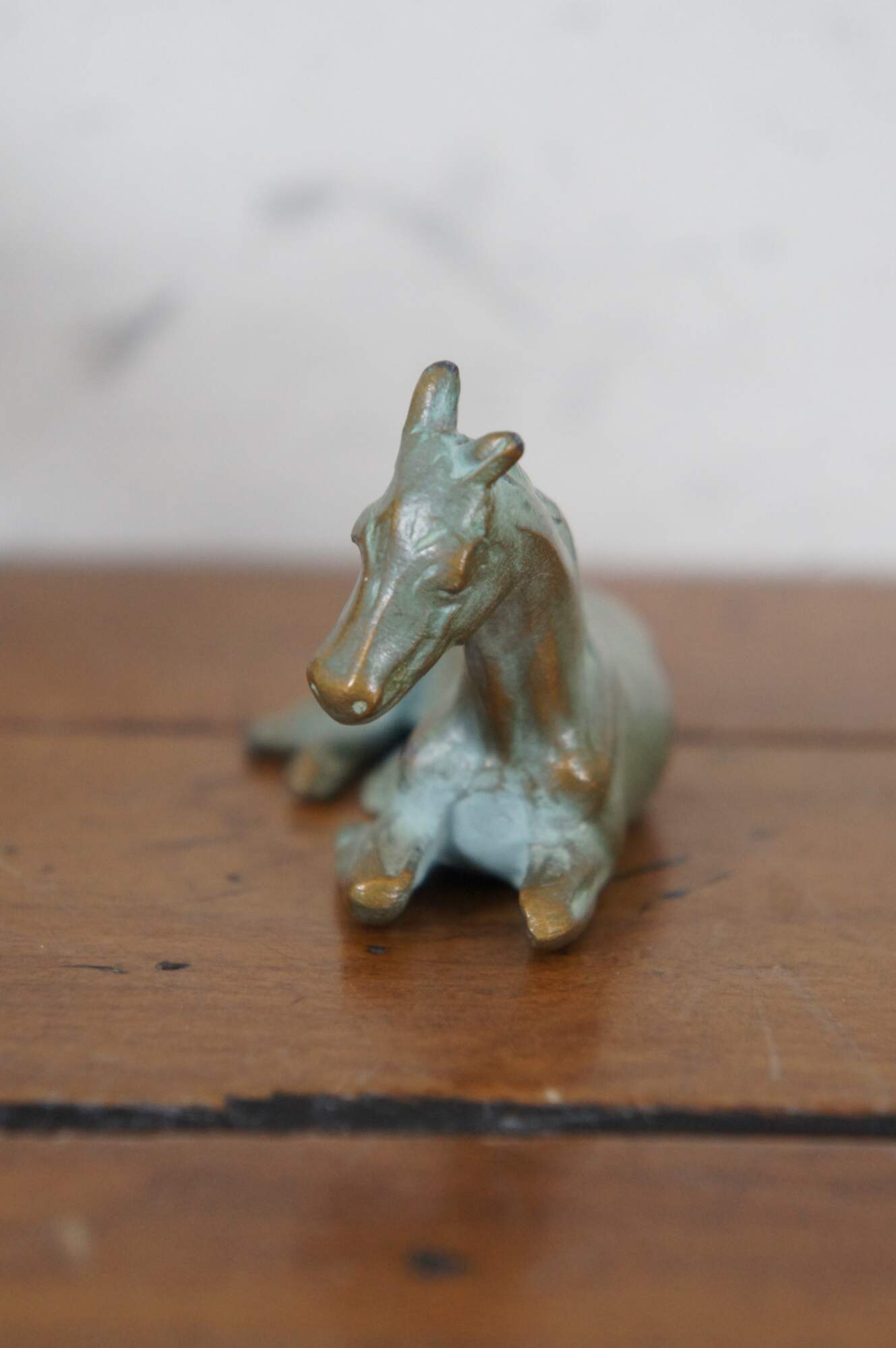 Vintage pair of two patinated brass equestrian horse sculptures / figurines / paperweights. Made of brass with added patina, featuring a mother and her baby foal.