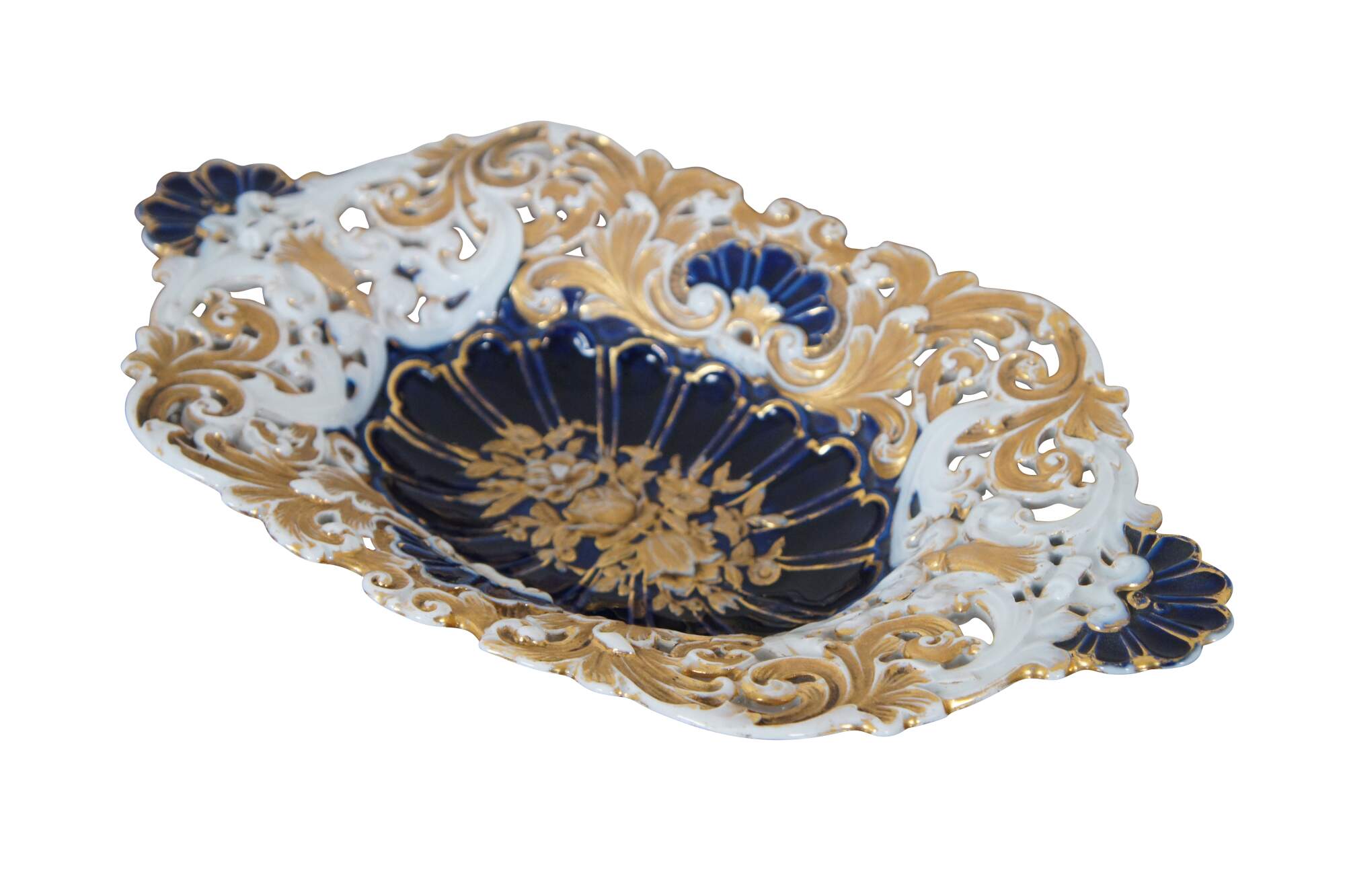 Antique German Meissen porcelain footed cabinet plate / centerpiece bowl / serving platter / compote featuring scalloped oval form with low relief reticulated design of gold gilt roses and acanthus leaves with cobalt blue shell handles and footed base. 1815 to 1860 crossed swords mark.