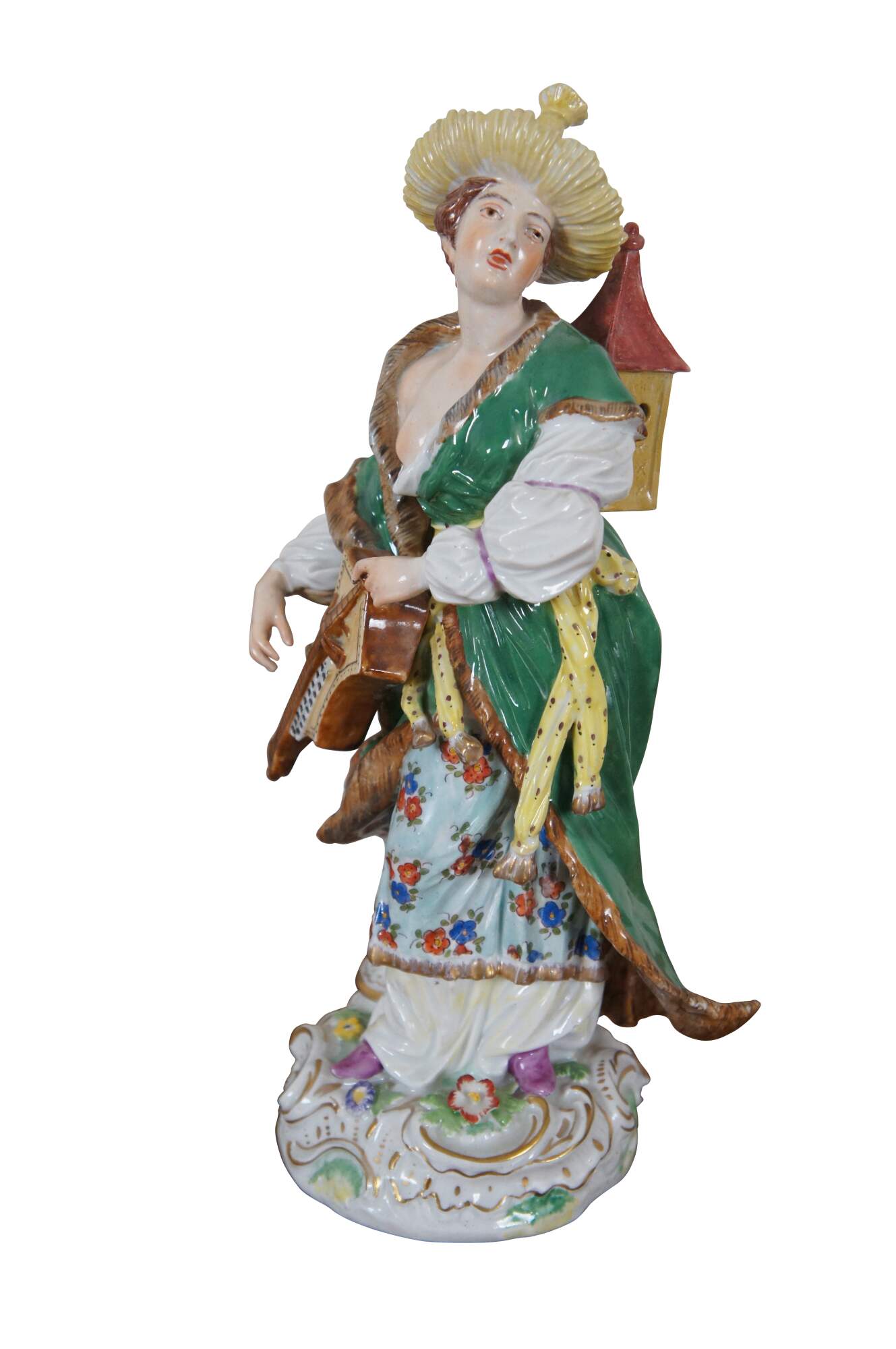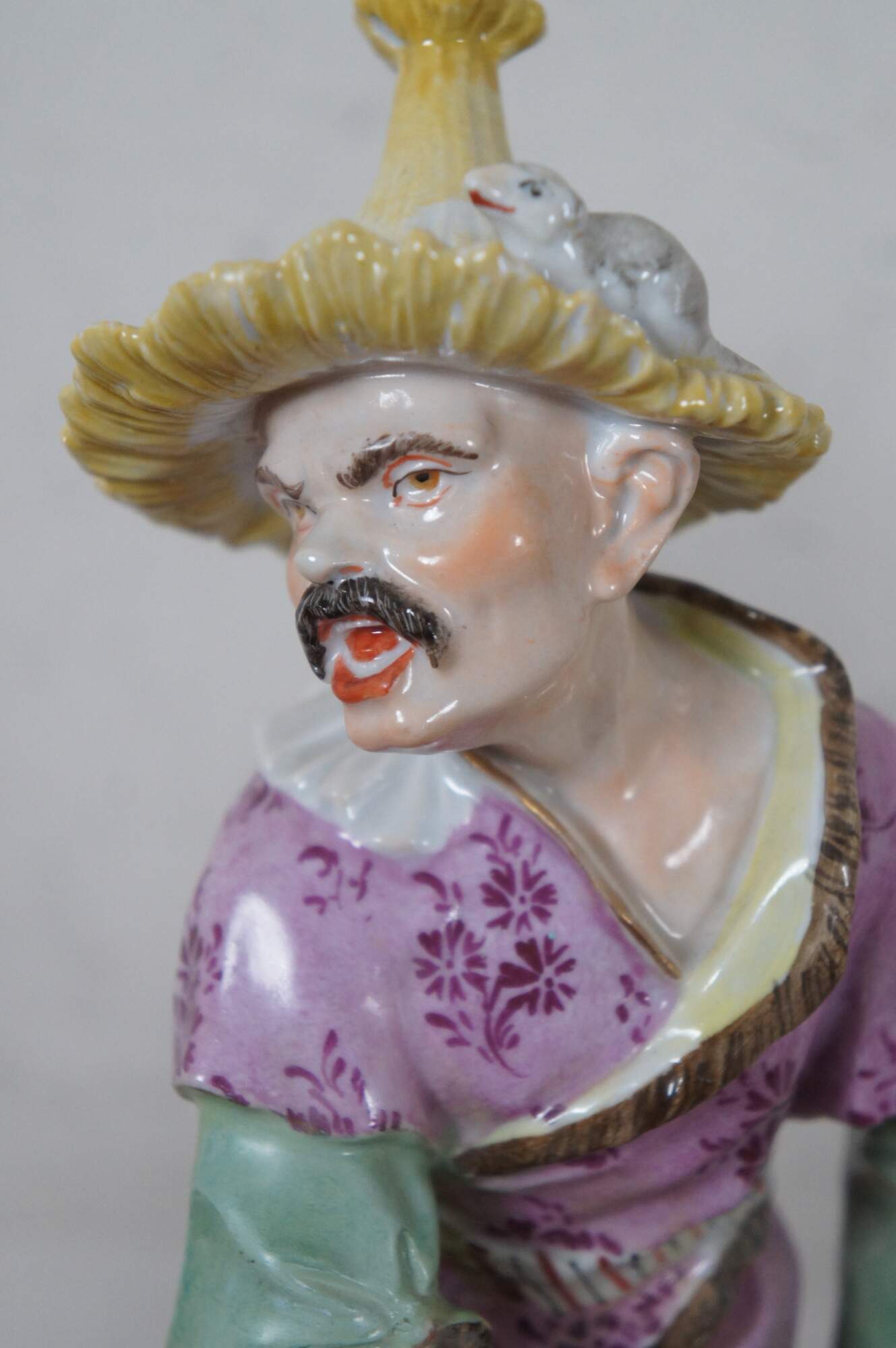 Antique 19th century Carl Thieme German Dresden porcelain polychrome figurines featuring a Malabar man and woman playing instruments, singing, and carrying pet birds / marmots.