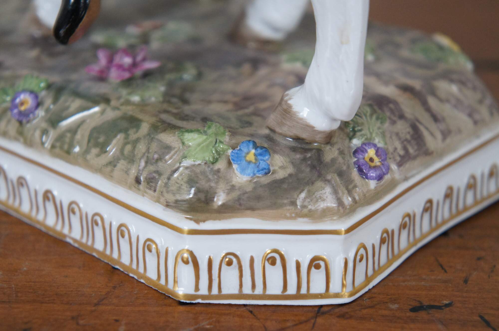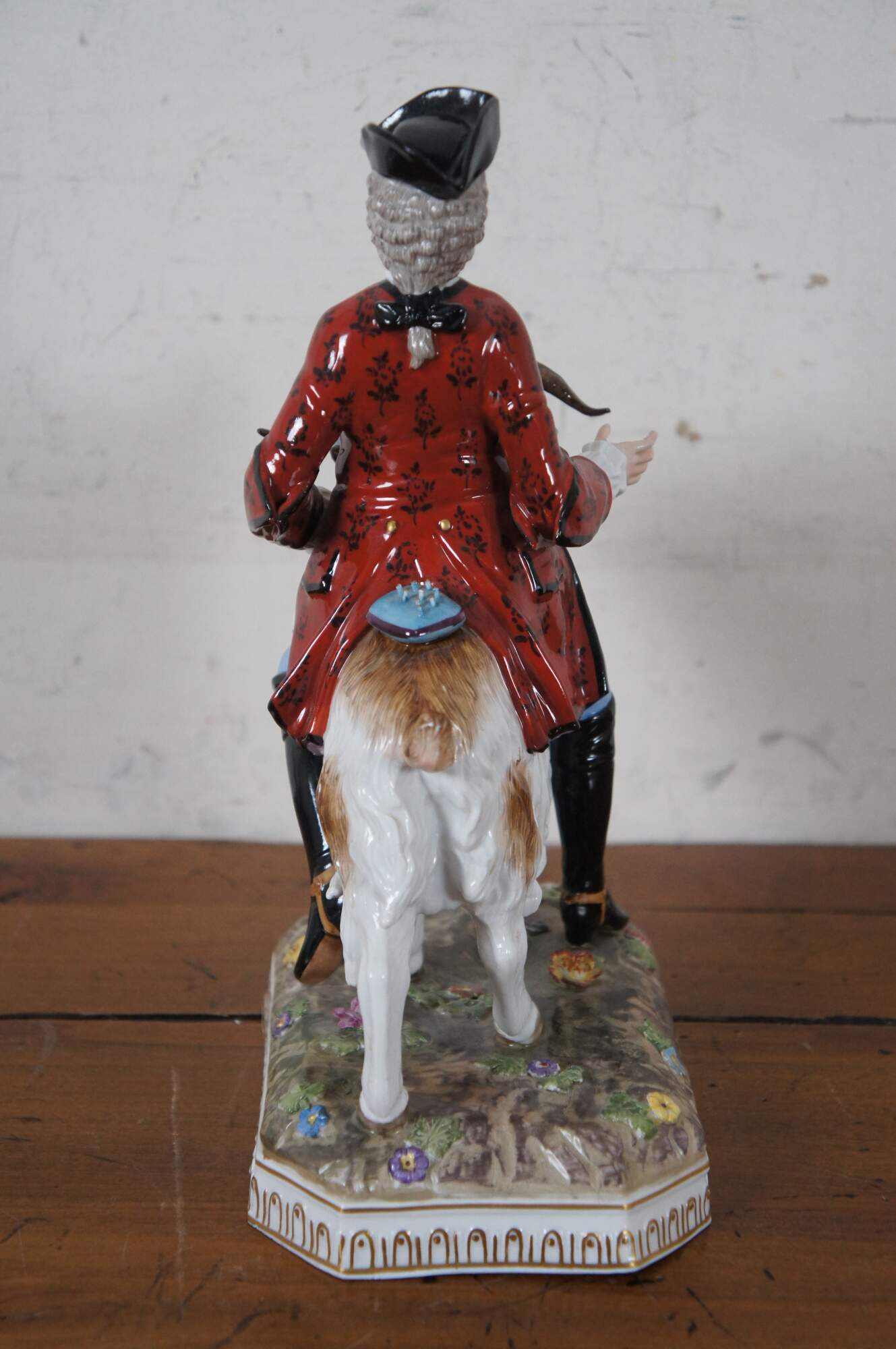 Antique 19th century Carl Thieme German Dresden porcelain polychrome figurine featuring Cout Bruhl's tailor (tailor of kings) on a goat. Modeled seated astride a billy-goat, the bewigged and bespectacled gentleman wearing a floral coat, boots and a tricorn hat, the tools of his trade all about him, including an iron and scissors hanging from the animal's horns and a pin-cushion on his rump.