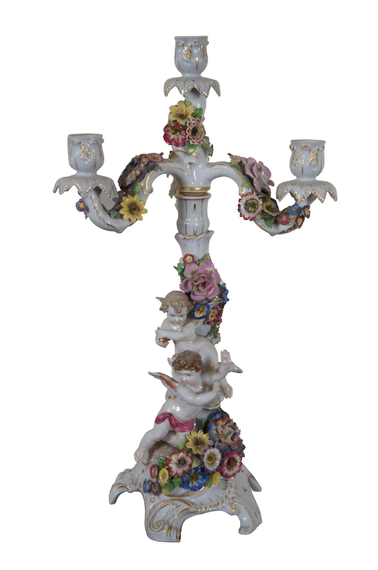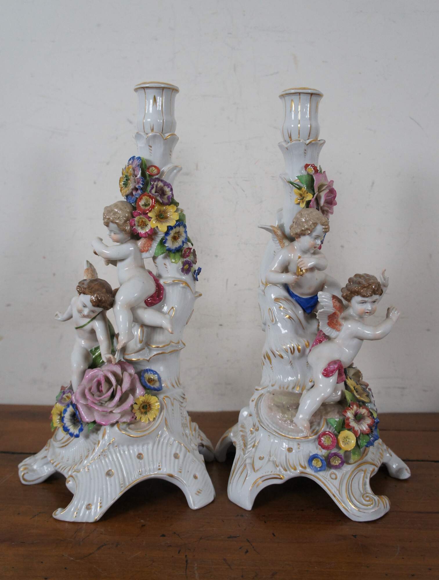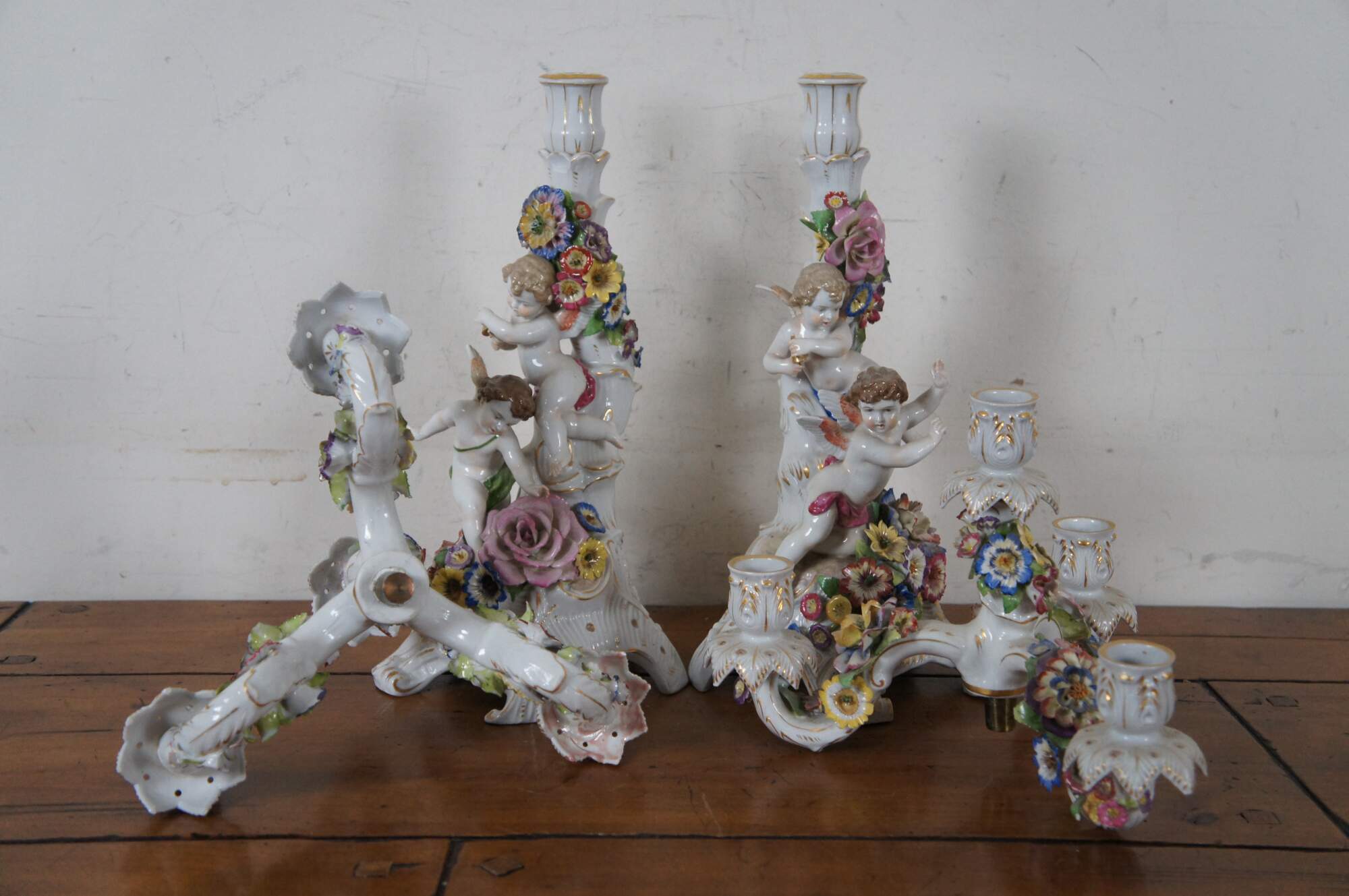 Exquisite pair of two antique German Dresden four light convertable candlesticks or candleabras by Von Schierholz porcelain factory featuring a colorful high relief cherubs / puttis / angels and floral theme.
