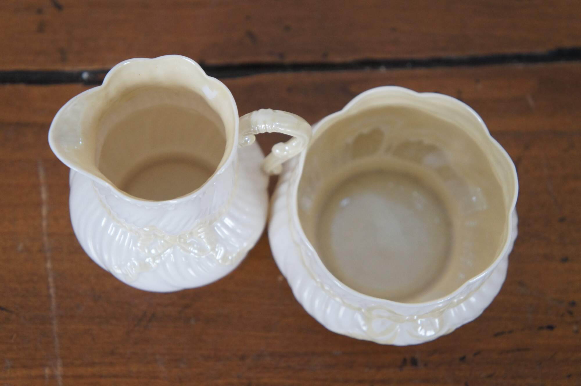 Vintage Belleek Irish porcelain creamer pitcher and suger bowl featuring a Neoclassical ribbon and bow deisgn, circa, 1940s - 1950s.