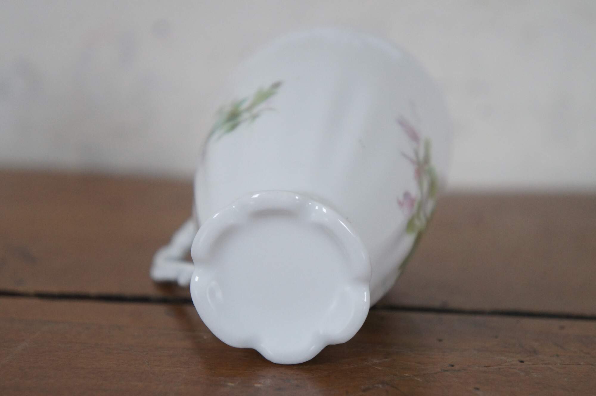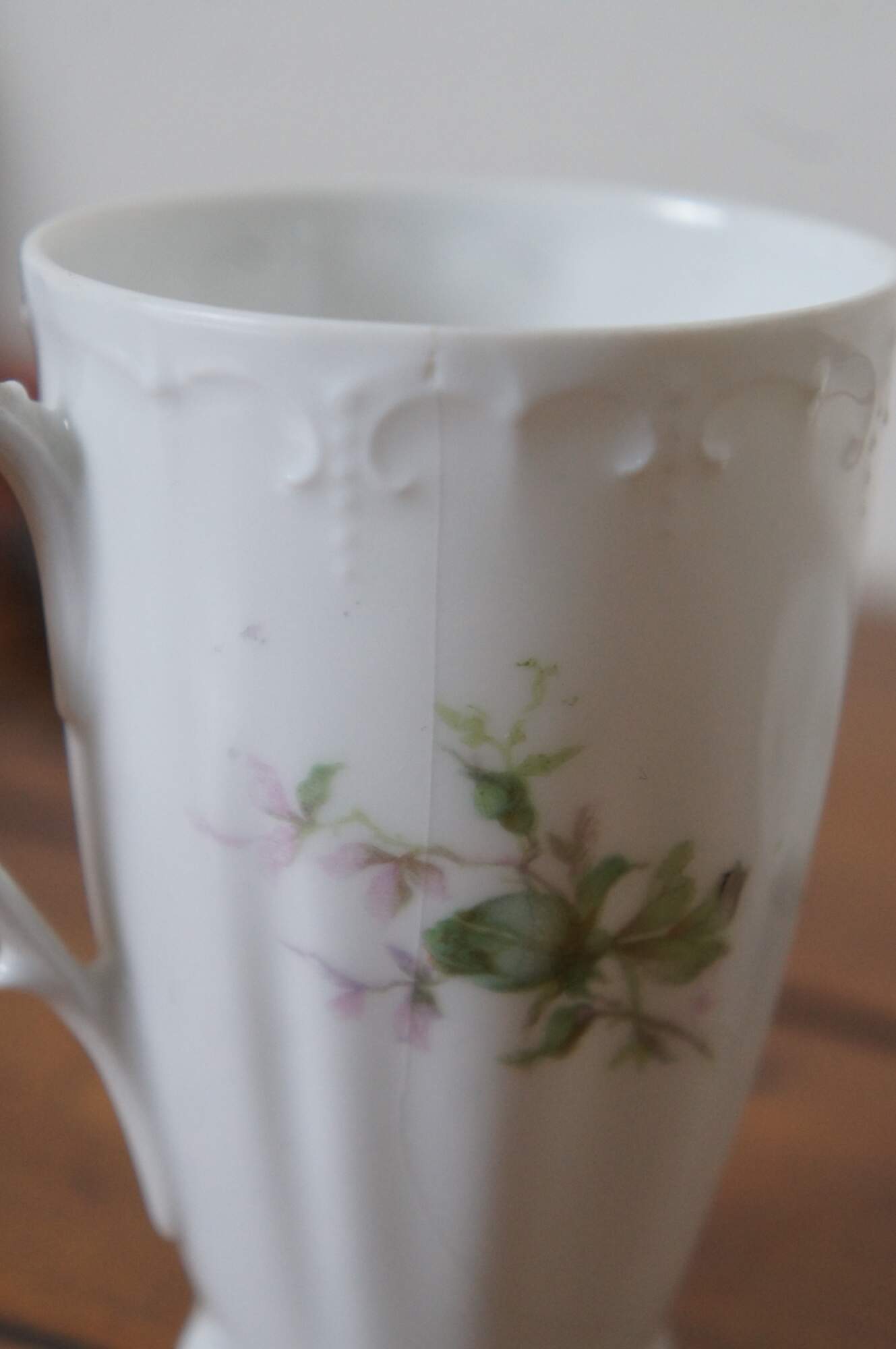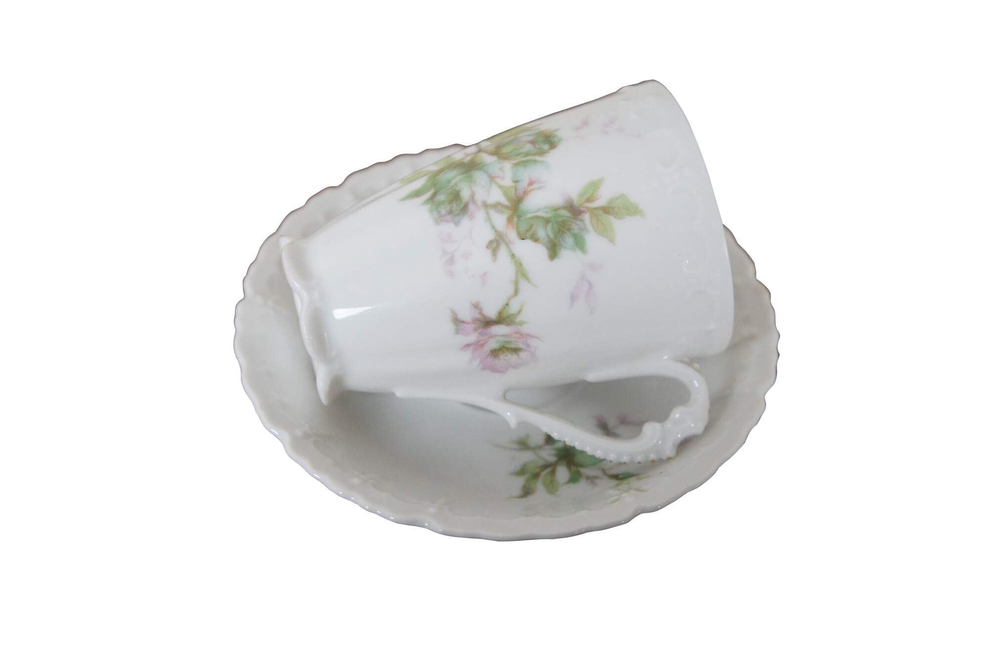 Vintage porcelain demitasse tea or coffee cup and saucer featuring a purple and green floral theme.