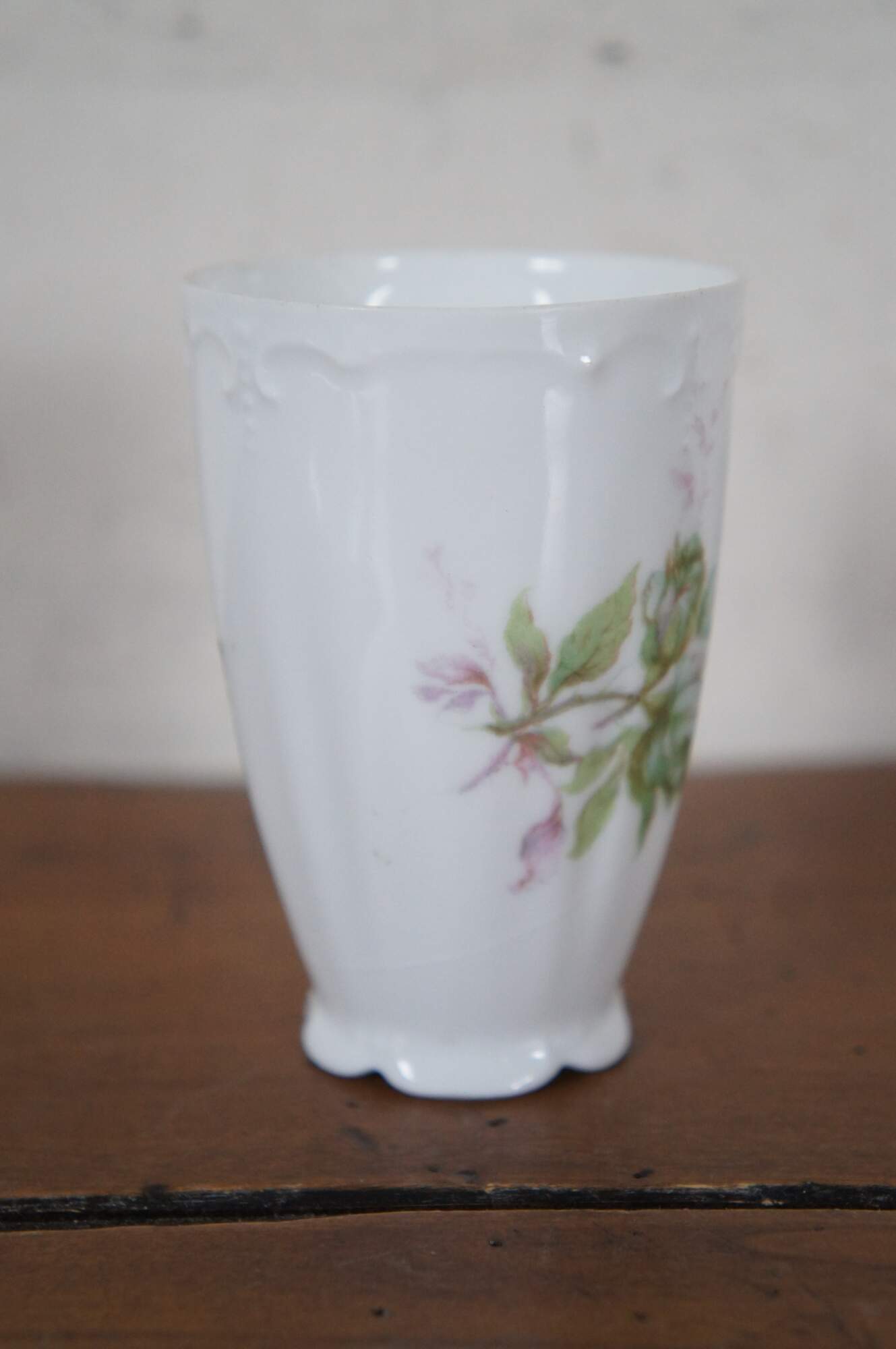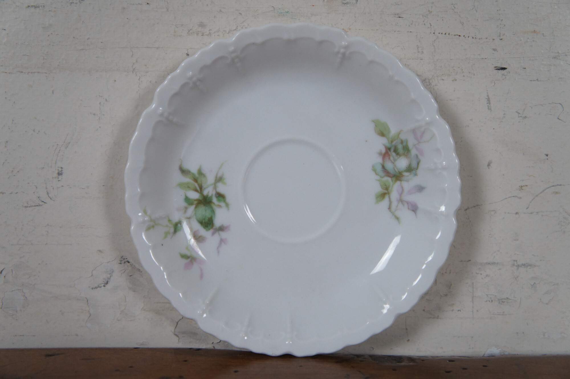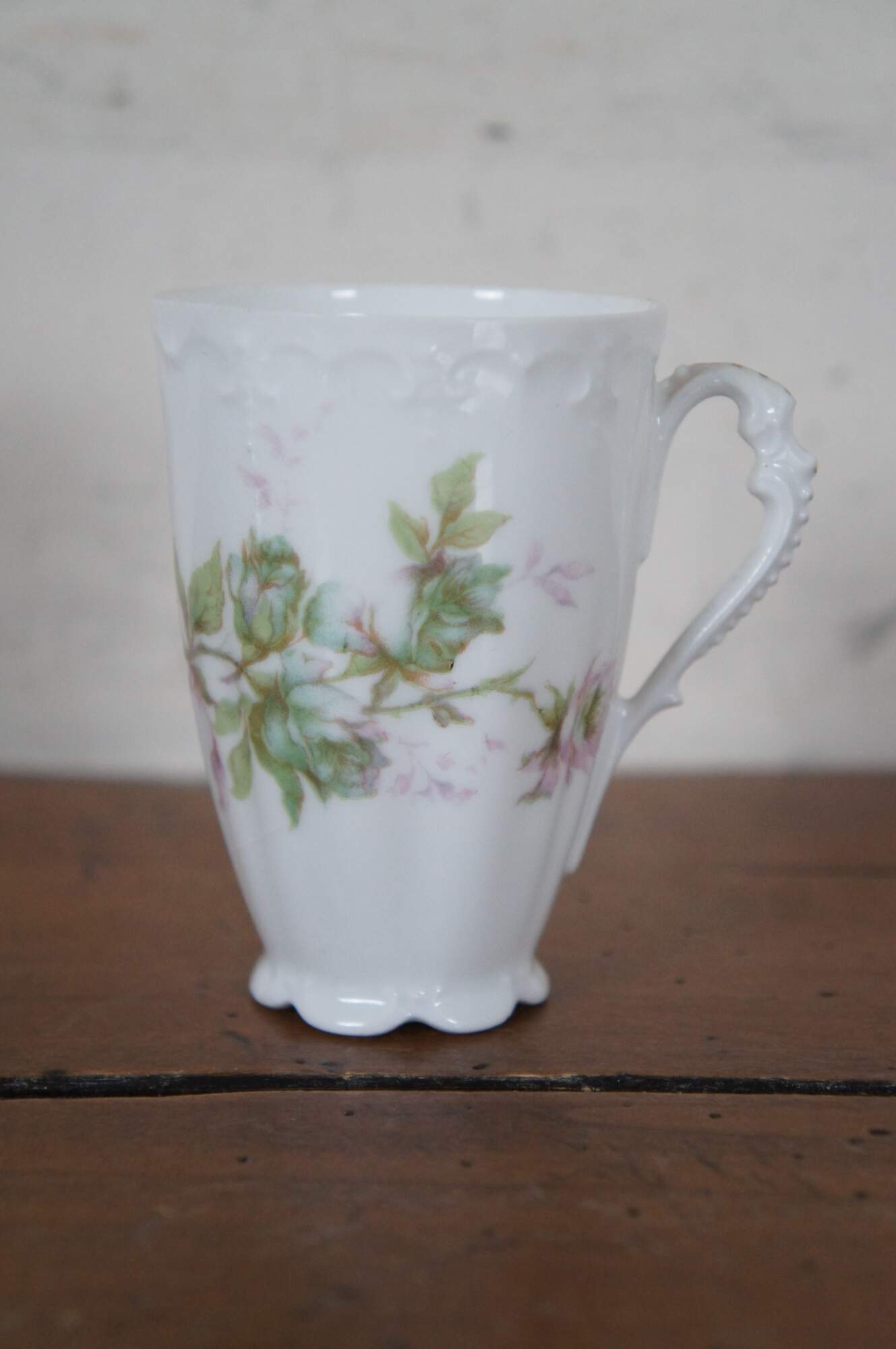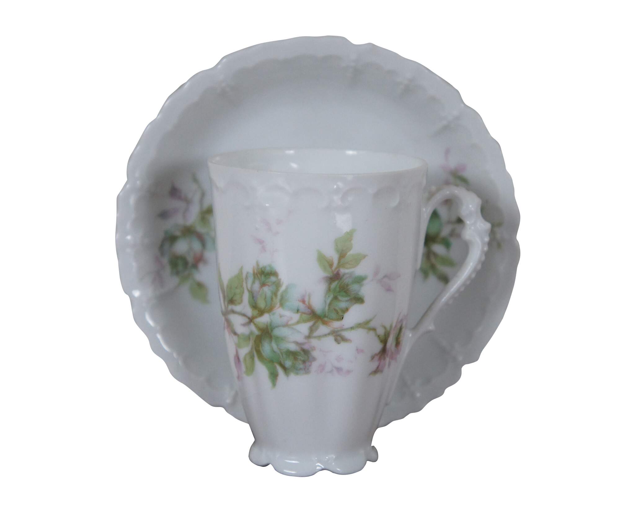 Vintage porcelain demitasse tea or coffee cup and saucer featuring a purple and green floral theme.