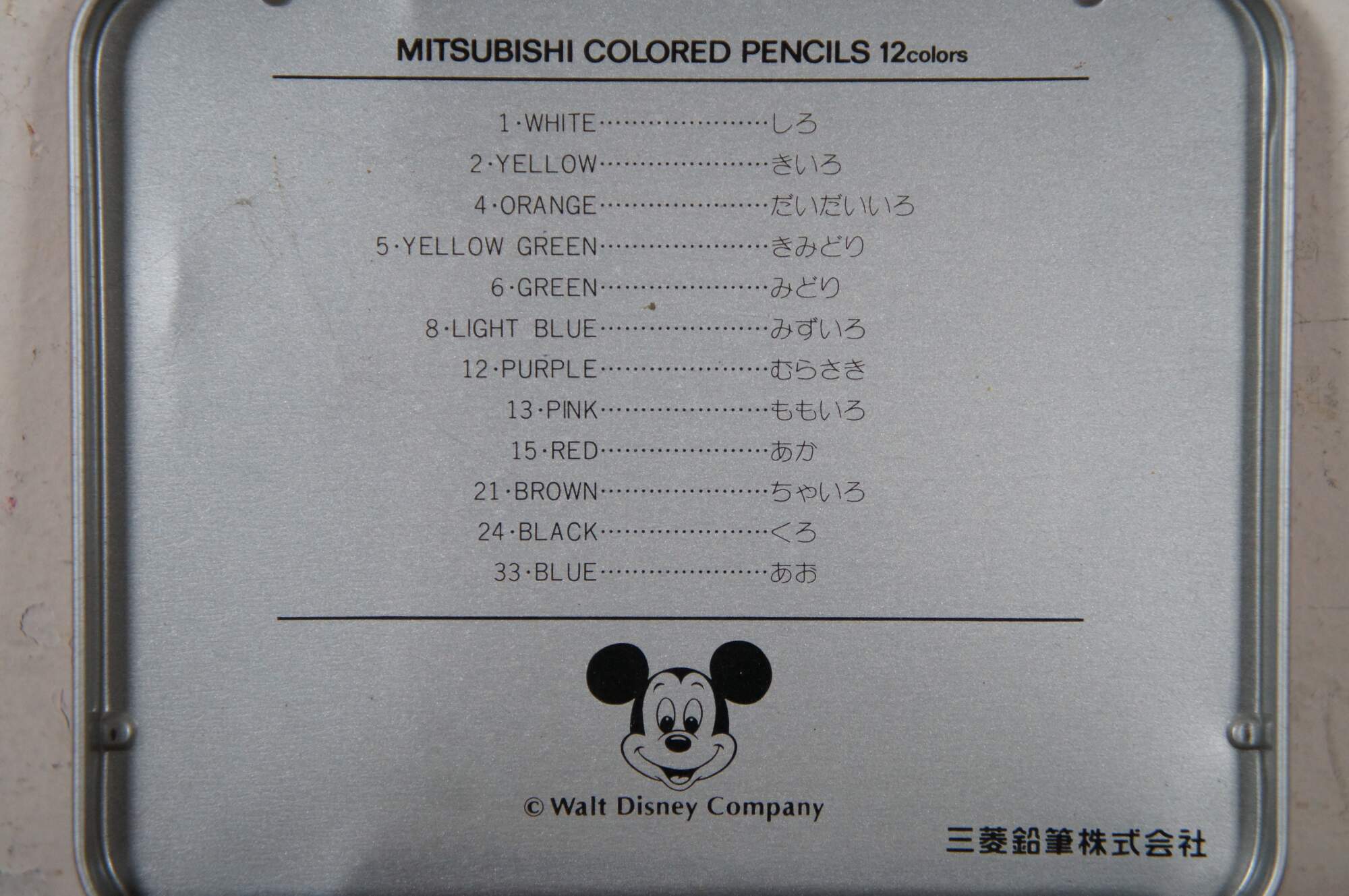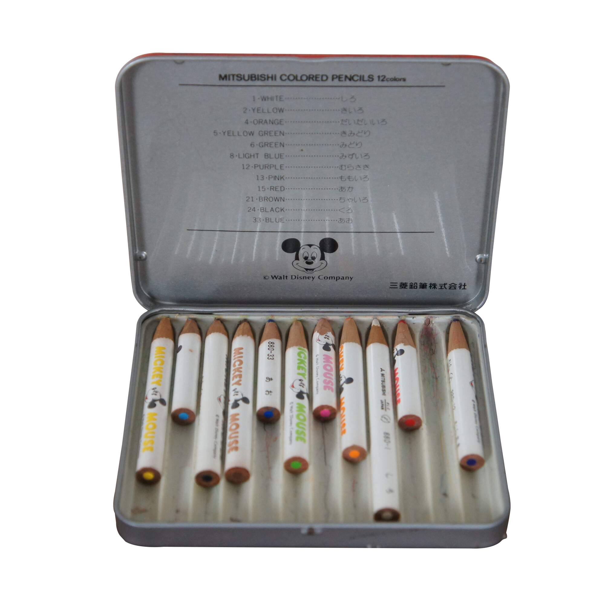 Vintage Mickey Mouse Mitsubishi Japan colored pencils in tin case / box. Walt Disney Company. No 880.