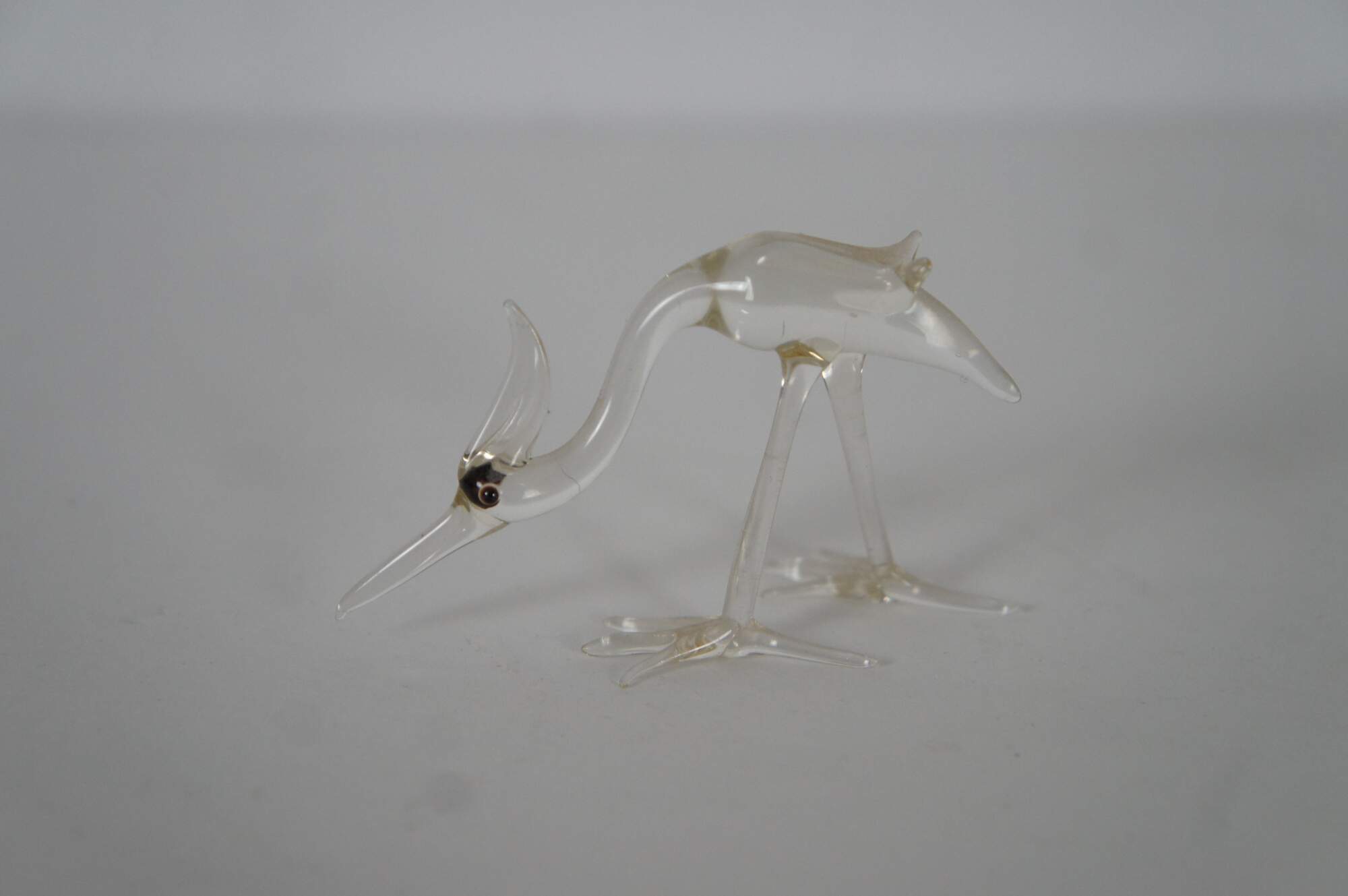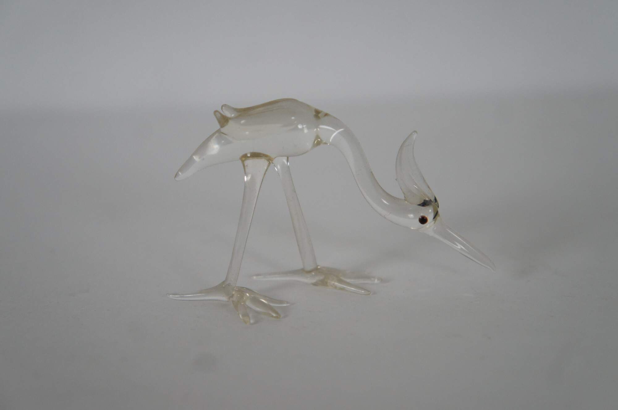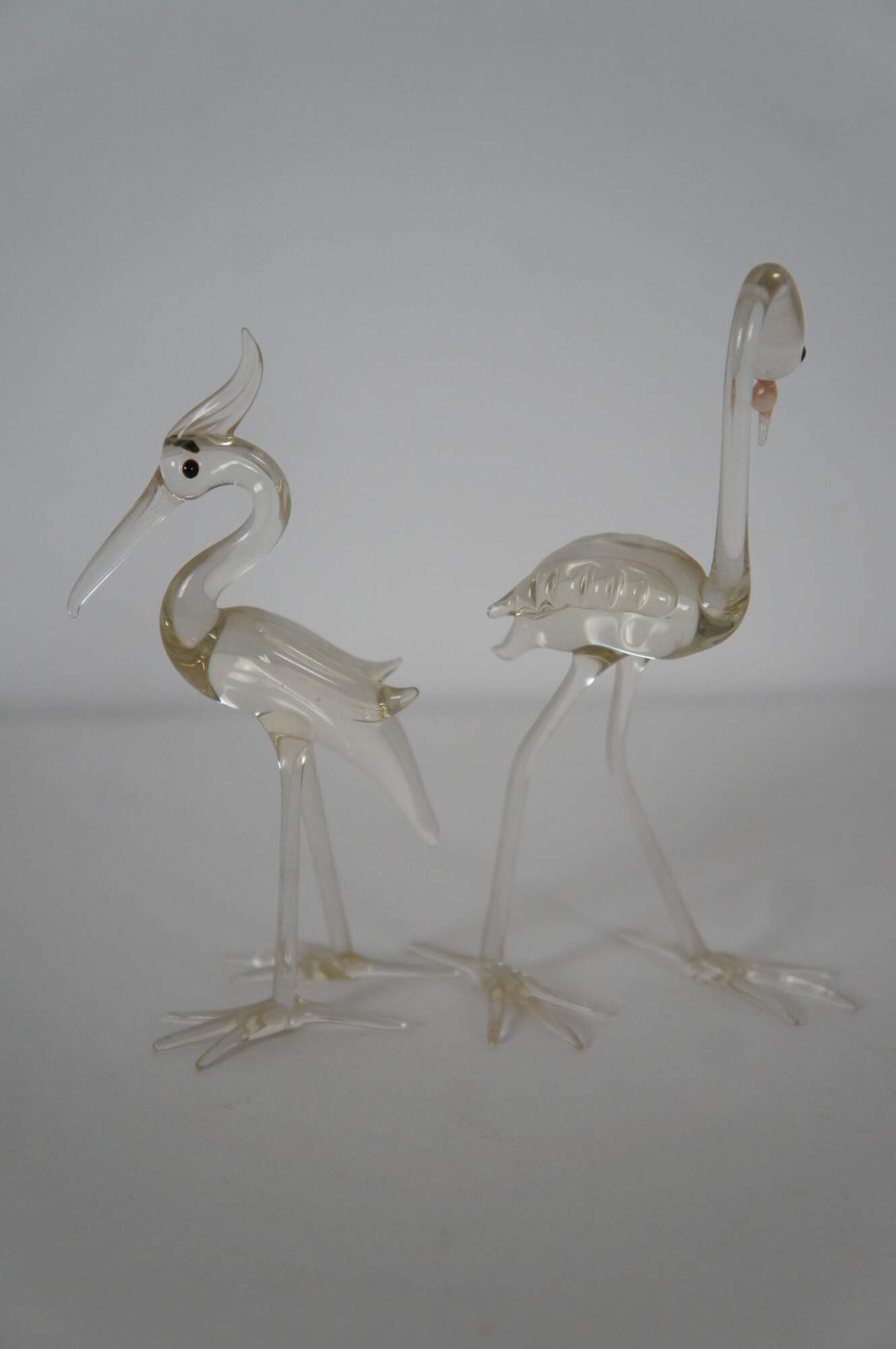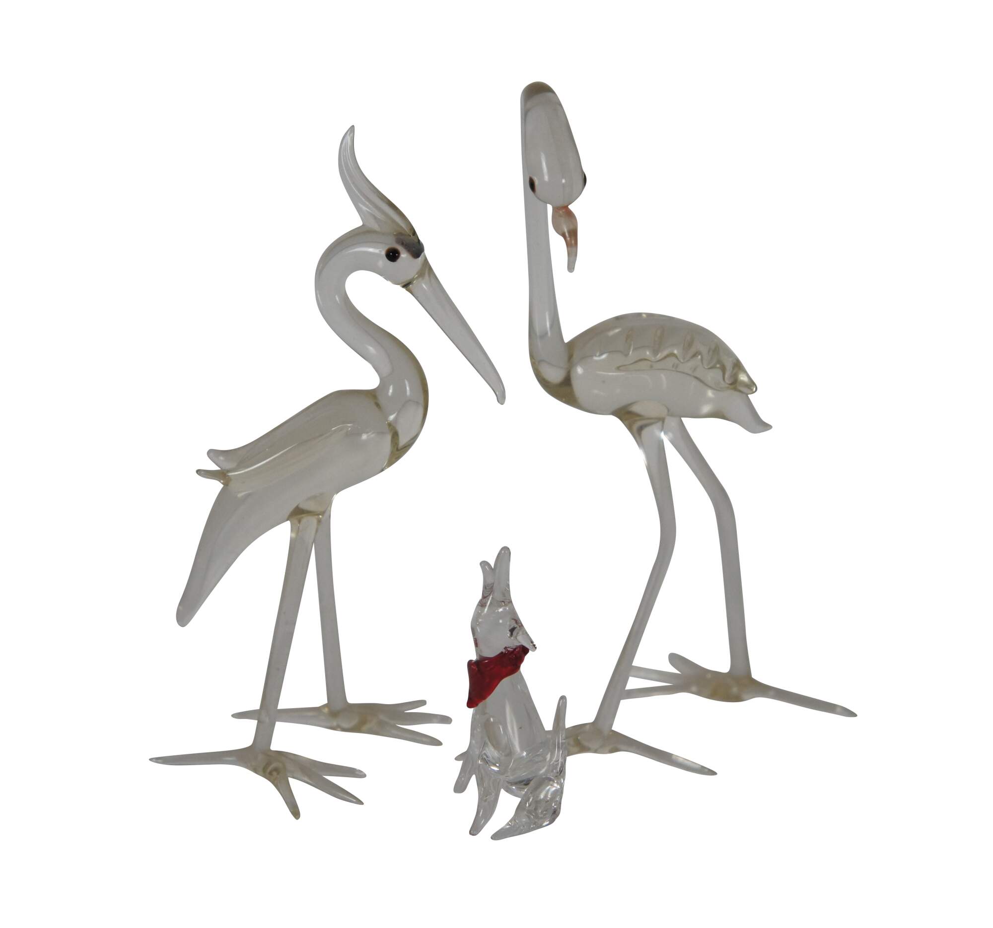Seven vintage hand blown animals. Made of clear art glass featuring six birds (stork, flamingo) and one howling dog or wolf. Murano or German.