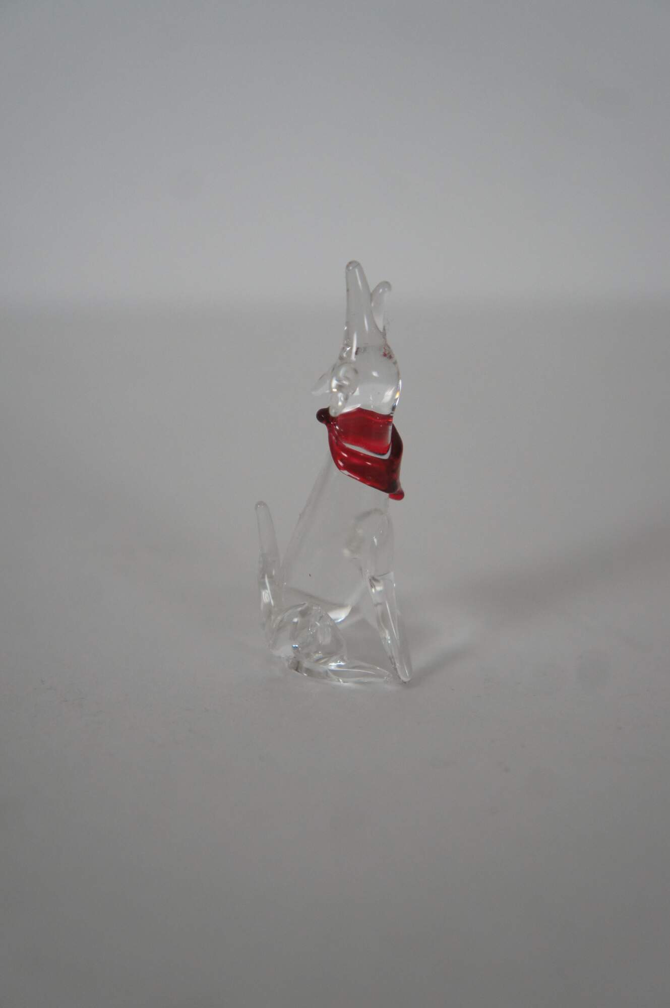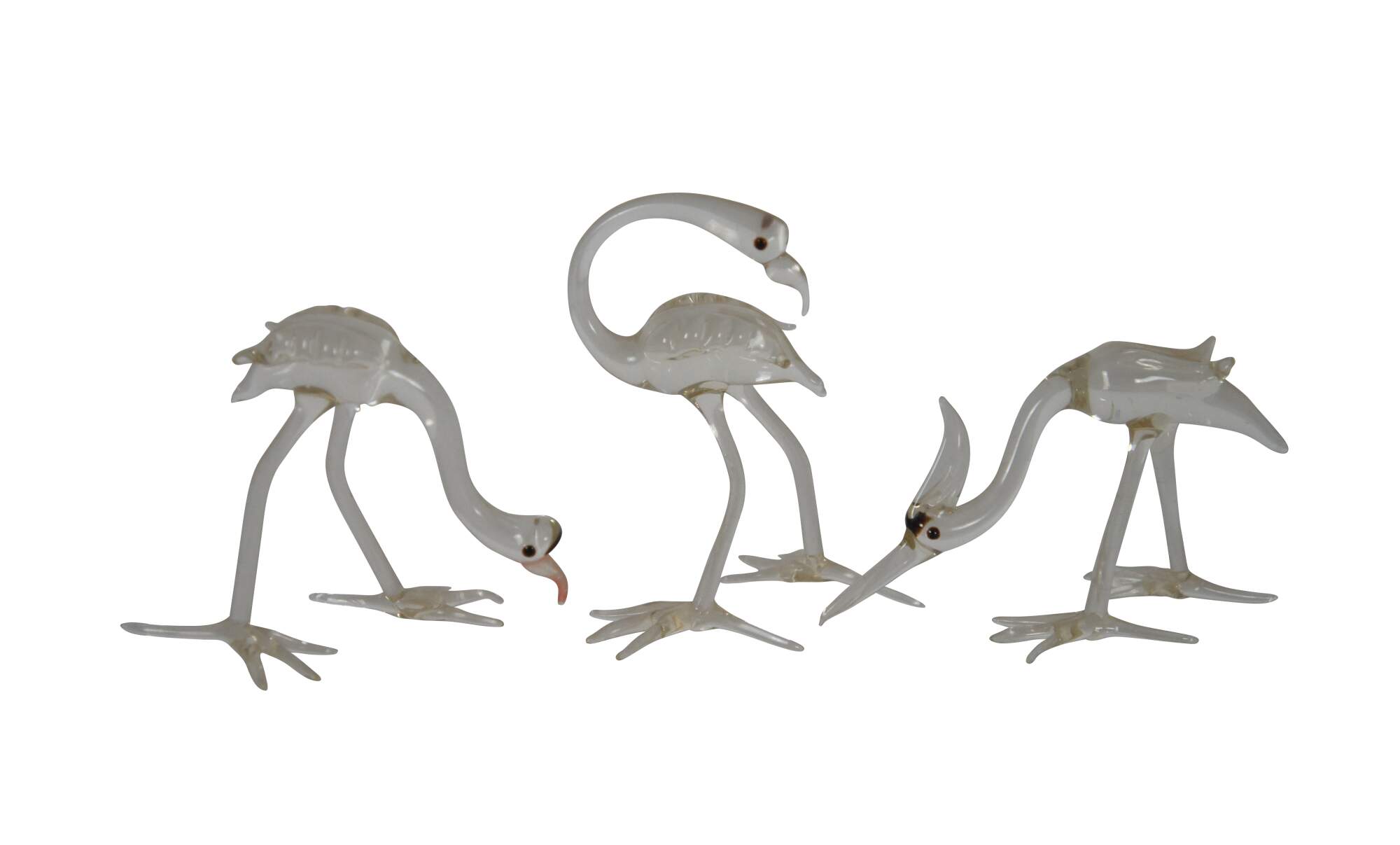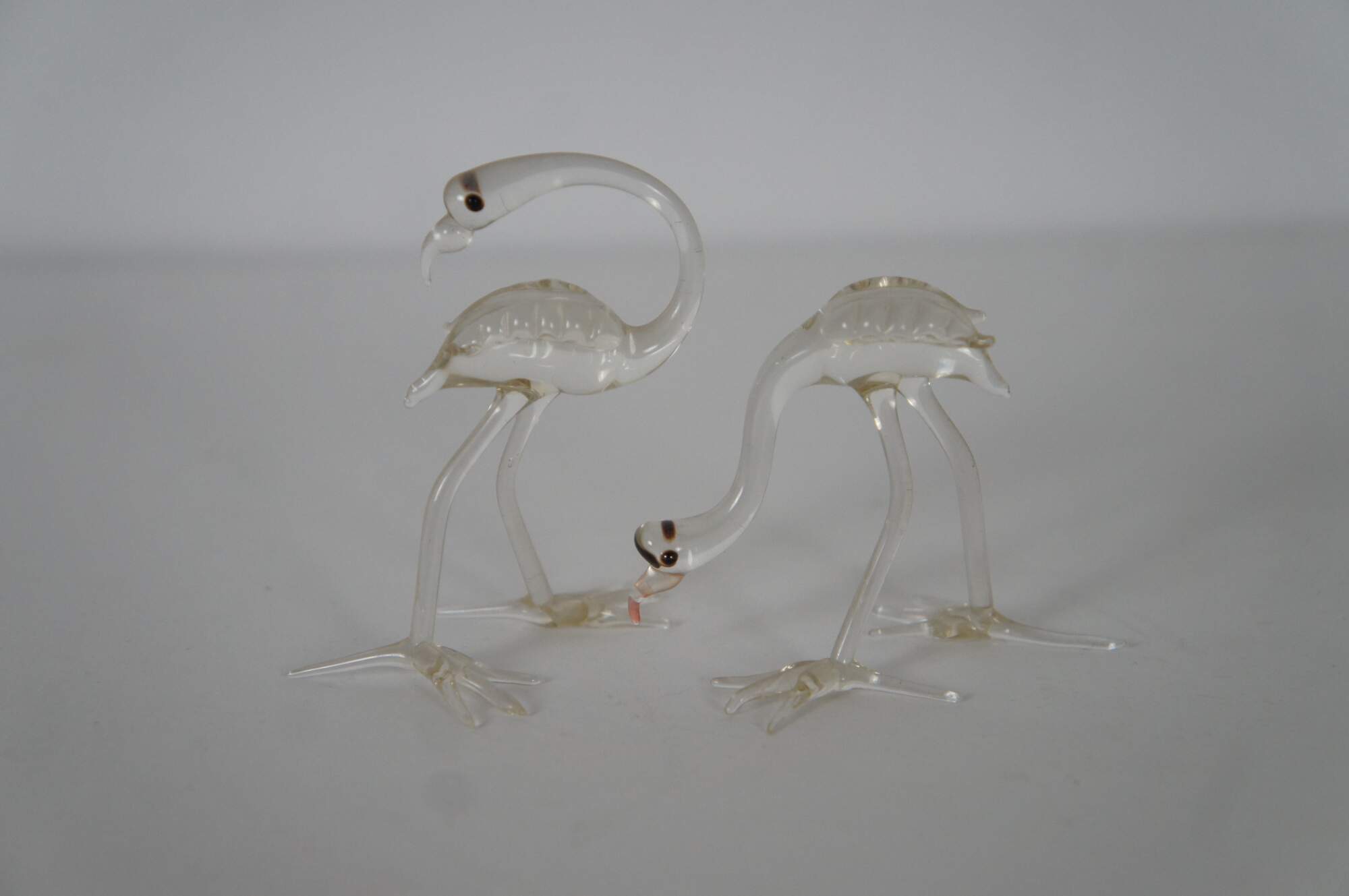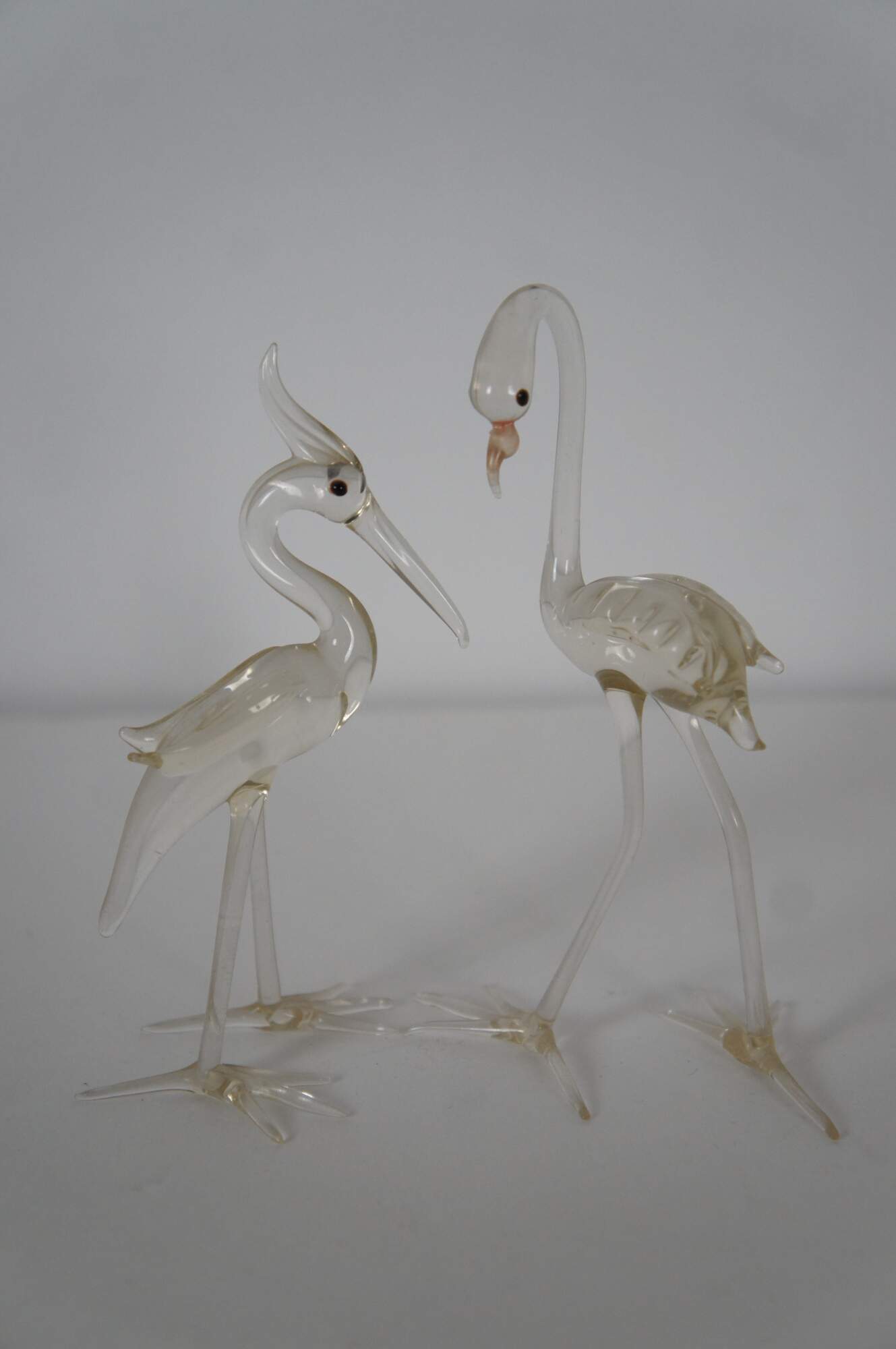 Seven vintage hand blown animals. Made of clear art glass featuring six birds (stork, flamingo) and one howling dog or wolf. Murano or German.