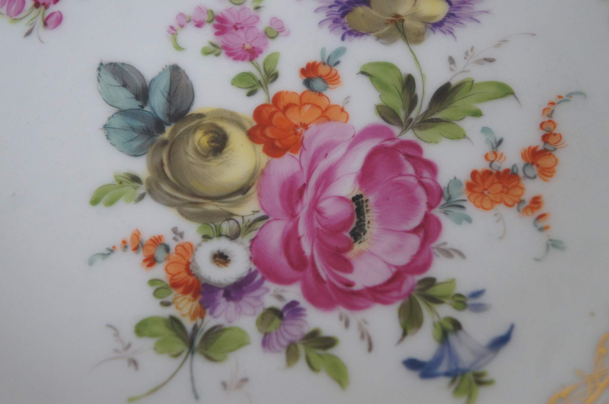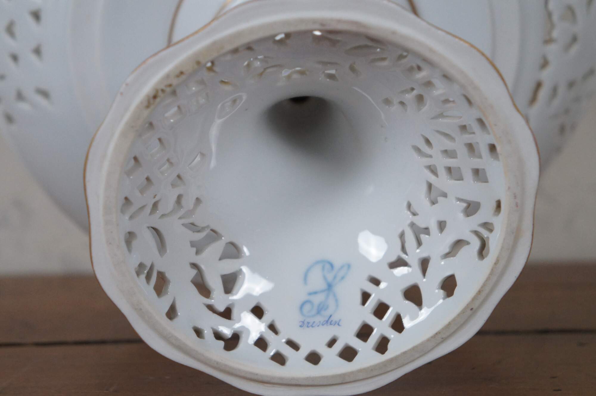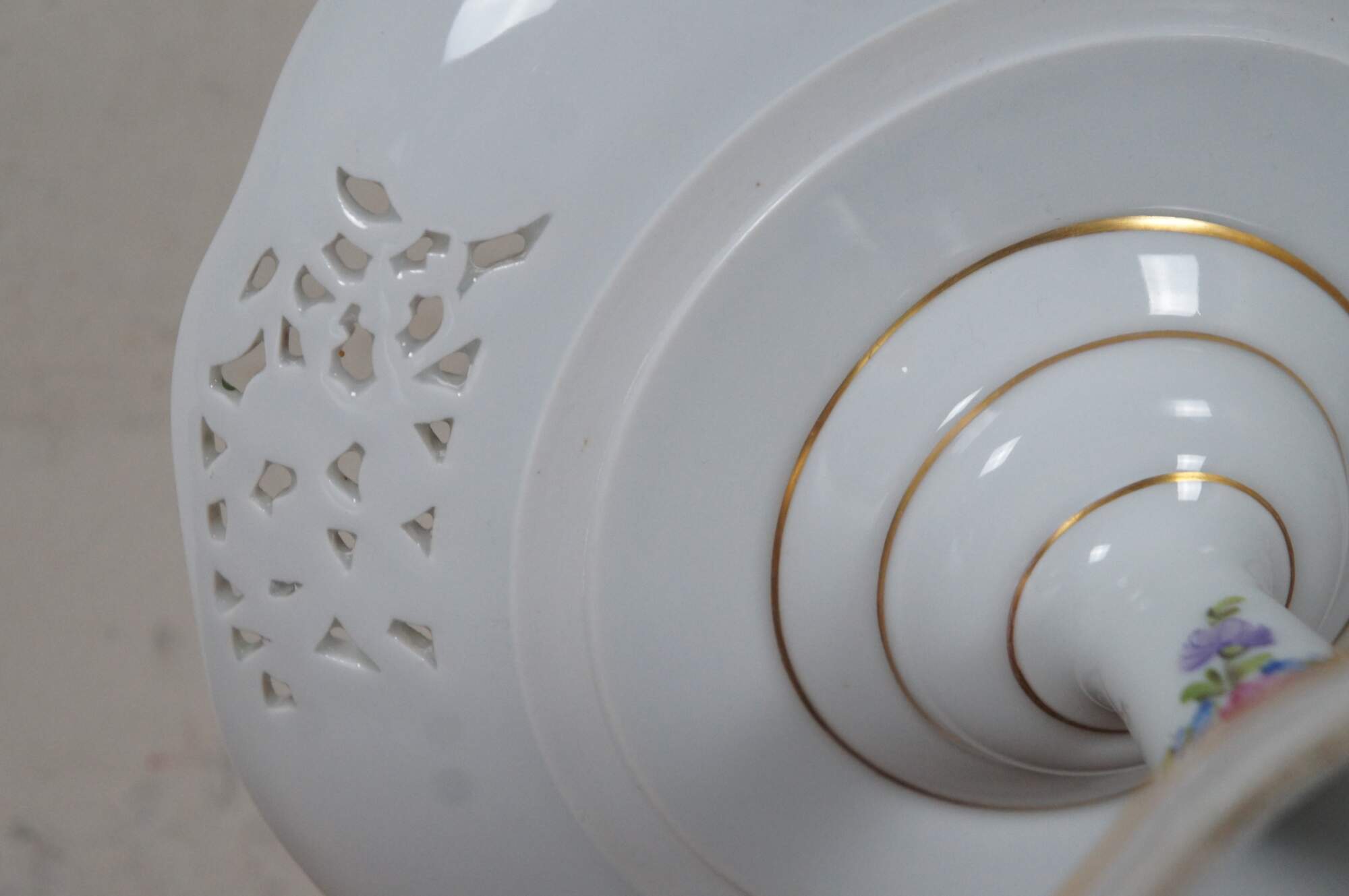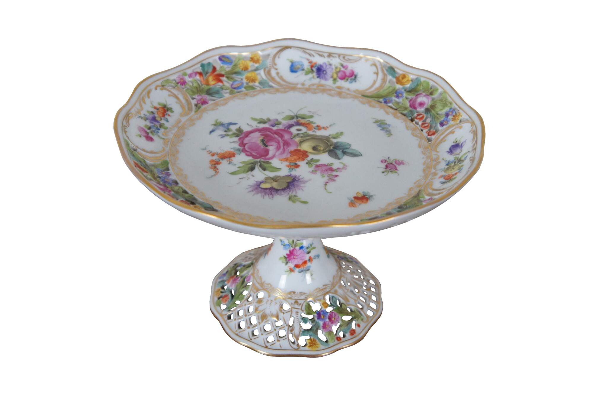 Antique Carl Thieme German Dresden centerpiece serving compote. Made of porcelain featuring footed pedestal base and reticulated / pierced scalloped shallow bowl or cake plate with floral design. Circa 1902-1920.