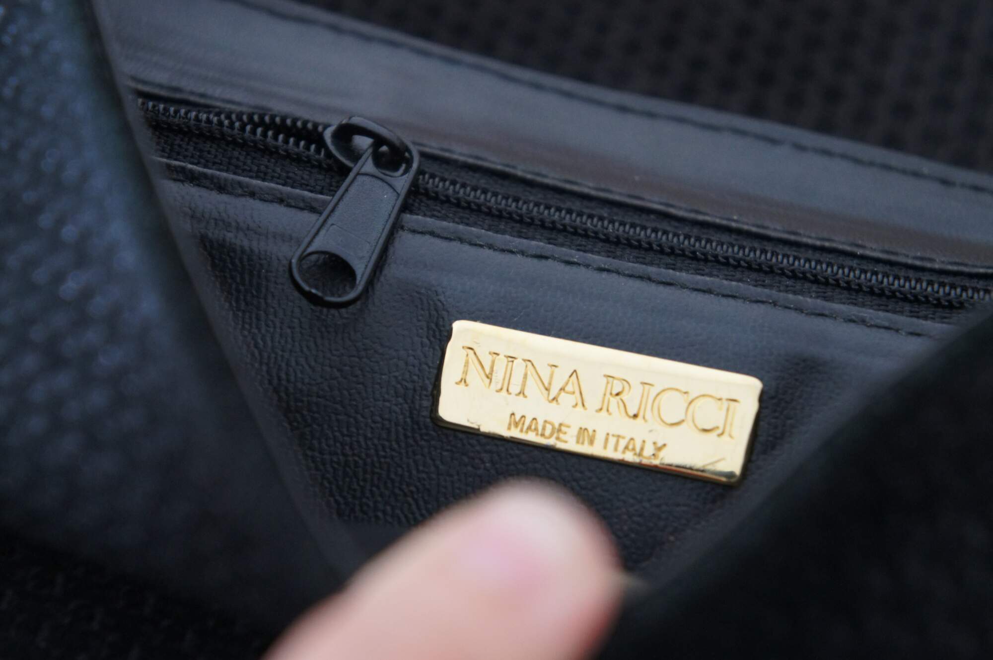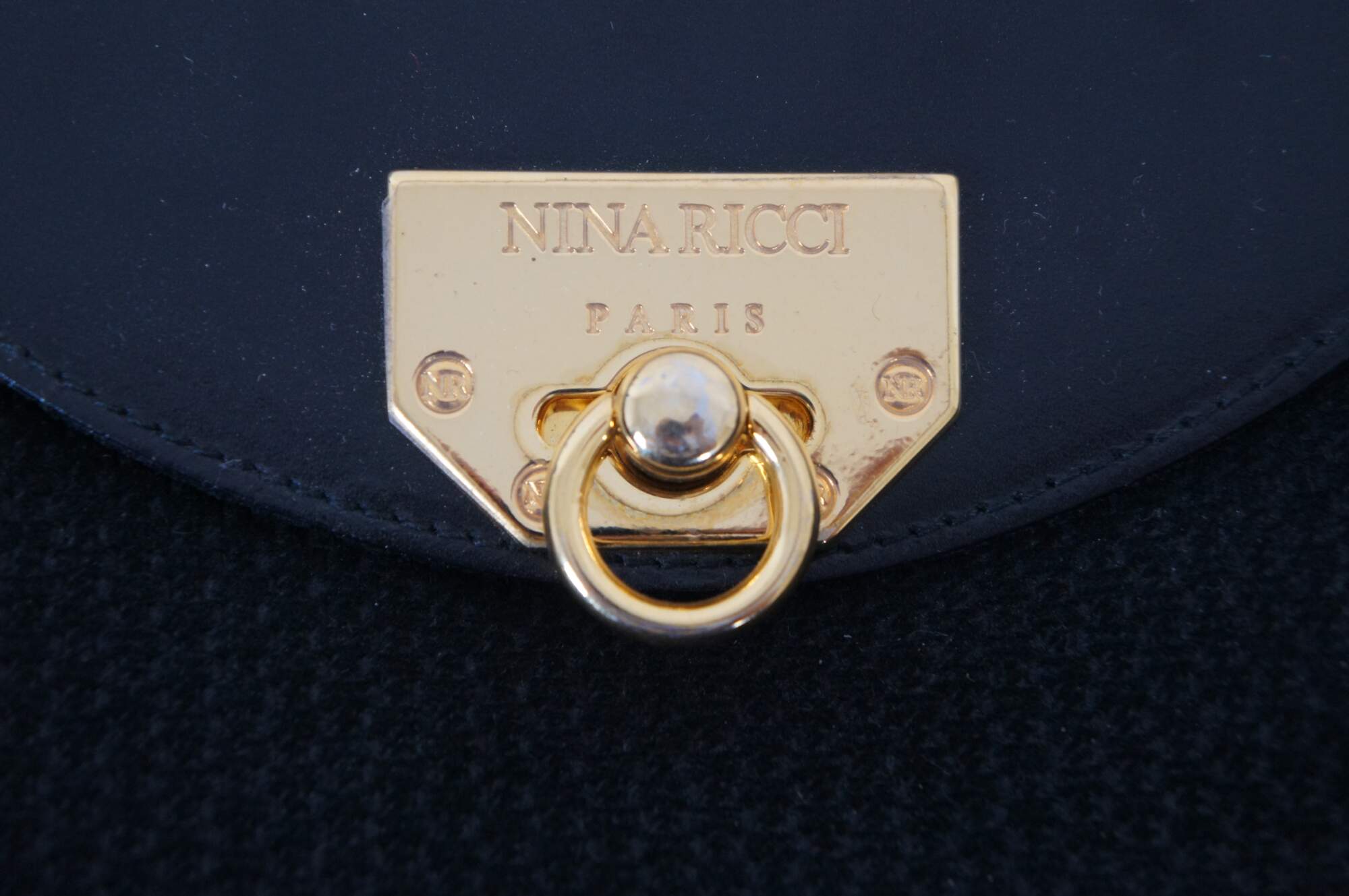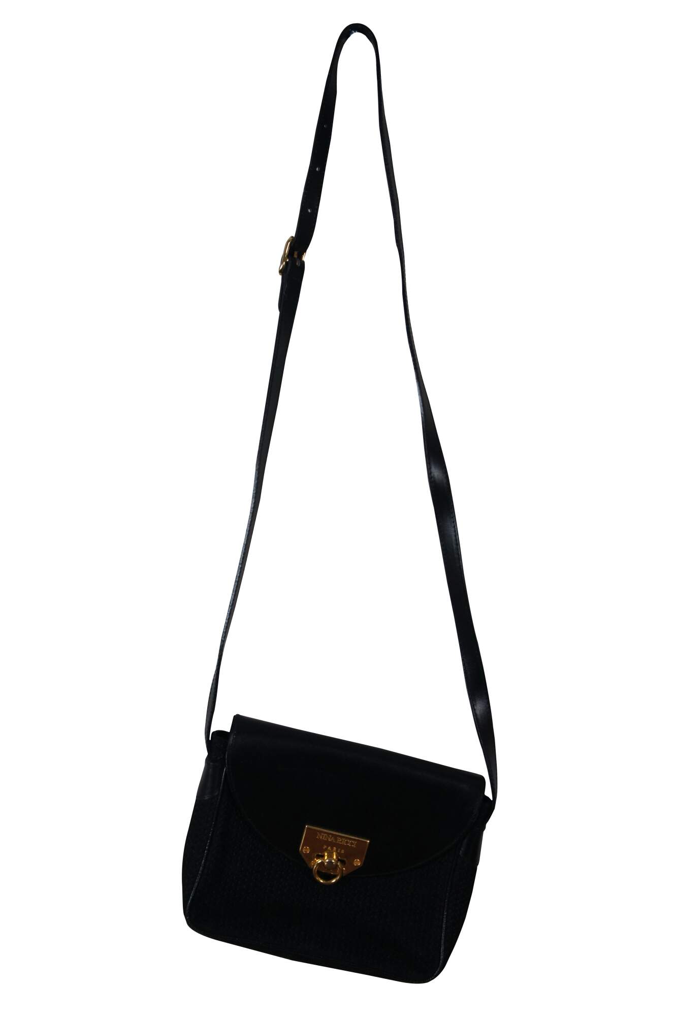 Vintage Nina Ricci black woven and leather flap closure hand / shoulder / crossbody bag featuring gold signature logo with ring. Made in Paris France.
