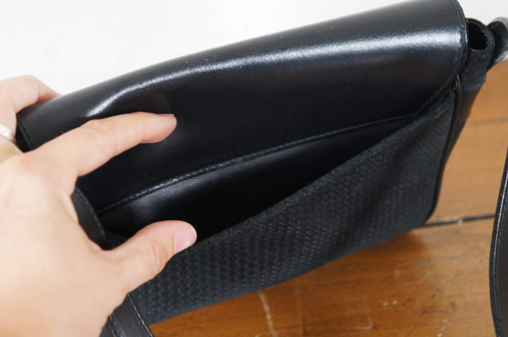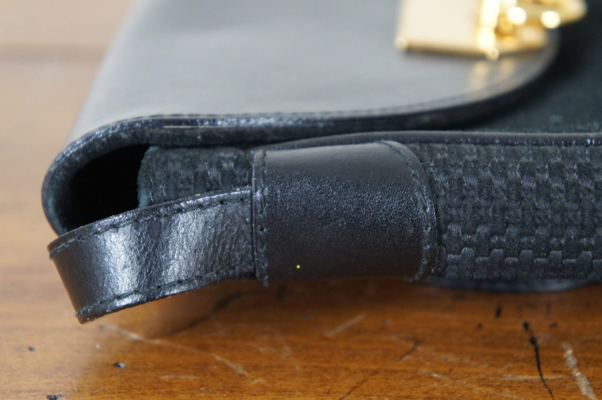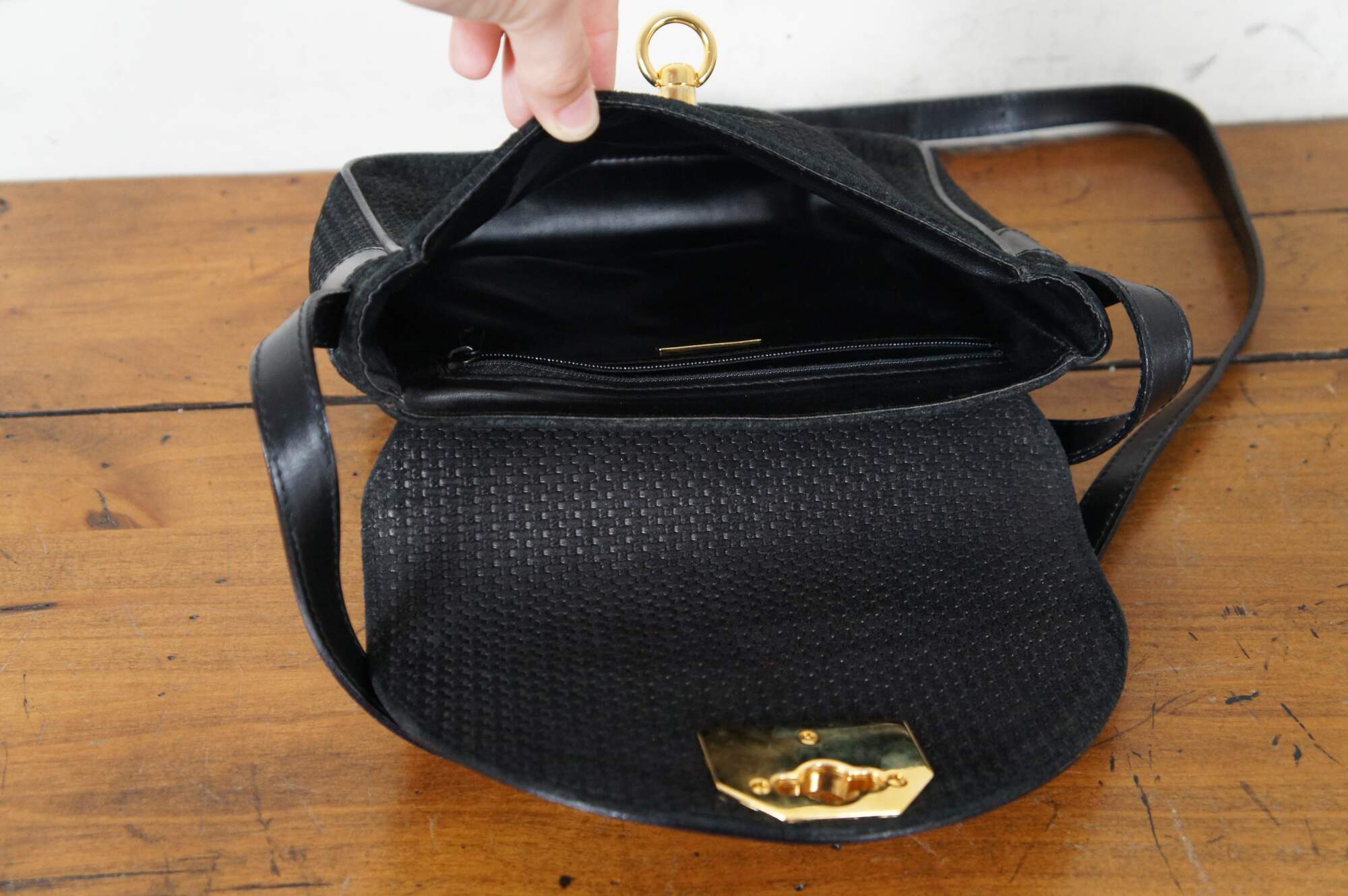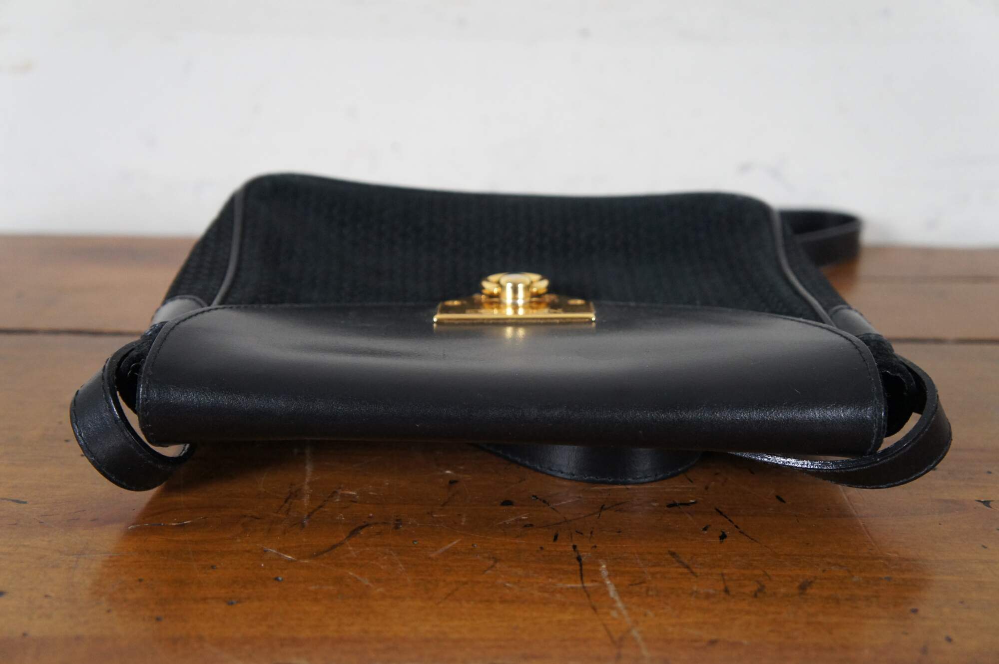 Vintage Nina Ricci black woven and leather flap closure hand / shoulder / crossbody bag featuring gold signature logo with ring. Made in Paris France.