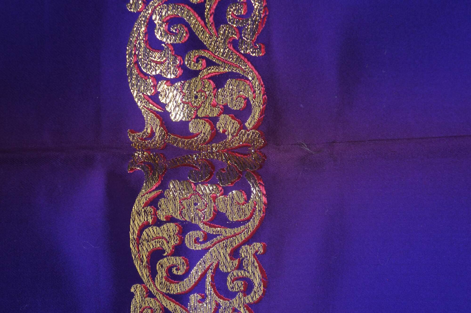 Two vintage Korean textile tapestries. Made of silk featuring metallic gold embroidery with medallions, peacocks and dragons. One purple, one green. Wall hanging. Tablecloth.